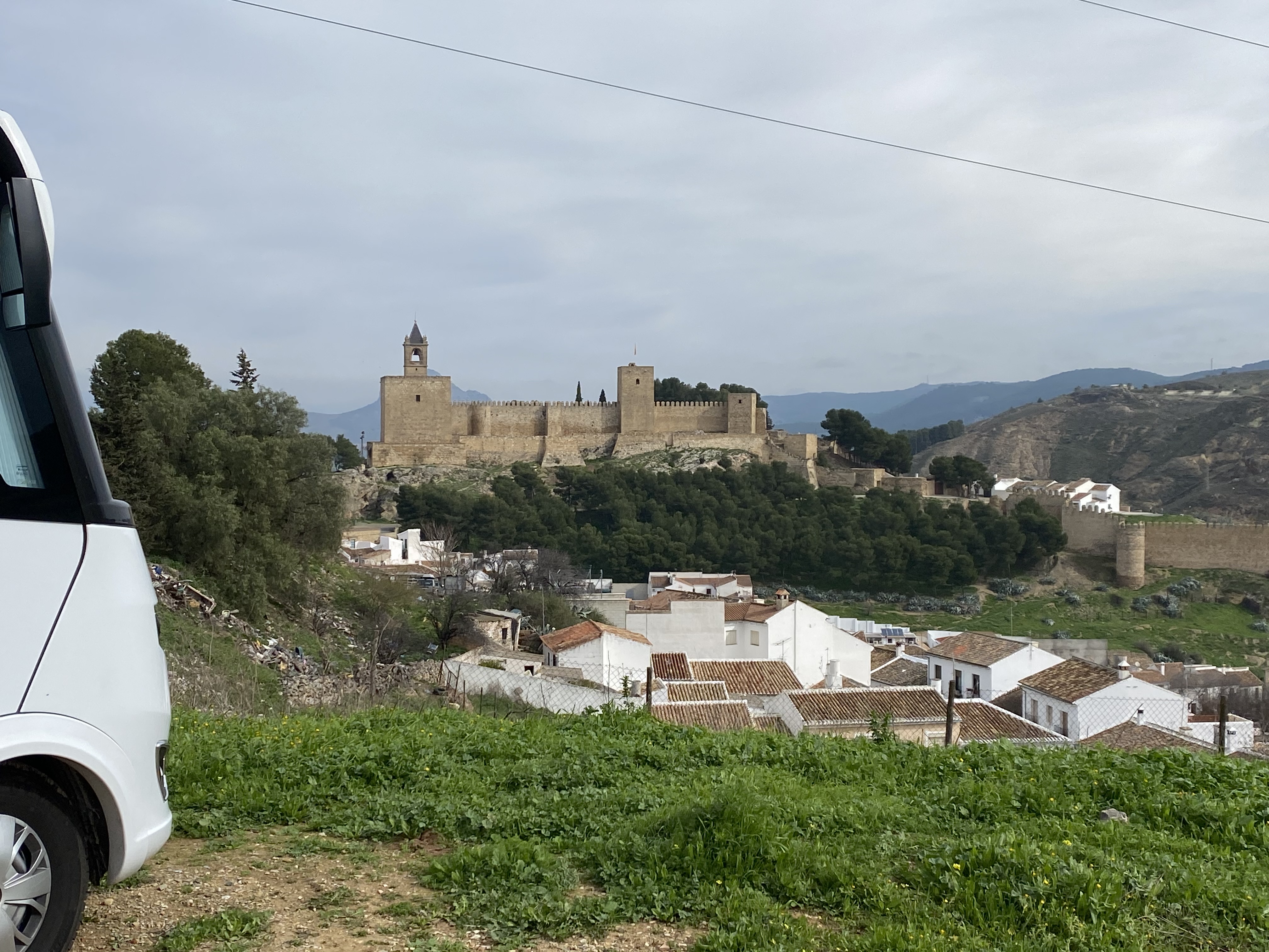 We took ourselves off in the direction of Antequera, nestled in the triangle of Seville, Granada and Malaga. It packs a big punch and there’s lots to see. Within the old town itself are numerous churches, palaces and convents, of different eras, one church seemed to have Jesus embedded in the wall (see pic). Shame as it was due to celebrate its 400 years in 2020, maybe they’ll celebrate its 401 year existence, especially after it had been all tidied up! Like Bilbao, Antequera seems to favour the ornate metal windowed balcony as part of its architectural style and there’s plenty of walking, admiring the place or coffees and lunch spots. There’s an incredibly intact Art Deco cinema. You’ll see that they take C19 very seriously in terms of mask wearing…. Antequera also, as if that wasn’t enough, has the Alcazaba magic carpet, kidding, its a Moorish fortress. It sits prominently across from our wild camp spot.