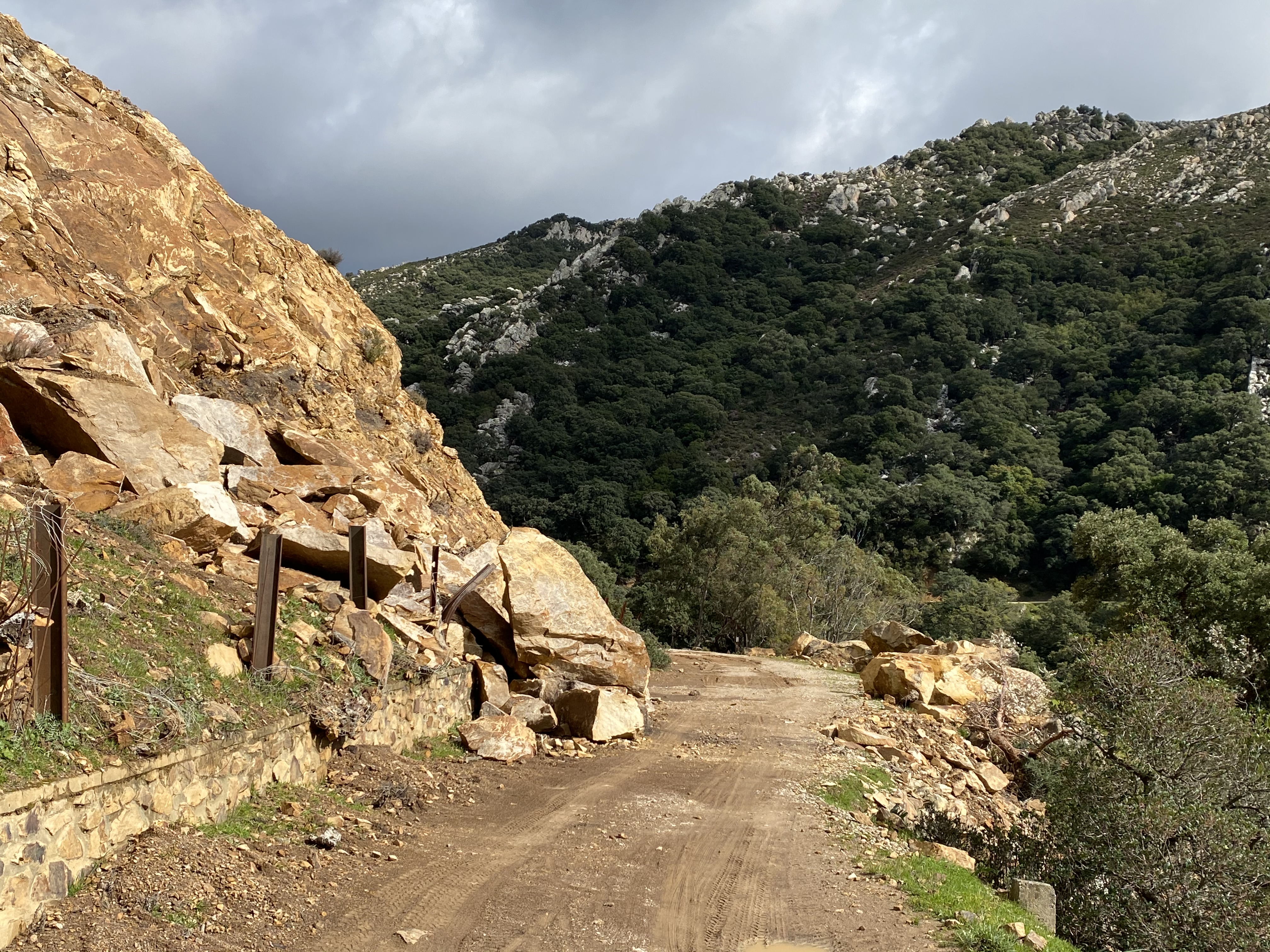 Camino de la Pista looks very different after some rainfall, such was the terrain that I thought it needed to drop a couple of its letters. We wanted to do a ride known as the 7 valleys which involves heading inland from La Pena and through the valleys behind Tarfia and out towards Algeciras, returning via a coastal track through Tarifa. We wondered at times if we’d been a bit too ambitious. The photos show the mud involved on the Camino which deposited itself all over our clothes and faces for the rest of the day. It was however a great ride, again hardly anyone around, lots of big views, more cork tree’s without their trousers on, waterfalls, serious rock falls and a sheep that took an interest in Nicks feet. Mid afternoon we thankfully found a cafe which overlooked the straight to Tangiers and Morocco, it looked so close!