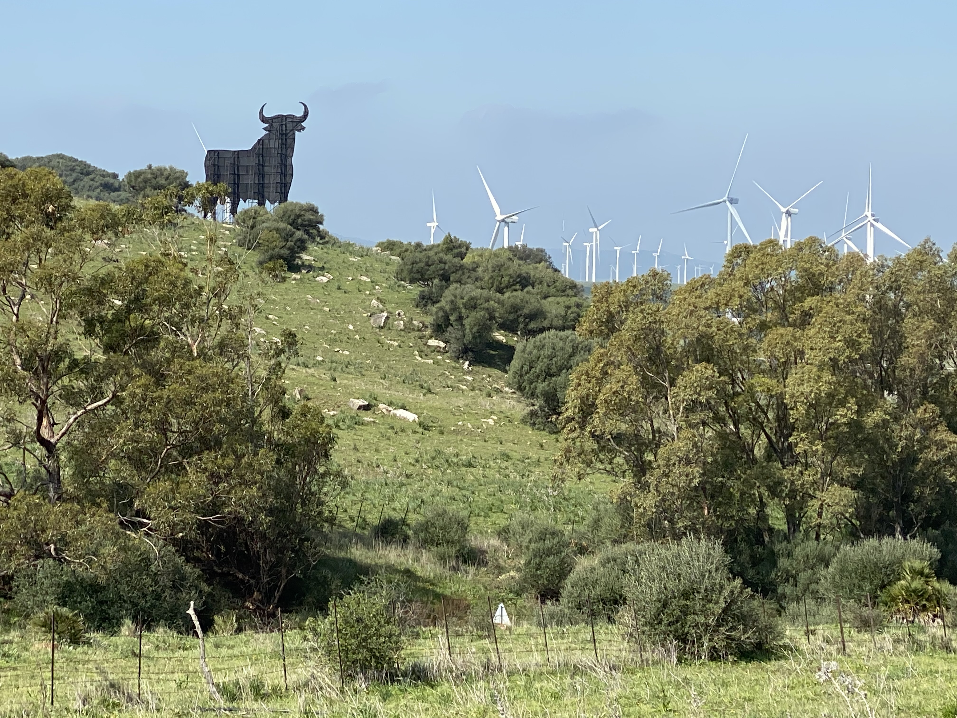 Our next ride out was a Komoot one (a cycle route app that’s frankly rubbish!) and yes, we found ourselves at a locked gate to…. So resorting to google we meandered along and found ourselves in a lovely town called Facinas, up in the hills behind Bolonia. We were a tad intimidated by the giant man and the bull at the roadside but we persevered, and didn’t look either in the eye.
