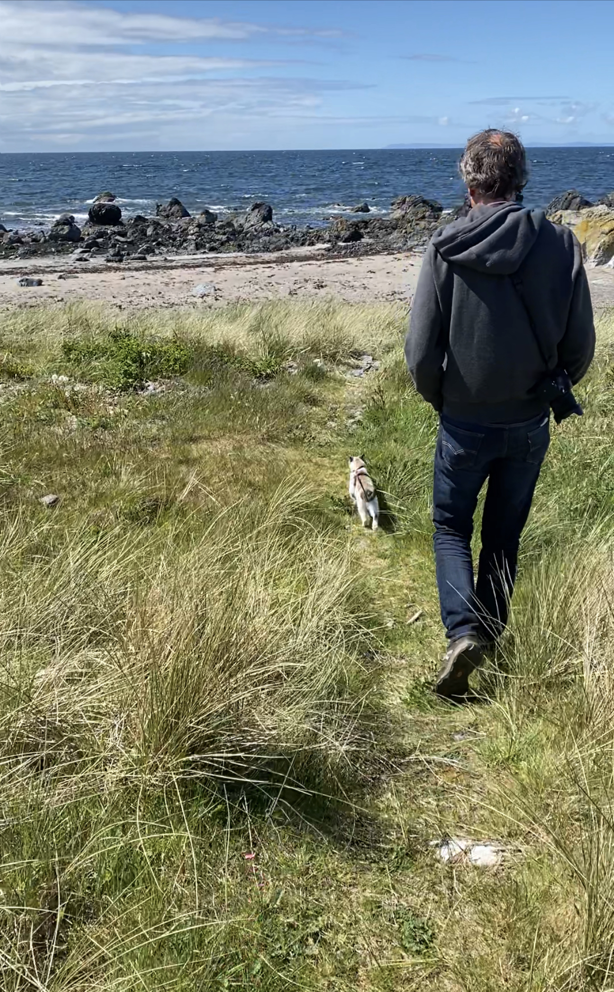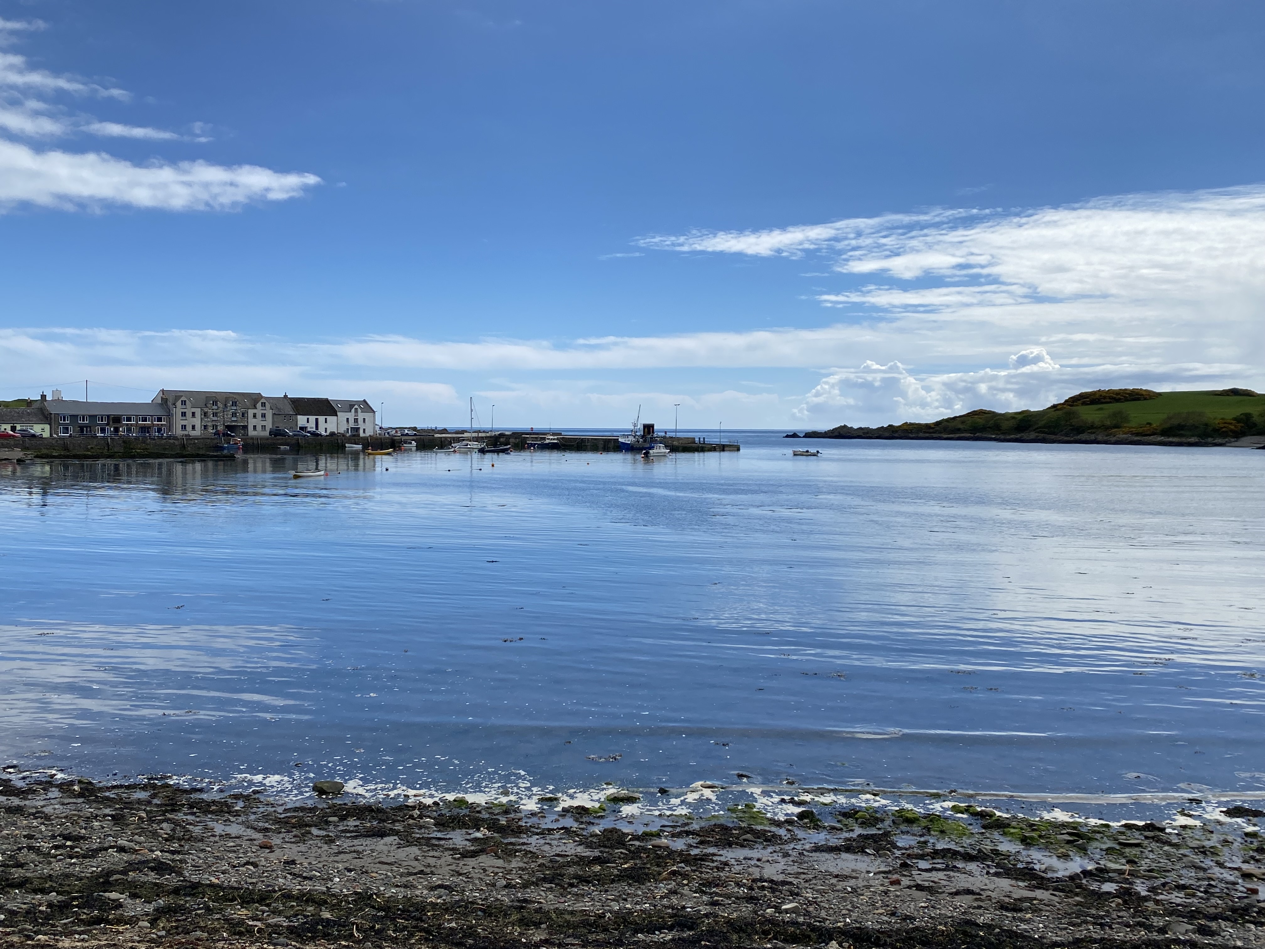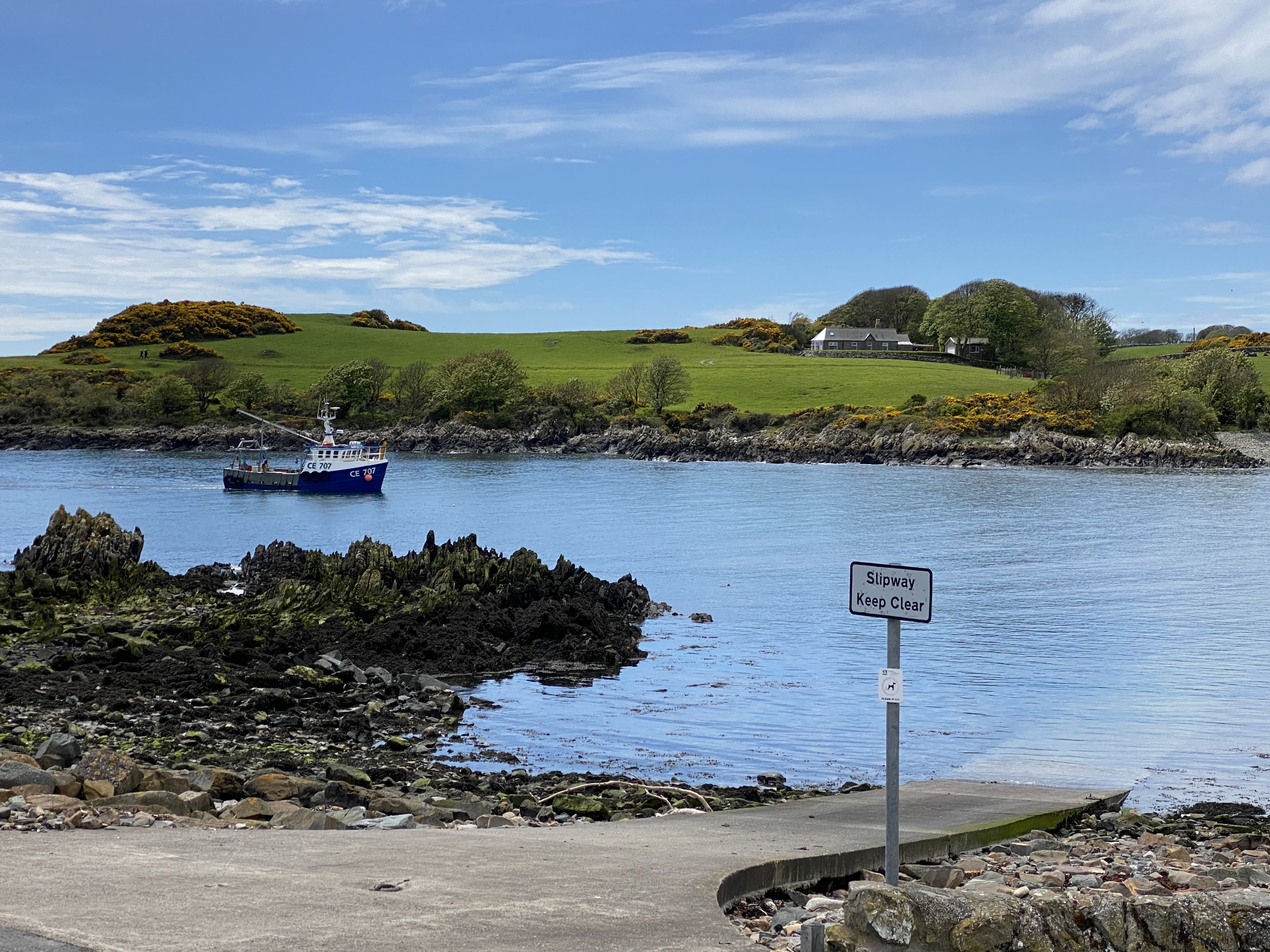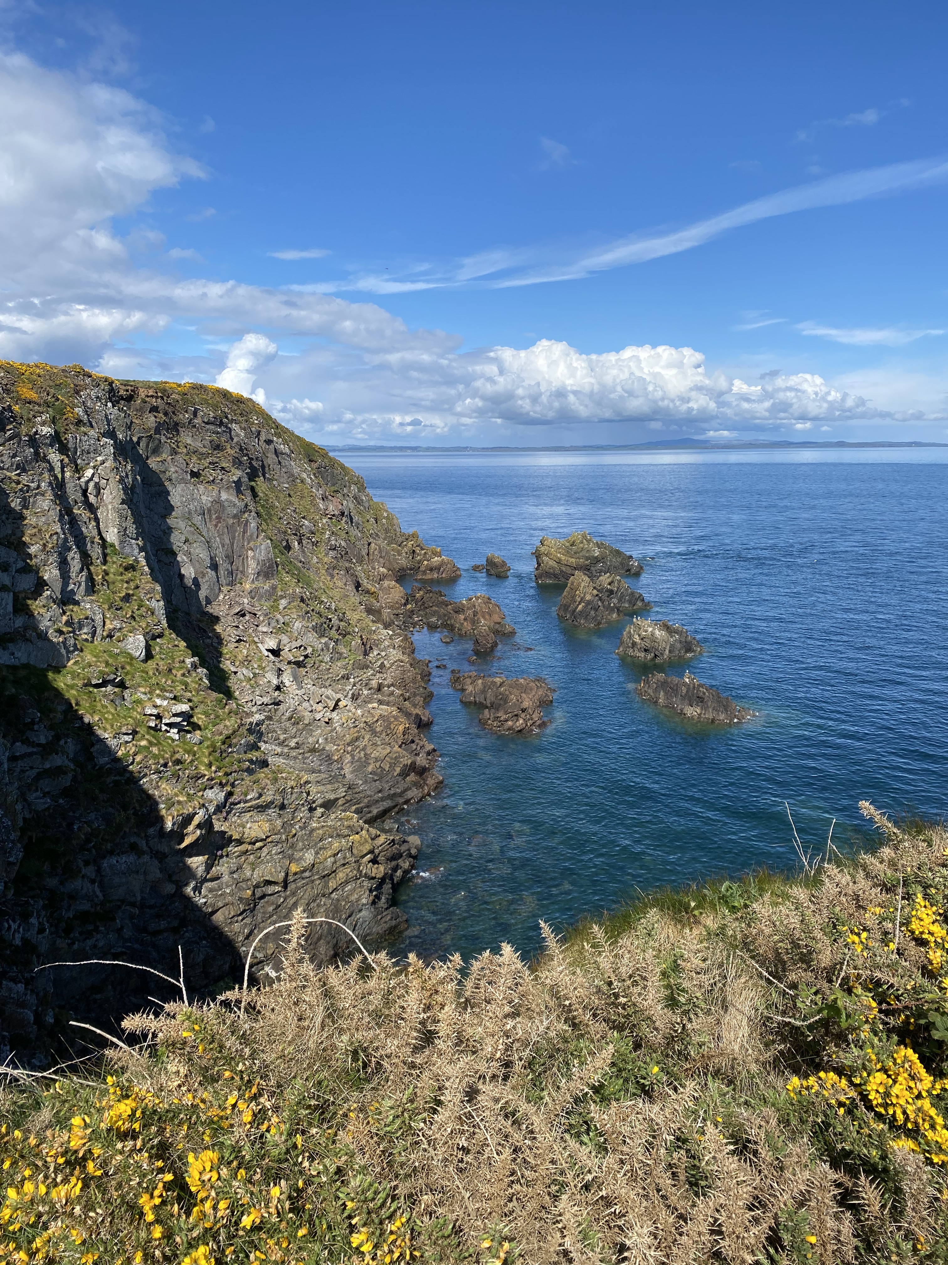 We moved on from there, further west and arrived at Kirkcudbright (not so bright) for an overnight stop. The drizzle only adds to the grey architectural demeanour. Jigsaw enjoyed the outdoor space in the grass field. From there we headed along a coastal route that we didn’t realise is The Wicker Man tour. Guess we need to watch the film now. A couple of stops including a coffee and a beach walk at Skyreburn Bay among the masses of shells, once home to many sea creatures, we found ourselves in Isle of Whithorn and the sun was shining so we headed out on the glorious coastal walk. In the distance we could see the Isle of Man and the Cumbria coastline, all the while soaking up the coconut aroma of the golden yellow gorse flower, warmed in the sunshine. The sea waters were crystal clear and surprisingly, it was warm enough to lie among the soft grasses and watch the clouds wistfully pass by.