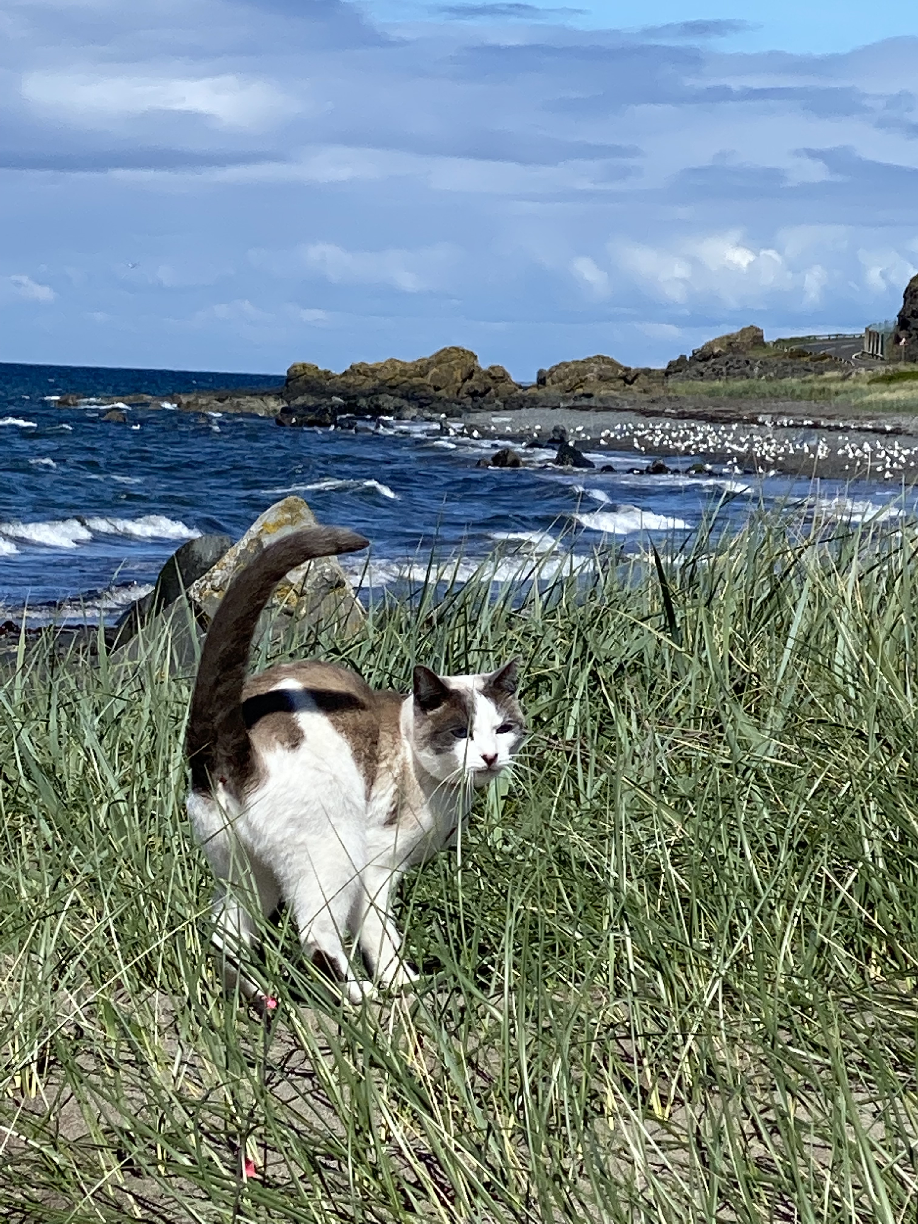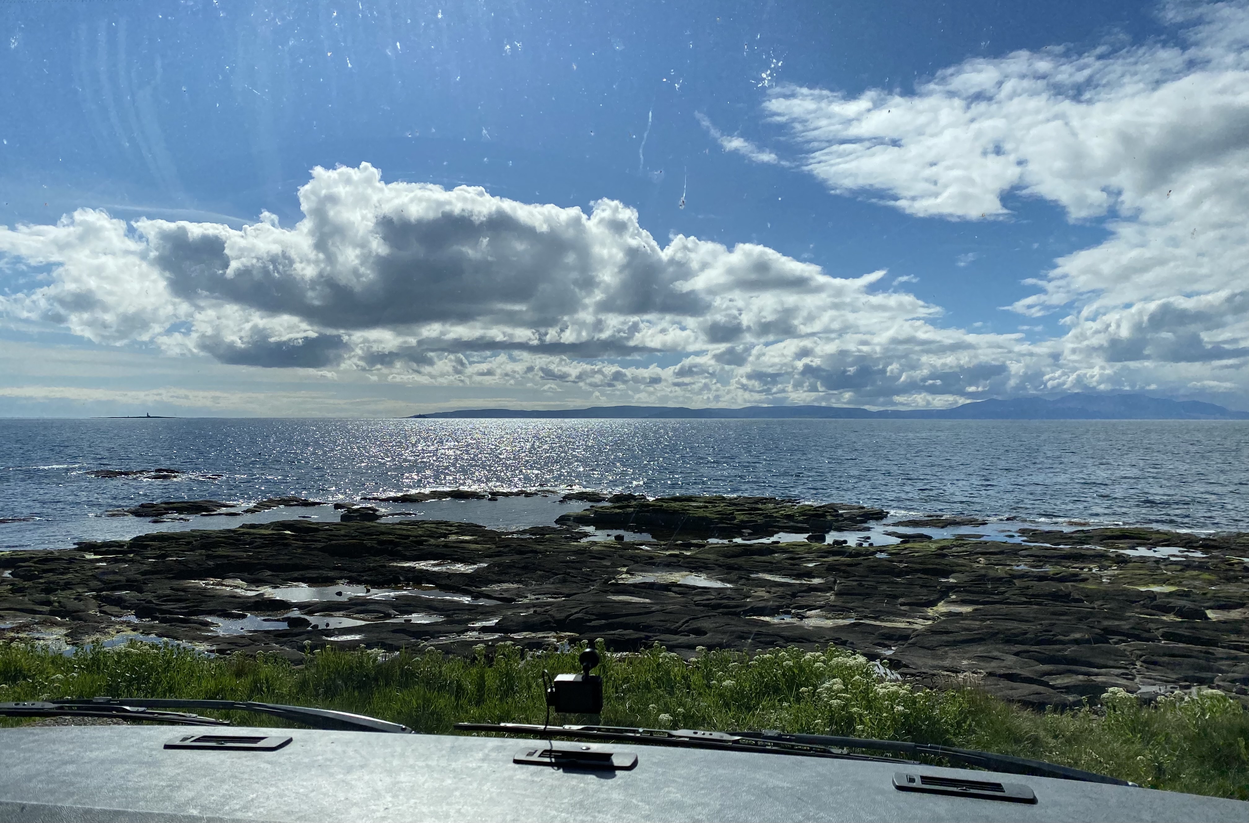 We followed the coastal route north, a lovely drive with sun and cloud over the blue sea waters. Numerous pull in’s later we passed the Stranraer ferry ports and the landscape changed, the road rising higher into more cooler alpine like surrounds, a mix of tree’s forming a canopy like, road tunnel. Dropping back to the coast we saw Northern Ireland, Arran, Kintyre and Ailsa Craig ahead of us, bathed in dappled sunlight. Also a road sign in Russian, for Varyag Memorial (a Russian warship sunk in the area) A lunch lay by by the beach had Jigsaw finding sand between her paws for the first time as she took the tall man for a walk. From there we arrived at Troon harbour, our park up for the night before heading off to our next instalment at Arran, tomorrow morning.