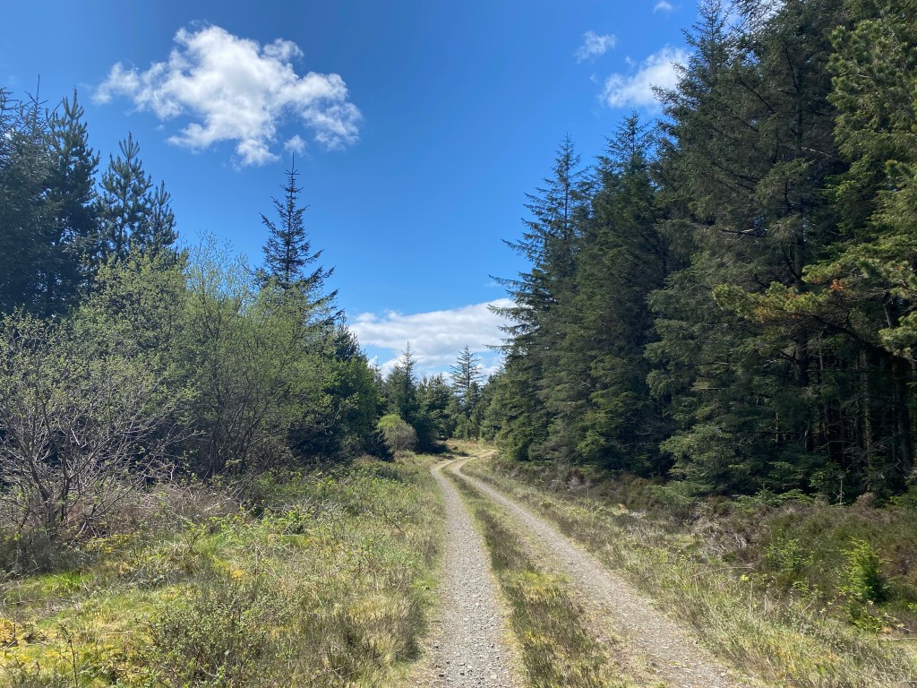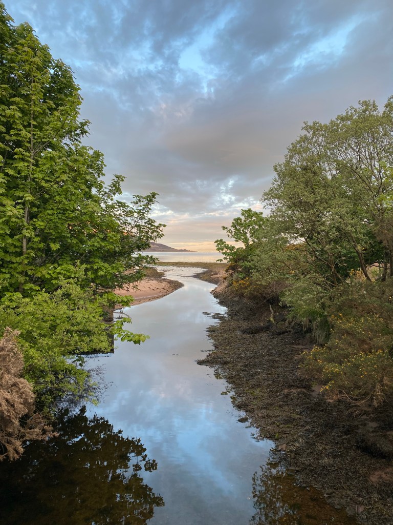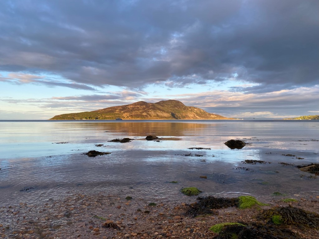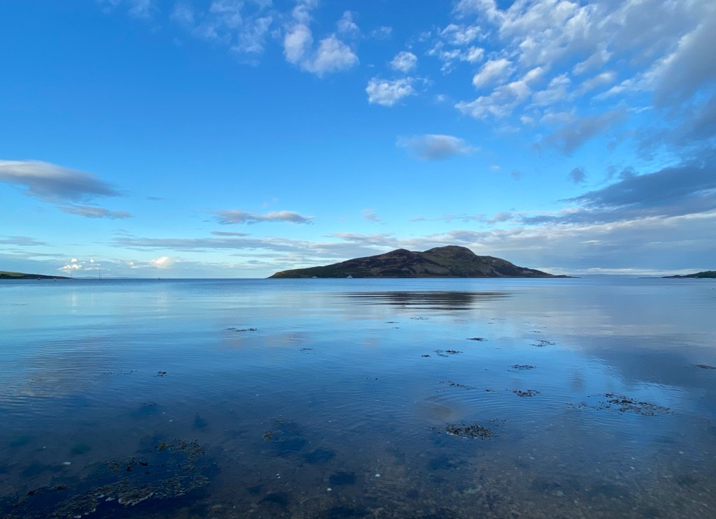 Riding again the following day we headed inland with a long climb up through some of the managed forests, seeing the trees at all stages of life. Mostly Scots Pine. Another cuckoo kept us company. The decent was a relief, heading down to the coast, small birds bobbing along the top of the hedgerows with us. Back down at the main road we were close to the Lagg Distillery but a whisky wouldn’t have helped the ride home! Instead we had coffee and a bun at the Velo Cafe where we felt pretty out of place among the road cycling non electric snobs! We could still move after 40km so that evening we walked down to the beach where the water was mirror like and the skies continually changing over Holy Island. Absolutely beautiful!