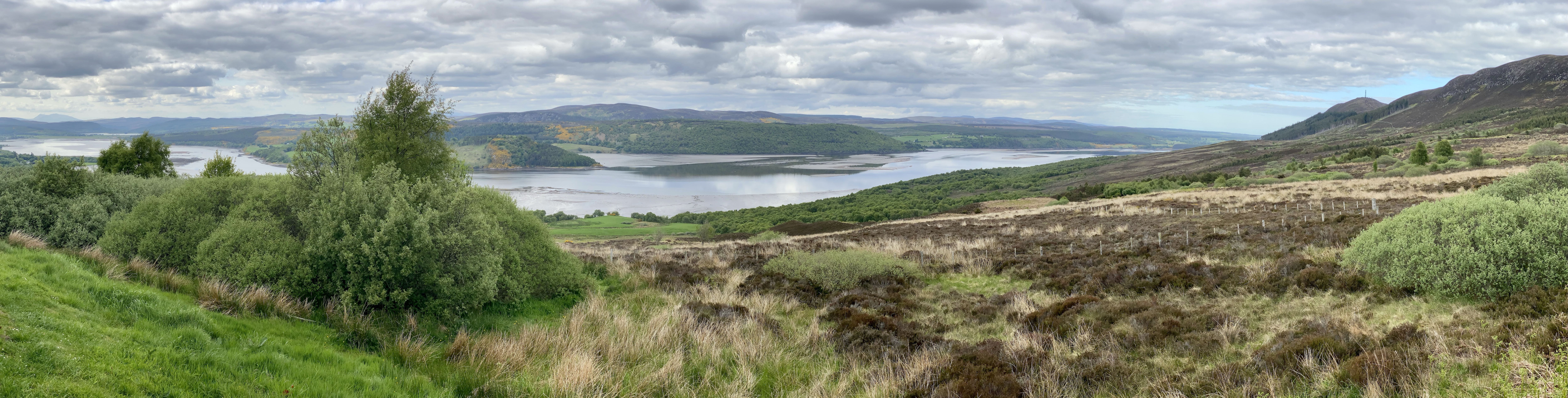 From the bridge we were able to cycle along the canal to Fort Augustus past a series of locks that make the Kennet and Avon ones look like tiddlers. The ride took us to Loch Ness and the small town was pretty busy with day trippers, motor cyclers and scooter riders and two electric bikes. Driving away, the landscape changed as we crossed the Cromarty Firth and we could sea the oil rigs in the North Sea, and several within the Firth itself for maintenance, looking like the War of the Worlds alien machines. At this point we picked up the NC500 and the area softened, vast areas of dark heather took over from the bracken as we headed to Bonar Bridge parking up at a spot where the Kyle of Sutherland meets Dornoch Firth. Jigsaw made friends with some fishermen…