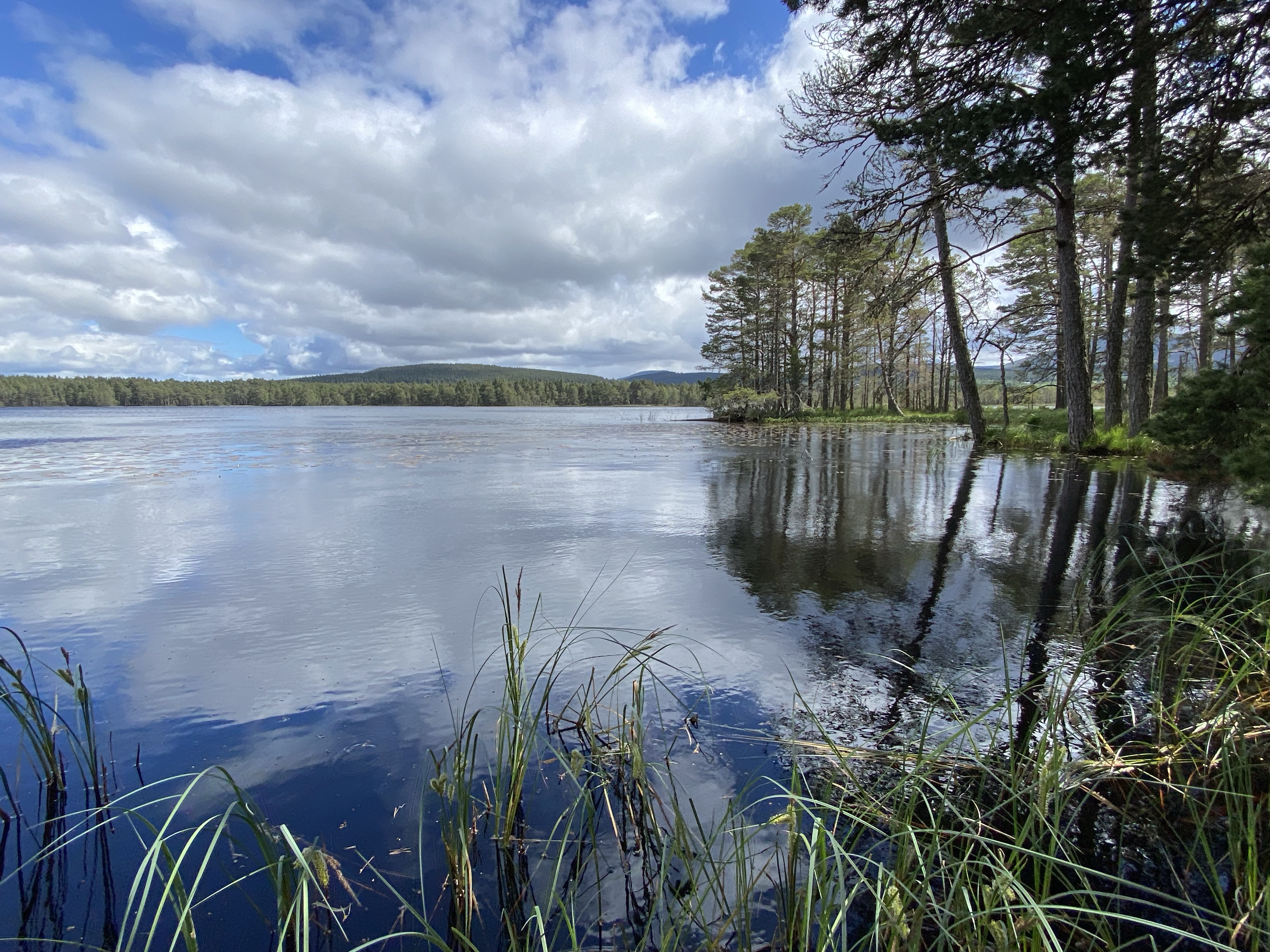 One of the trails we rode was out to Loch Mallachie, taking us up through ancient woodland with views of snow on the Cairngorms. The ancient Scots Pine stand solid and tall, many with unusual forms where the trunks split and twist around each other. We took a long walk around the Loch as there are Ospreys in that area but sadly, they were evasive. We were however treated to lots of Chaffinch and might have seen Great Crested Tits. We definitely saw people swimming in the loch, brave souls for sure as it was bloomin’ cold water (tested with the big toe) Packed lunch waterside was delightful among birdsong, watching the breeze across the water uplift the underside of lily pads, creating a kind of shimmer effect on the surface, like fluttering sequins. From there, a ride back through Boat of Garten into Aviemore to the swell of tourists for coffee and a bun and then back to enable Jigsaw to taste the freedom of the forest (a 10m circle amount anyhow)