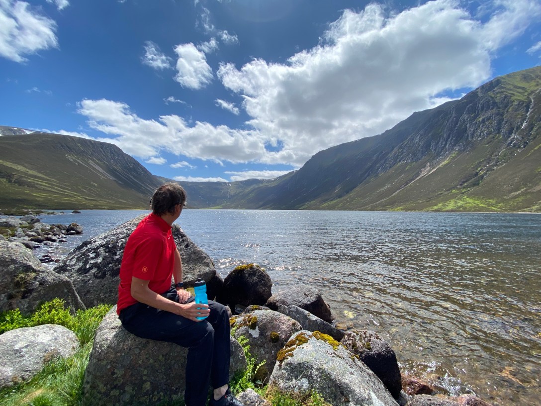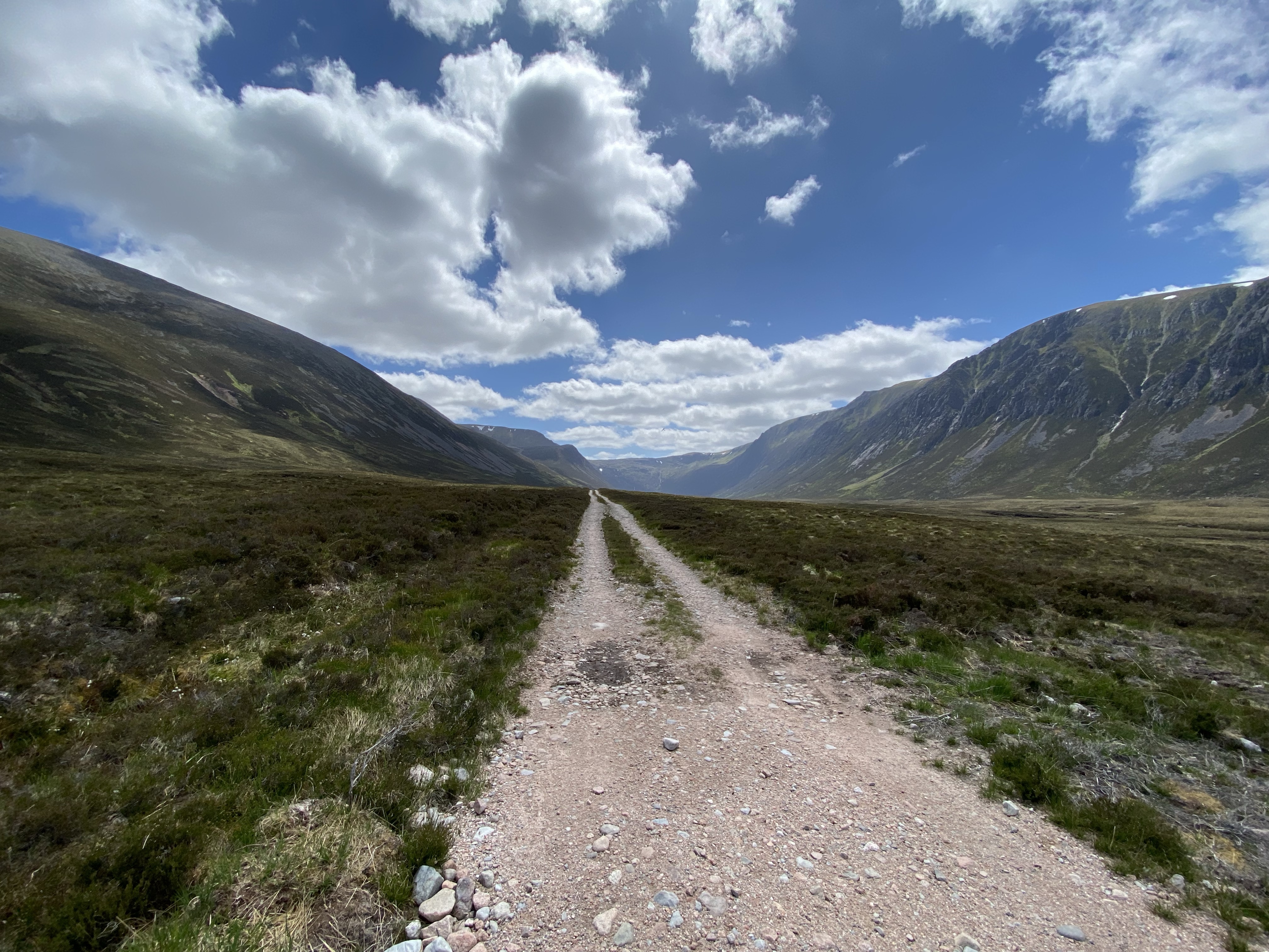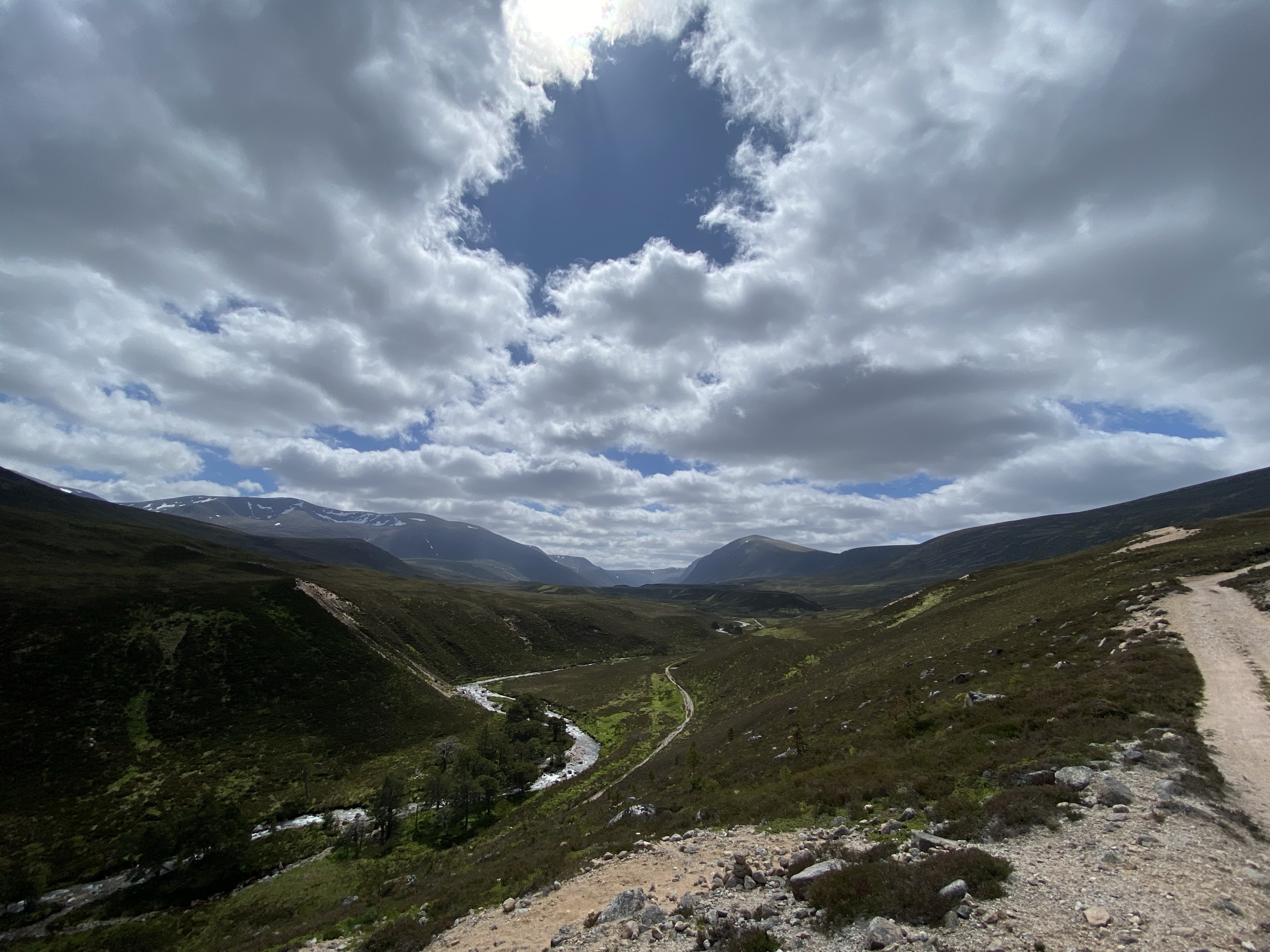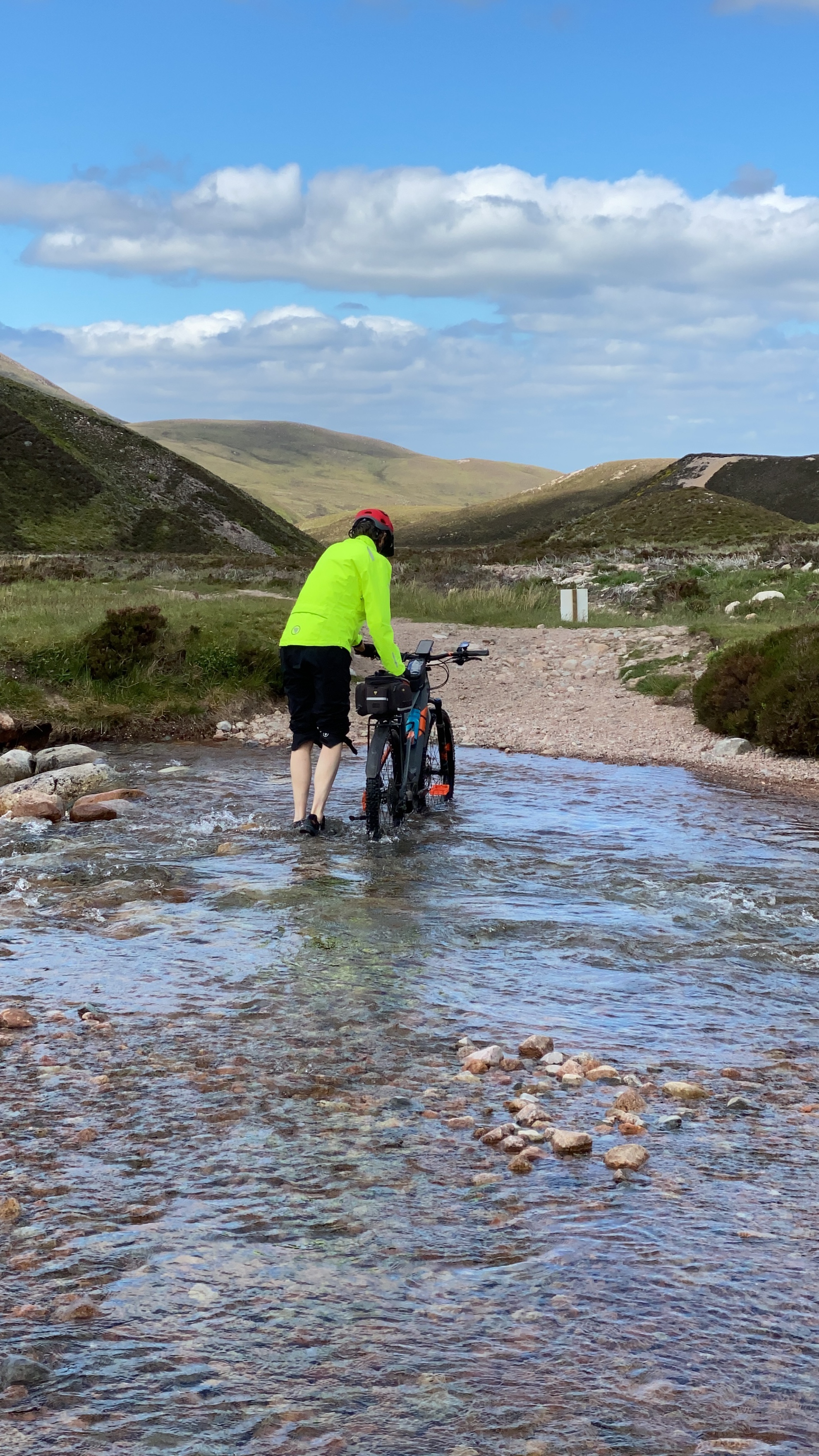 Riding out to Loch Einich we were in for a visual treat causing us to wrack our O Level Geography brains! Wide alluvial plains, sandy sections, further eroded by water flows and rocky sections, marking the retreat of the glaciers that had once covered the area, carving out the spectacular landscape. The higher the track climbed, the mountain sides changed from tree’s to moorland and wilderness. Some sections reminded us of African plains, sparse trees but flat with dry shrubbery. The valley shape remaining soft, wide crescent curvature, revealing waterfalls, in contrast to other craggy landscapes we’d seen on the islands. No Ospreys again but we did spot a woodpecker! The ride itself was fun, with other cyclists we had to get across a reasonably fast flowing river where the flow could very easily trash the battery, it was high enough. Our bikes are too heavy to carry over slippery rocks. We ditched the socks and succumbed to having wet footwear. The slightly different return sections were very muddy and wet so it didn’t matter anyway! Especially for Nick, who wheel planted into mud. Honest, I didn’t laugh, schadenfreude and all that! At base, Jigsaw came into her own too, spotting a red squirrel for us so we had a fab time tracking it through the trees. Suffice it to say, there’s so much around this area, we’ll be back for sure.