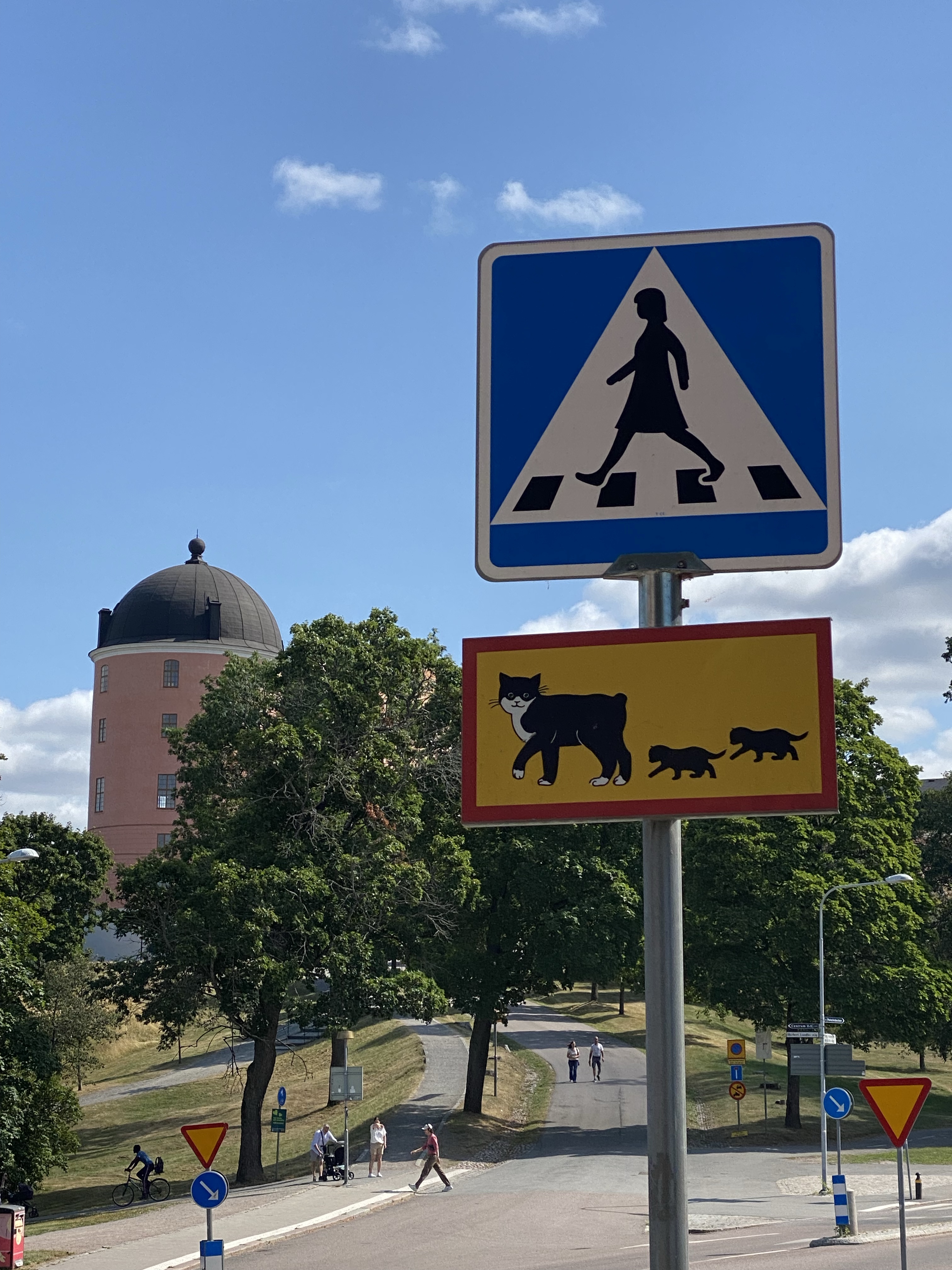 After the highlights of Stockholm we needed to tone it down a bit so after escaping the tunnels, we headed to Uppsala for some crazy golf, not kidding, see photo… then we decided we should be more serious so headed out for a riverside walk to be educated on Uppsala, it being a university town after all. Compact and quiet it’s full of grand university buildings as usual, dominating the tiny historic C18th houses towards the centre. We were on the look out for quirks, as we do, and found another cat sign, see below. It is close to the Uni Library, said to hold 5m books, the largest collection in the Nordics. Reason for the cat you wonder? It celebrates a popular children’s book series, set in Uppsala “Pelle Svanslos” (Peter no tail) Pelle is a kind hearted cat who works hard, is generous and thoughtful and studied for his degree at Uppsala, in mousing…?!! Jigsaw has a 1st class one of those we have discovered 🙂 Selection of pics at the end!