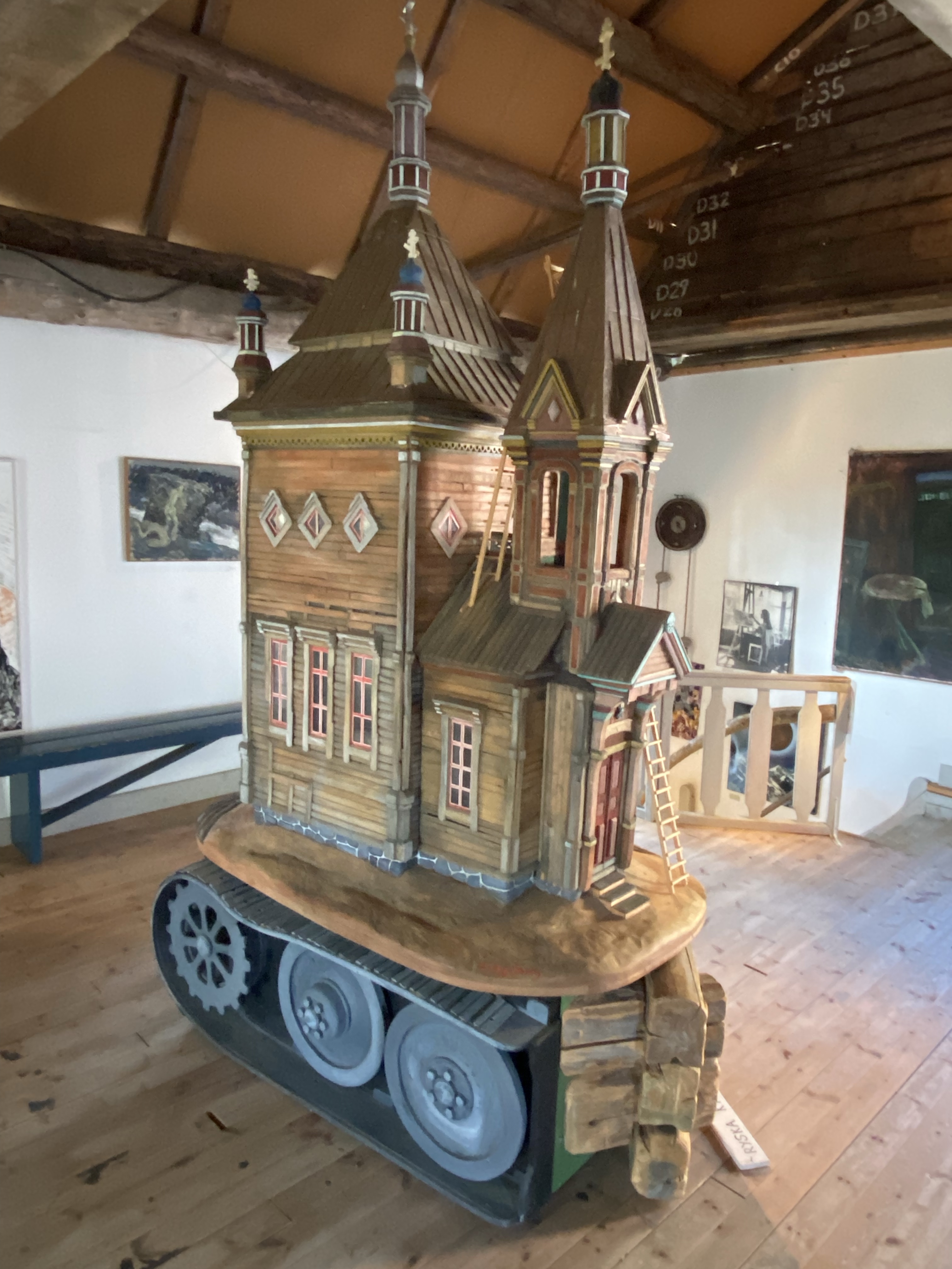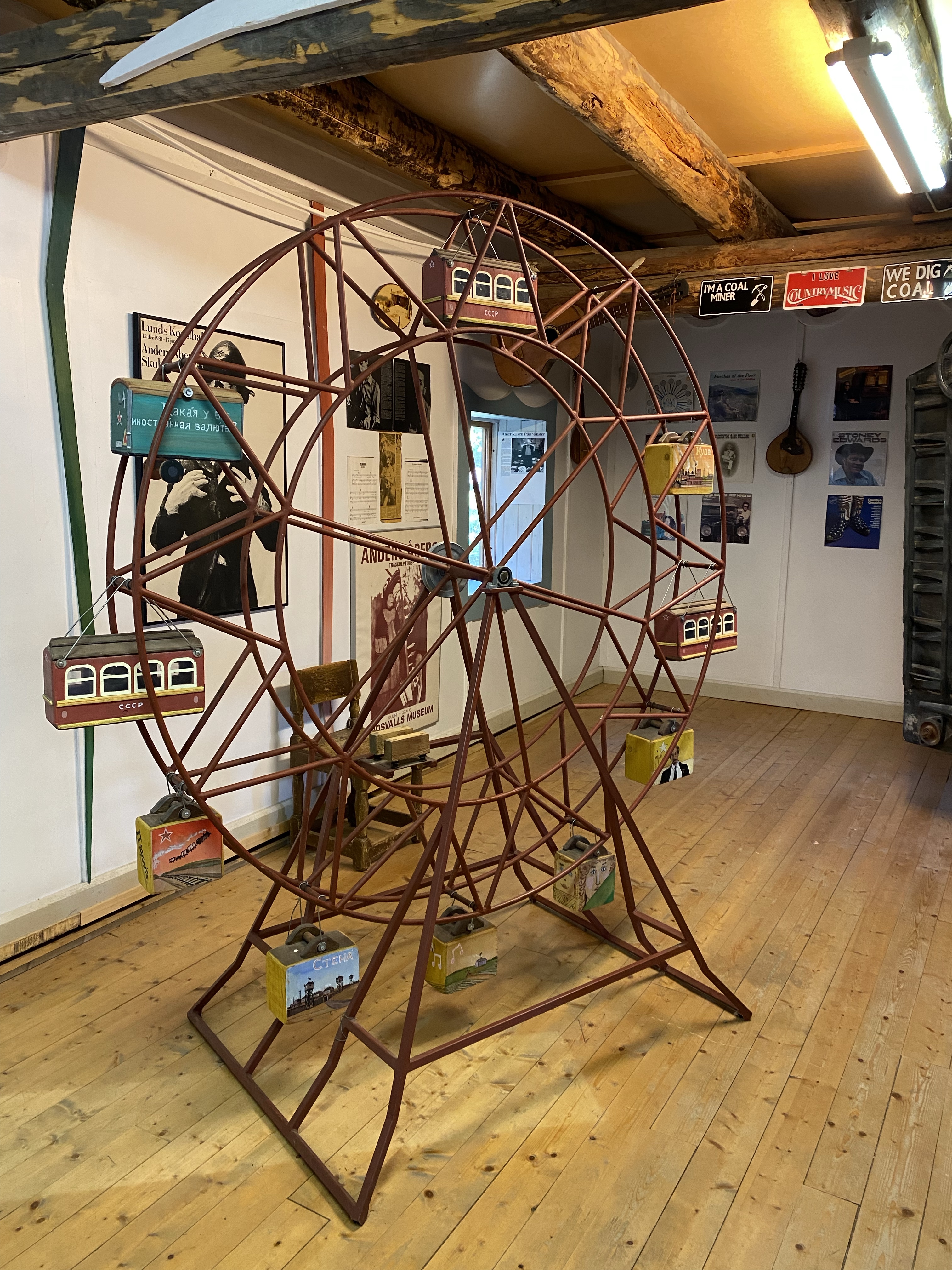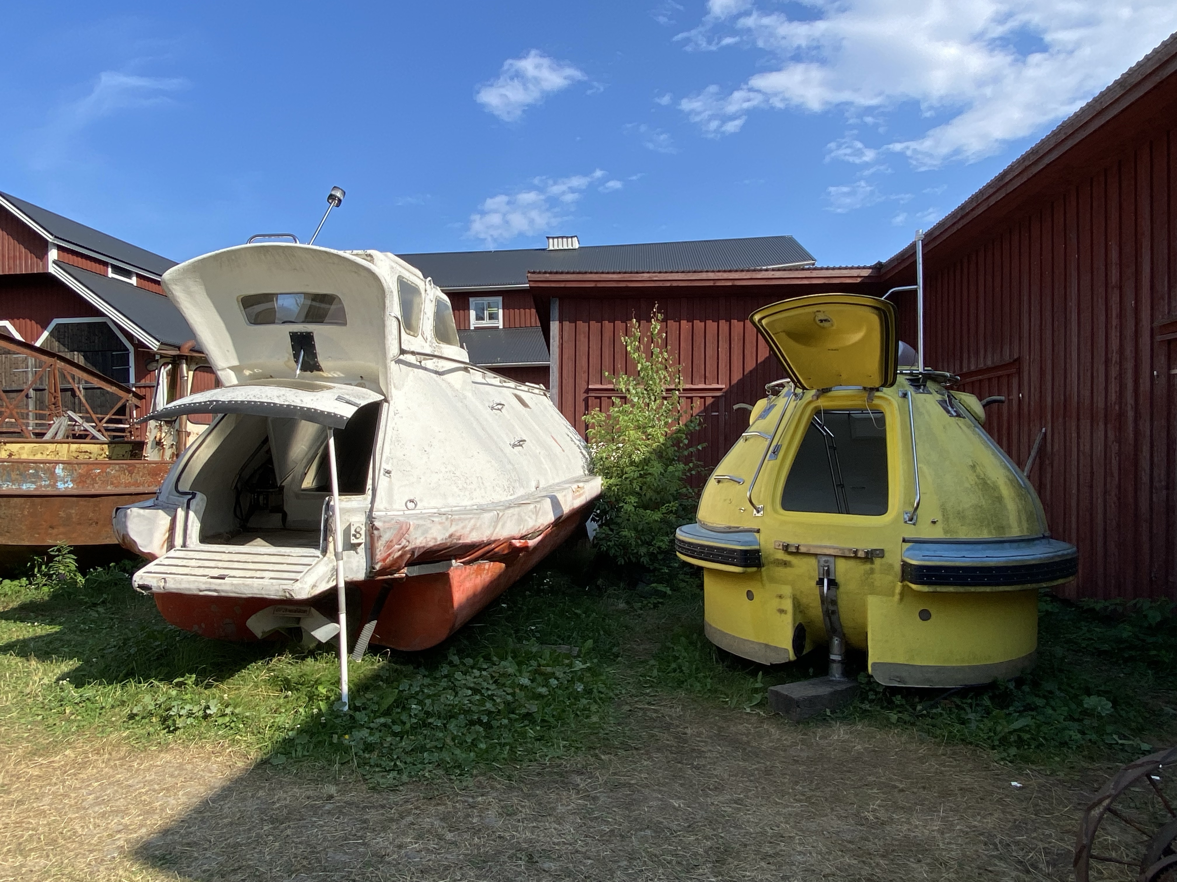 We really struggled to find the words to describe the place. Swedish ‘artist’ Anders Abergs seemed to have a penchant for rescuing ‘stuff’ from around the world and then building around it, such as the Accordion House, built around an entertainment boat, the S/S Stromkarlen, frequented by Accordion players. The area was shrubland until 1980 when Anders started his project. There are now several museum buildings, themed differently. He also collected old tram cars, cars, boats and a fighter jet. Each of the buildings housed an eclectic collection; agriculture; engineering; fishing; the globe; Estonia; country music and our favourite “the Technology” house. Only our favourite as we could pick out lap tops and mobile phones that we’d once had, or ‘MS wordperfect’… we felt like we were becoming history ourselves 🙂 All in all it was a quirky and odd mix of functional art, a collection of some genuine pieces and several buildings full of all kinds. Dotted around outside were trams, cars and life rafts and a metal double bass… Maybe the photo’s will describe it better than my words!