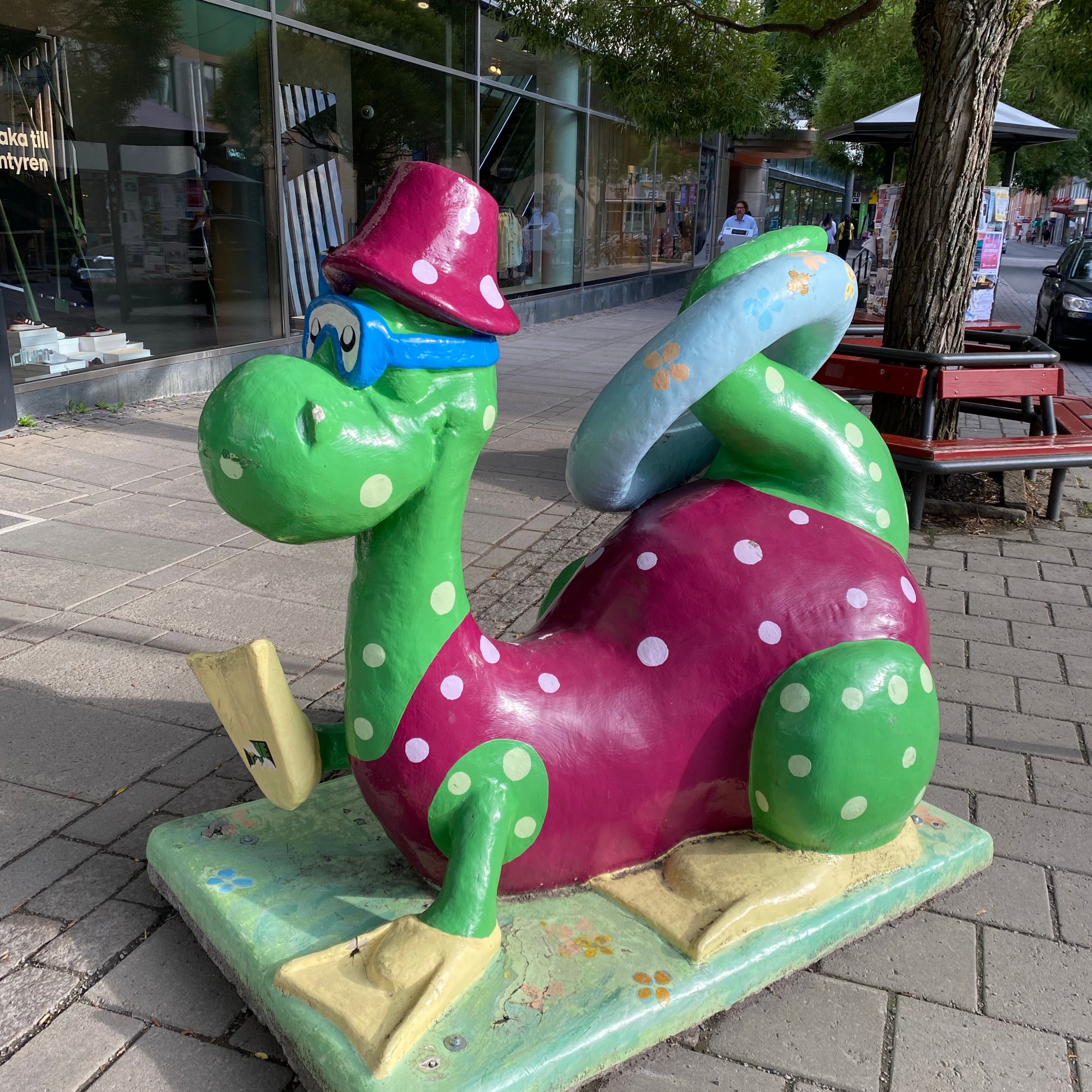 Before the alert that we’d be ok to travel into Norway (must have been the email I sent to their PM) we had continued south to and spent a few hours in Osterund. They have their own Loch monster here, Birger. Based up a series of children’s books written by a local, they have their own Birger exhibits all around town, painted by different people in different themes. We liked the skull holding ‘ToBe’ and ‘CyBirger’. Unlike Nessy, we didn’t see lots of tourist tat 😐