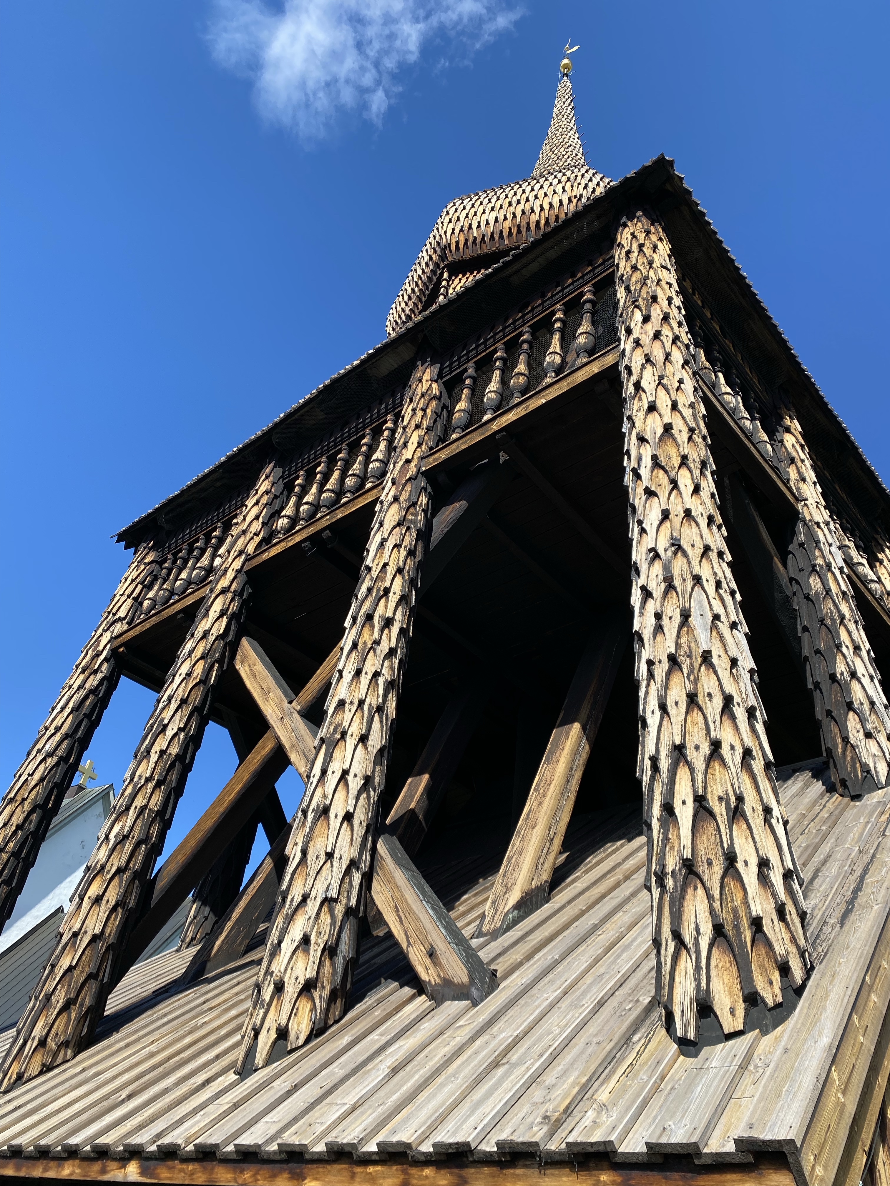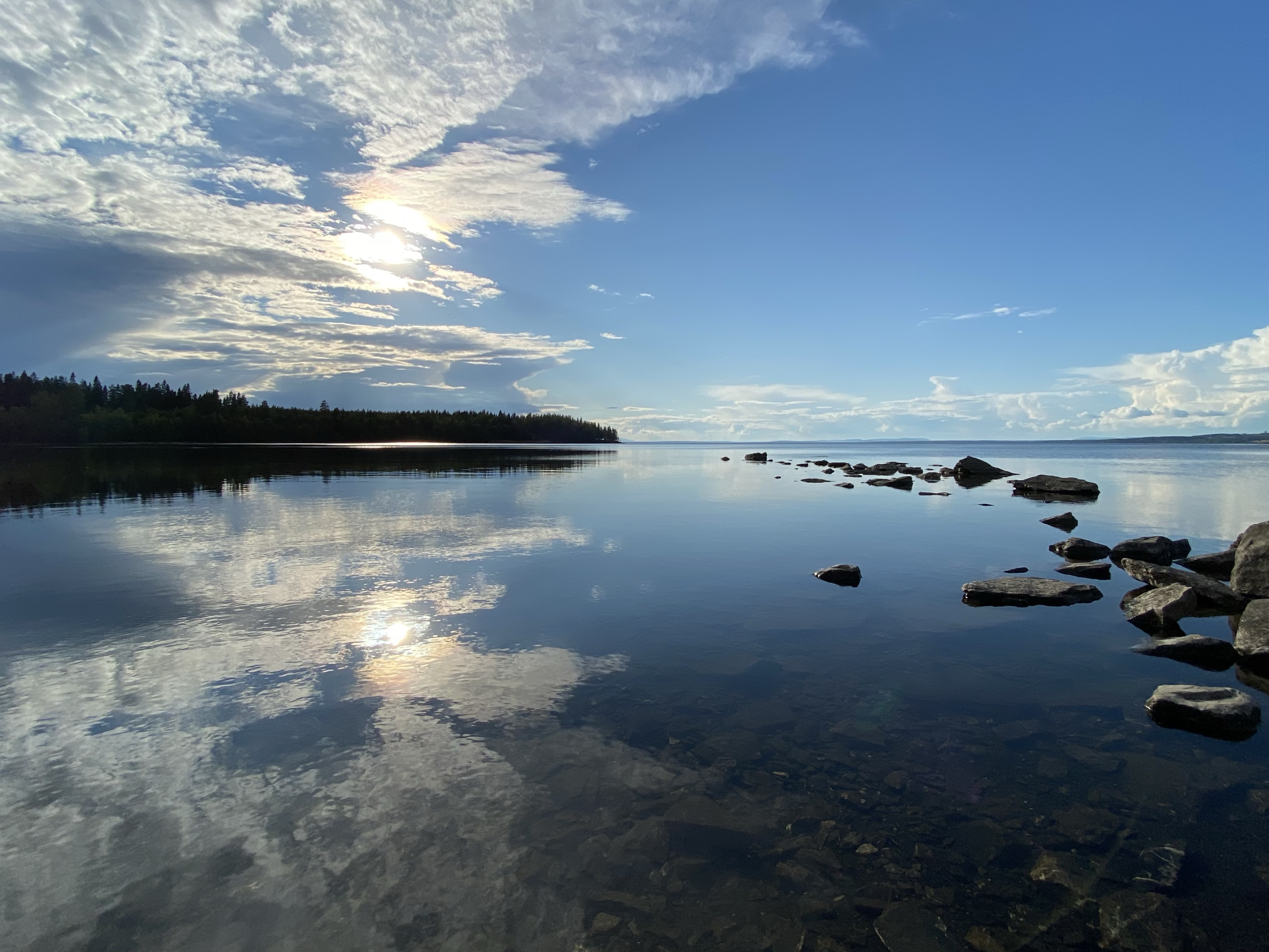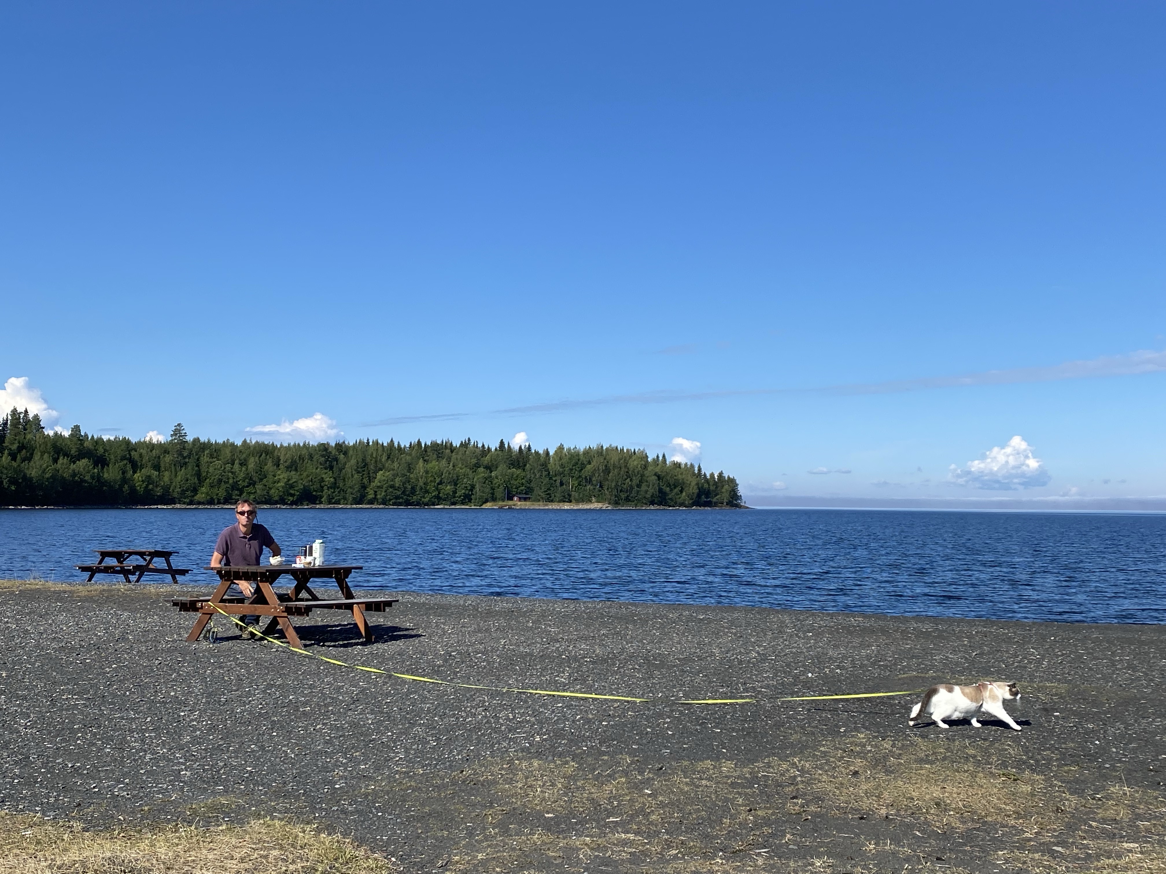 A wander around the reasonably affluent feeling town, being the sizeable winter sports centre of the area, before heading across the bridge to Frosen Island. Not to mistaken for a Disney set, Frosen is built primarily around the airport and military establishments. Much of the forested area being out of bounds. The parking spot was however on Lake Storsjon so an evening lake swim and an amazing sunset were in order. Watching the weather in the far distance Jigsaw meanwhile continued her mousing in blissful ignorance of the vista. The following day, we saw our first moose, actually we couldn’t miss it as it ran across the track only a few meters in front of us, on our bikes. We were lucky on more than one count! There’s a very unique church, Frosokyrka, said to be the most popular for marriages in Sweden, we can see why! From there an unplanned cycle, 7km around the edge of the forest over tree roots tested our skills somewhat! Bone shaken, a swim was in order before a chat with a young French couple with a cat on board 😸 See, we’re not the only ones!