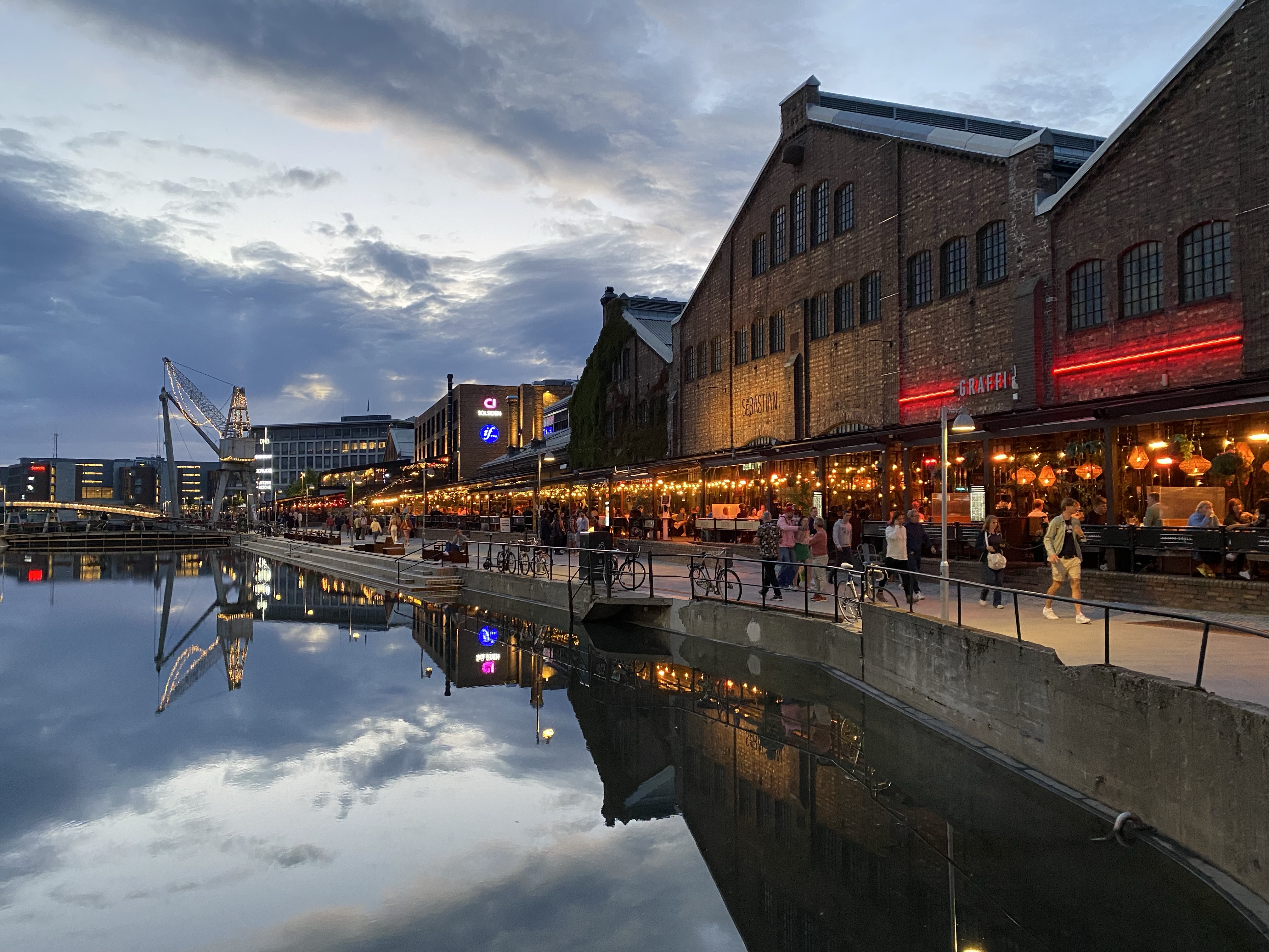 We successfully crossed the border one hour after it opened for Brits, all very easy, getting the ping we hoped for off the QR code scan. High fives all round (not with the guard 😂) We knew Lofoten was our primary destination, as it had always been, so we set out driving the 1000km back up in the direction of Narvik. We passed a fella who, although no doubt fit, wouldn’t get there as quickly as us. Arriving in Trondheim we parked up, with 80 other motor homes and went out into the town to celebrate. It’s clearly a stop off place for travelling. Mainly Norwegians but a scattering of other countries. Trondheim is a port town, the old town on the island was full of original buildings and felt reasonably prosperous. The regenerated wharf area was a buzz of life.