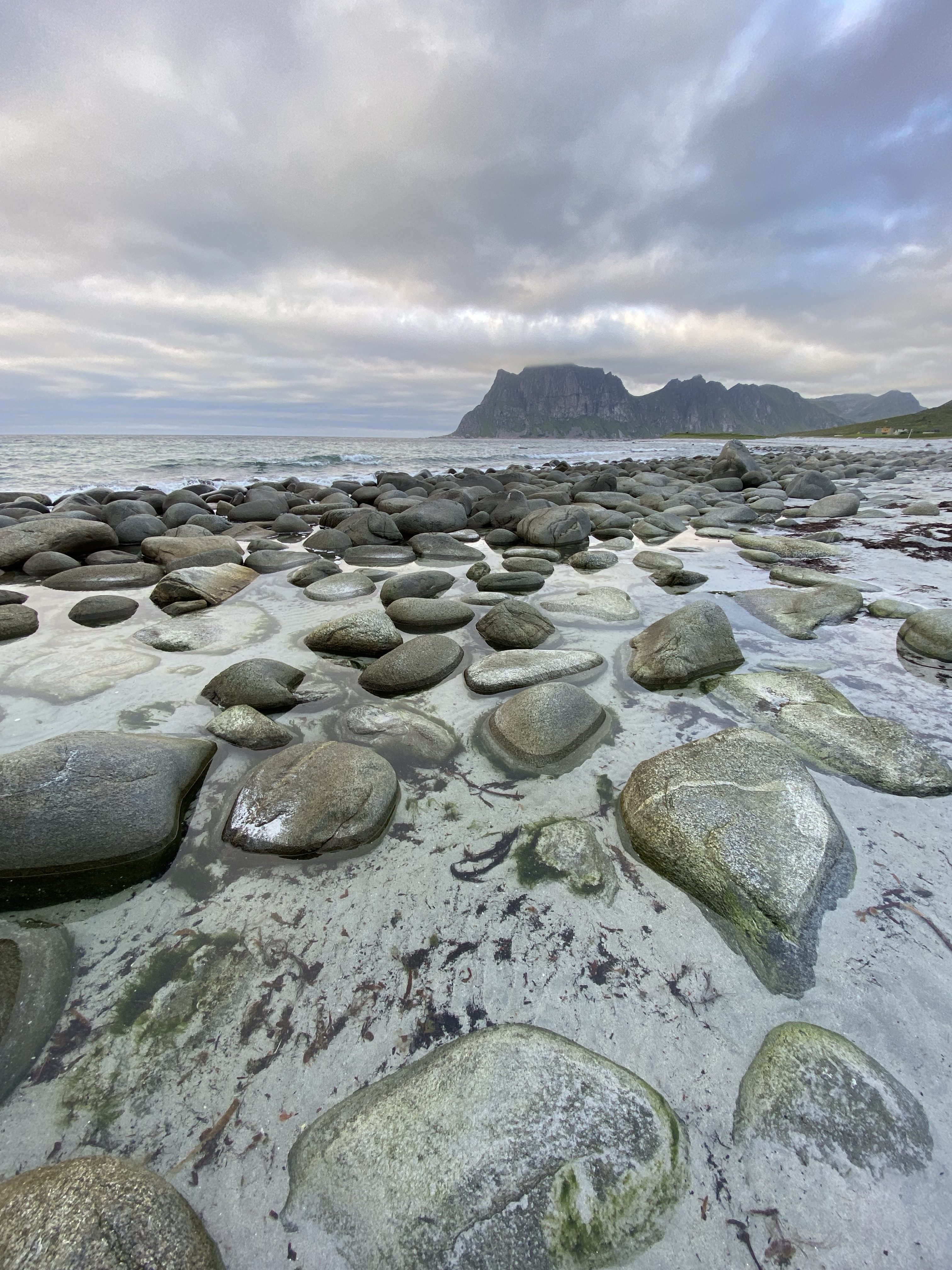 Continuing along the coastal road was the small port harbour of Stamsund and the main town in Lofoten, Leknes. We have to both confess to being ignorant of the infrastructure on Lofoten. We both underestimated how good the roads were and also the scale of the towns and the business going on. It’s that “Artcic Circle myth” again, that everything is desolate which is absolutely not the case. Yes they have 24 hour darkness in winter but most of the Nordics do and its just a way of life. Ice cream at the peninsula island of Ballstad, a tiny road to Hauklandstrand Beach and another tunnel to Uttakleiv Beach where we pitched for the night. A stunning location again, white sand, blue waters and a sea eagle swooping low. A photographers paradise! The rock pools were stunningly colourful and mesmerising. The archipelago and its islands has so much to offer, it was difficult to pack it all in to the limited time we had. Jigsaw wasn’t sure what the woolly things were that wandered around the beach areas.