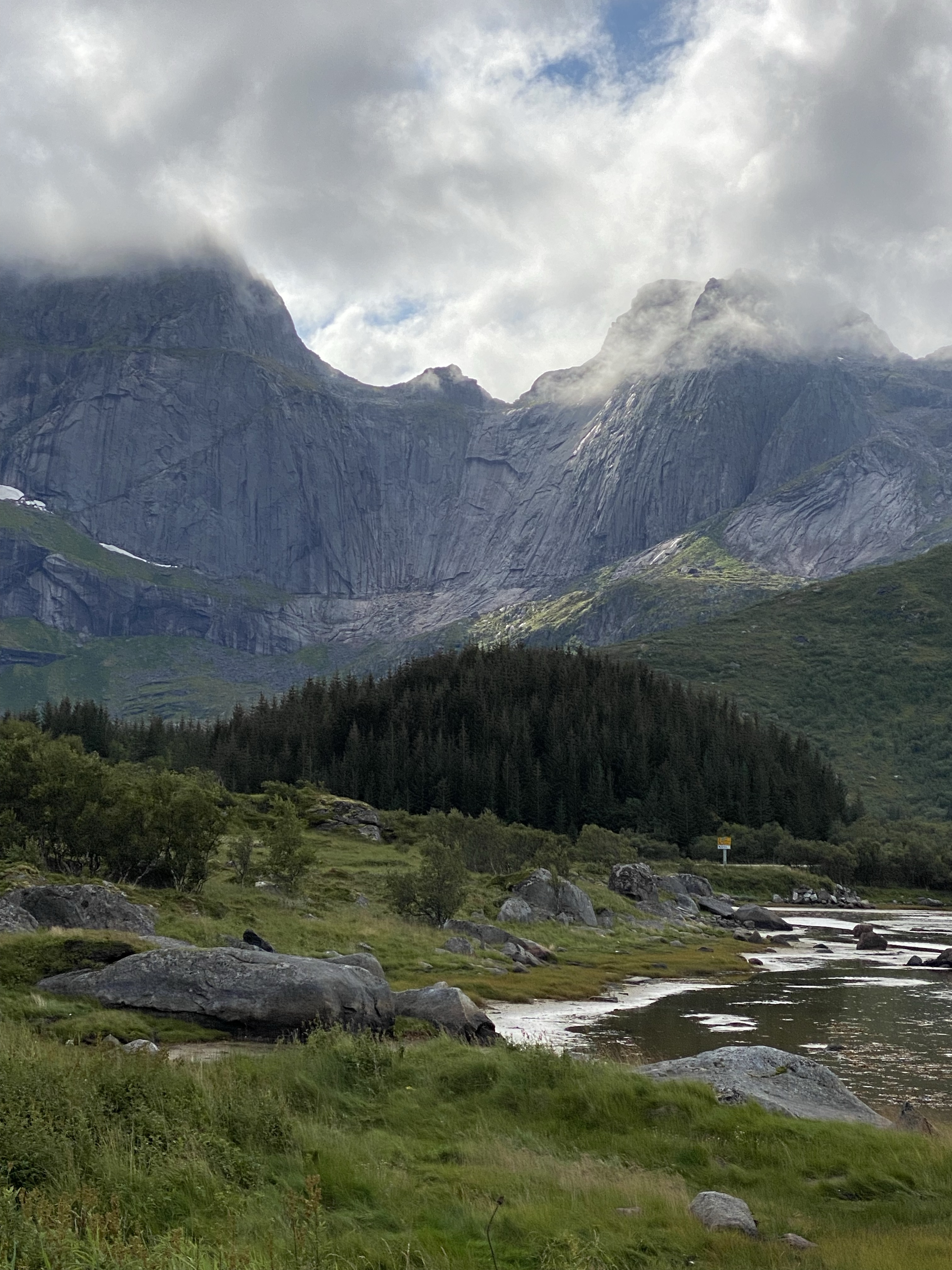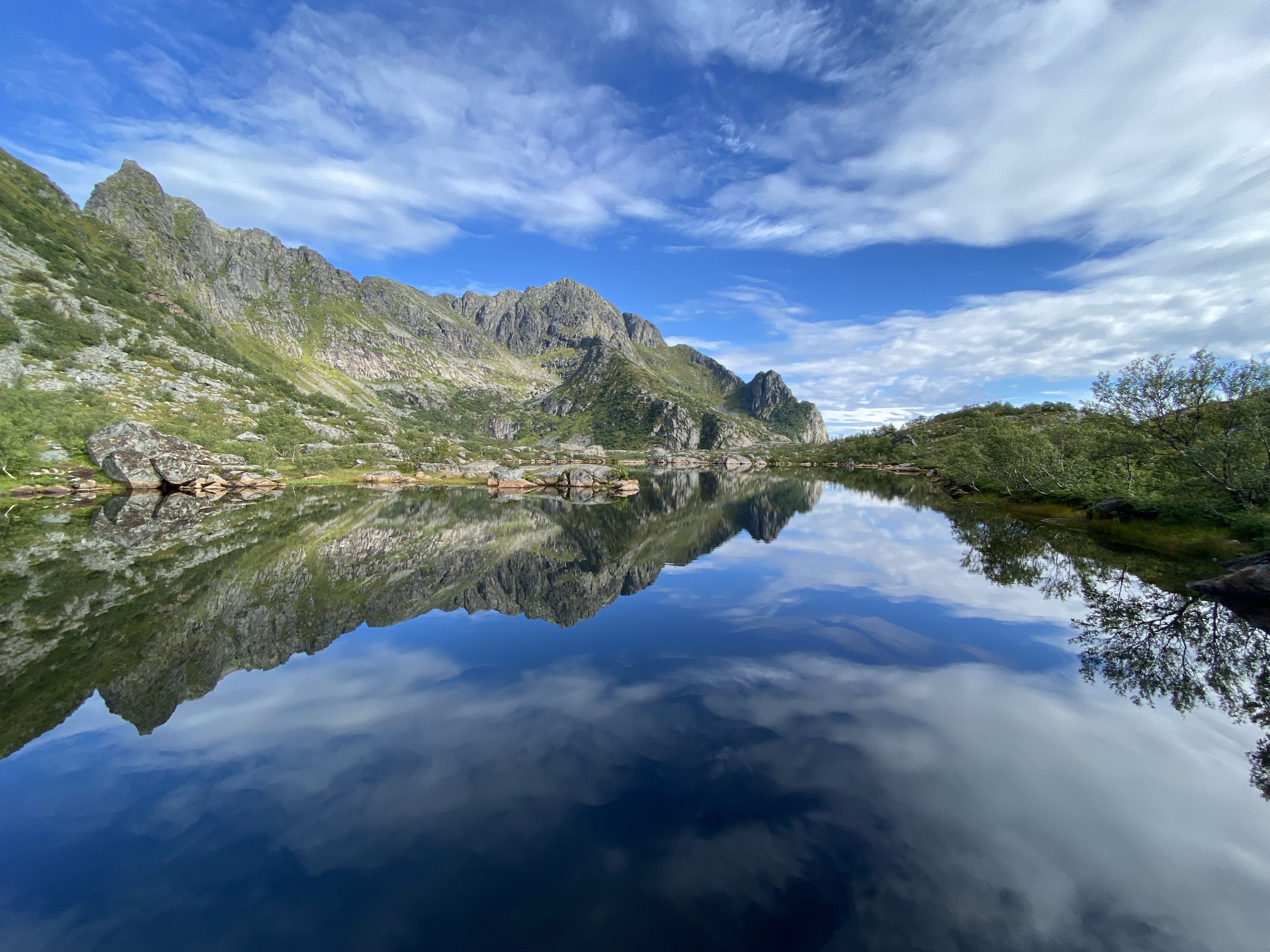 The following day however was bright as a result and we had what I call our “Olympics Moment” You all know it, you watch athletes doing something at the Olympics and think, that doesn’t look too difficult…. we sat and watched hikers climbing up a scree rock face to a view point across Henningsvær, and thought, yeah we could do that! It’ll be worth it! We quickly realised that most of them were half our age and had the agility of mountain goats but we clambered on. Good job I had that chalk for grip in my pockets! From the boulders and scree it was the rain soaked tree line, holding onto branches as we went. Of course at our ages we don’t want to be medivac’d off the mountain. We did actually get our gold medals at the top with a glorious hidden mountain lake and panoramic long views to die for (or hopefully not in our case!) Difficult to photo being back lit but the pictures aren’t too shabby! We clambered down in one piece, regular stops to allow the goats to pass. A welcome hot shower was in order that night before we had to sadly leave Lofoten. There’s so much we didn’t see, the northern parts of the archipelago for one, but we know we’ll be back one day.
