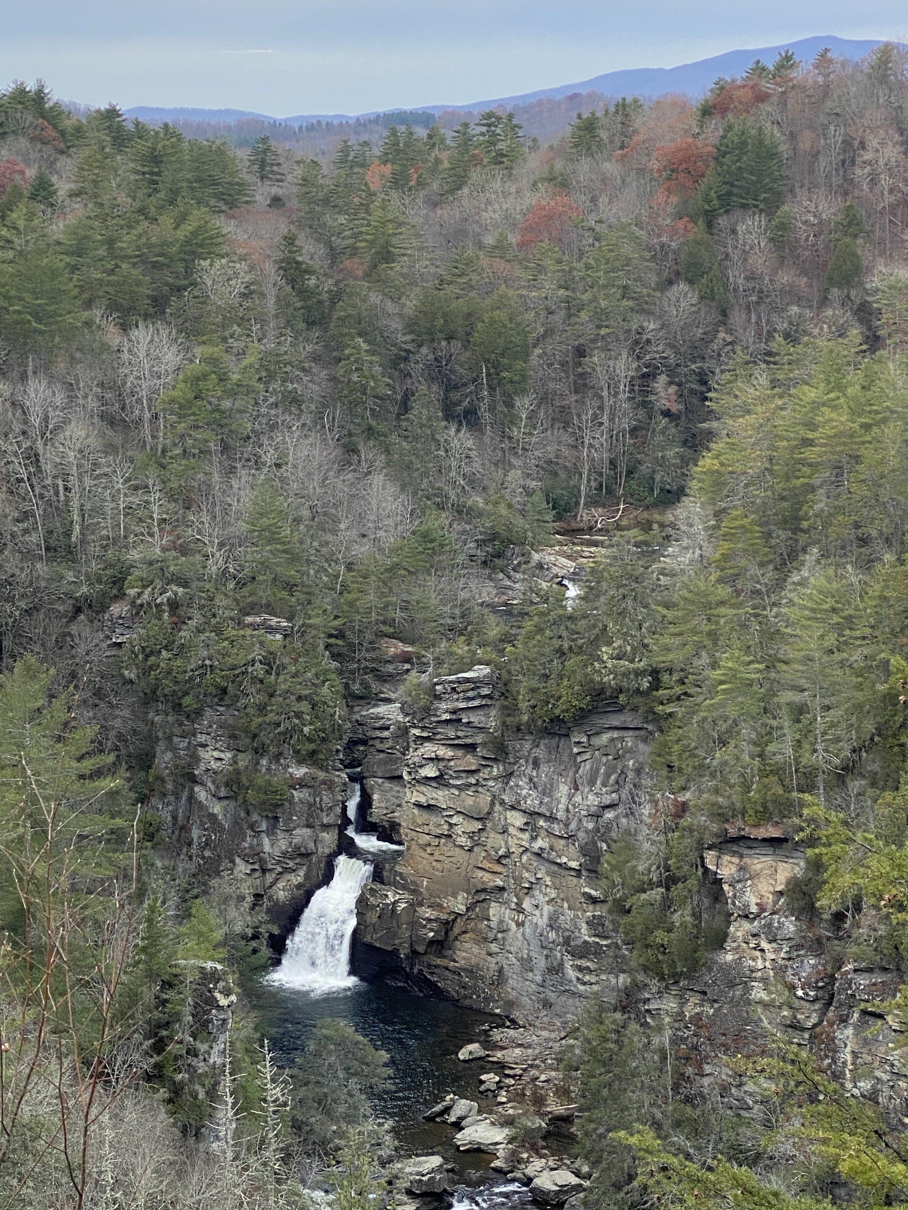 Getting over the Casino shock, the Smoky Mountains were our saviour. Undulating land forms, tree covered, softening the edges across the vast view, we were lucky with the weather and could see for miles, and miles the reds and rusts of the leaves about to fall, pops of colour among the evergreens. In the quietness, the birds singling and soaring made for magic. After a short hike at Mingo Falls, we continued on, noticing increased Thanksgiving traffic as we did. Smoky is the most popular NP is the US due to its easy proximity to major cities.