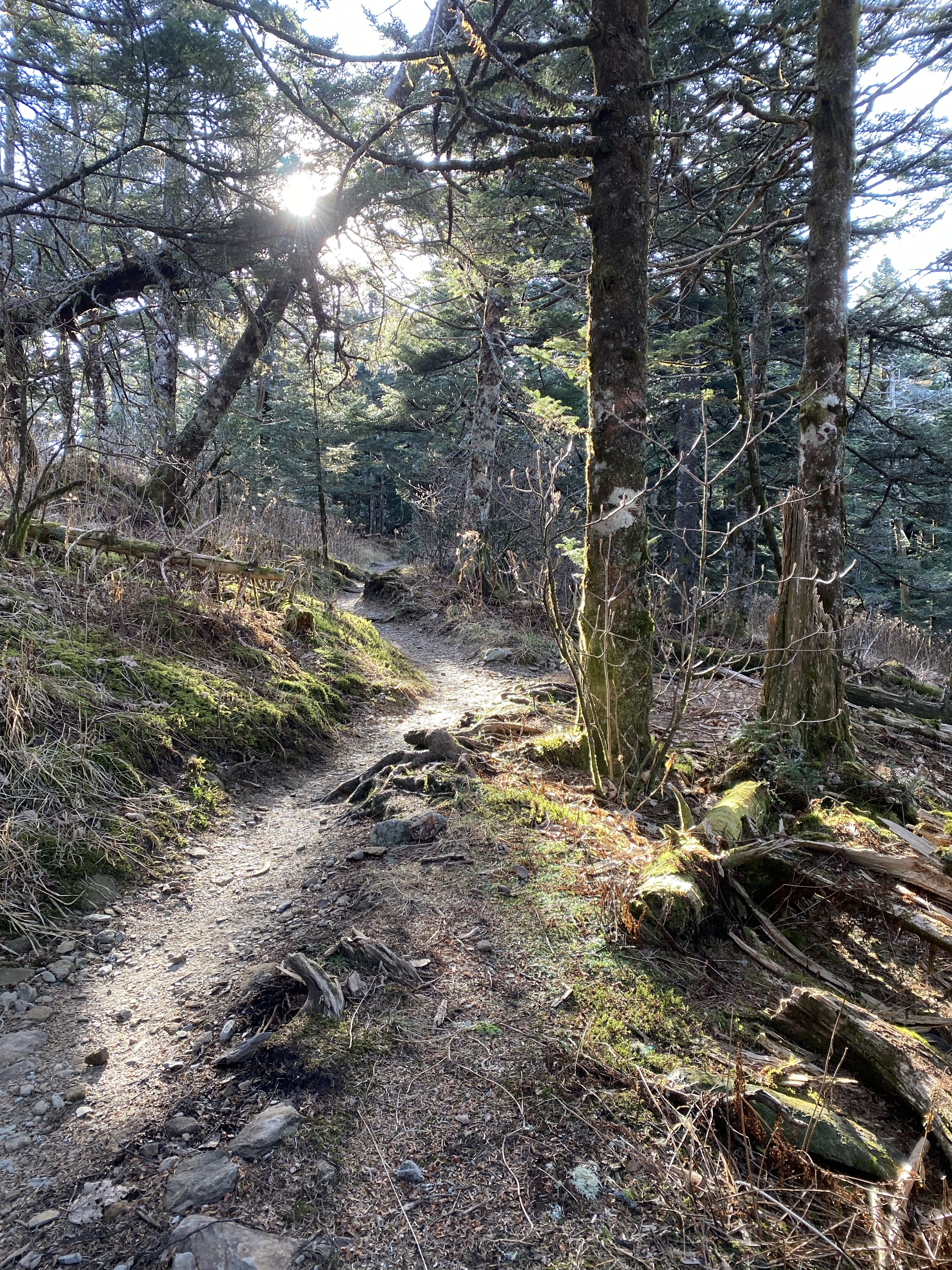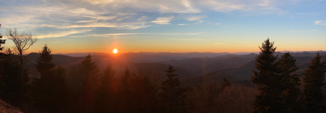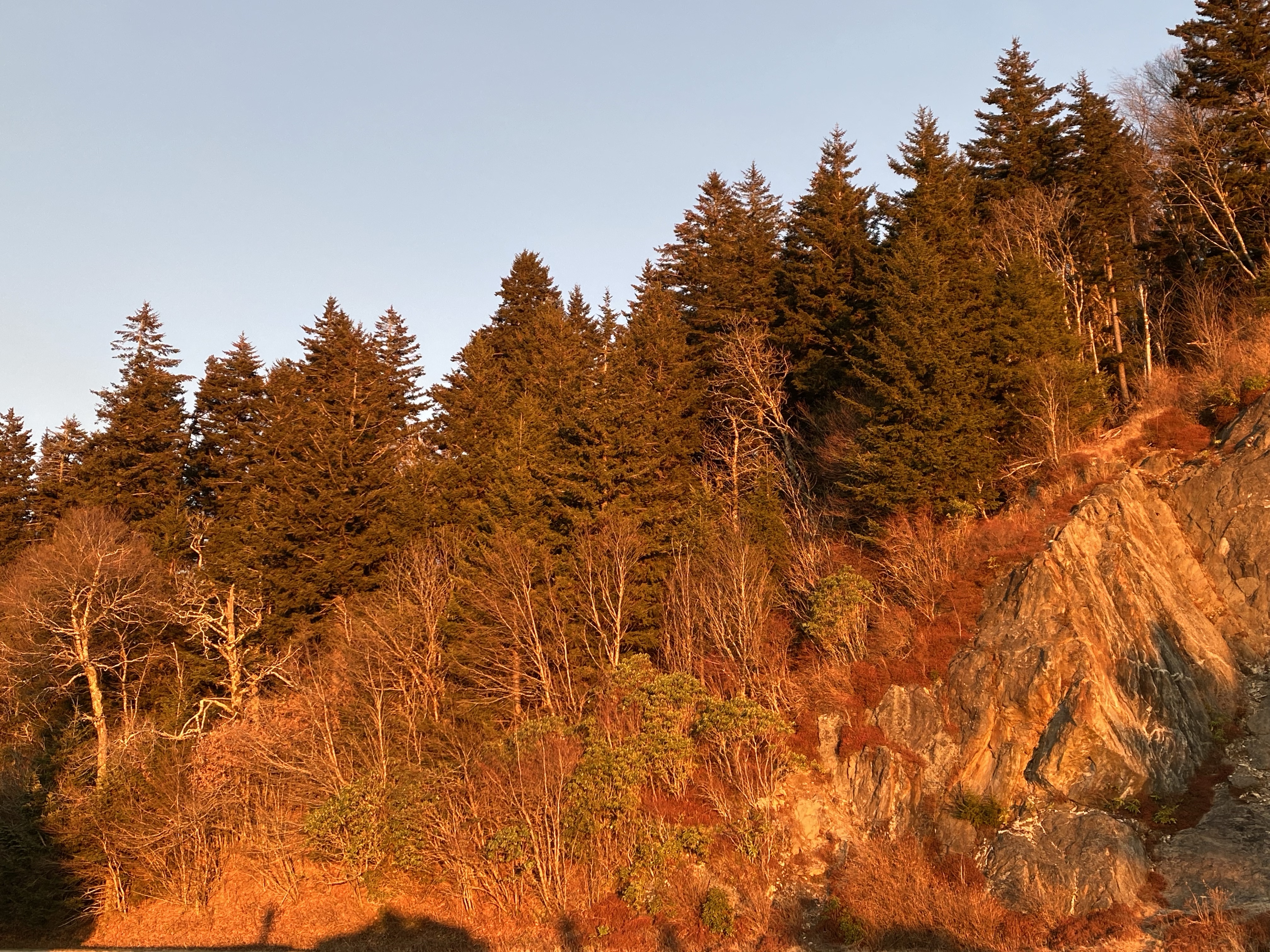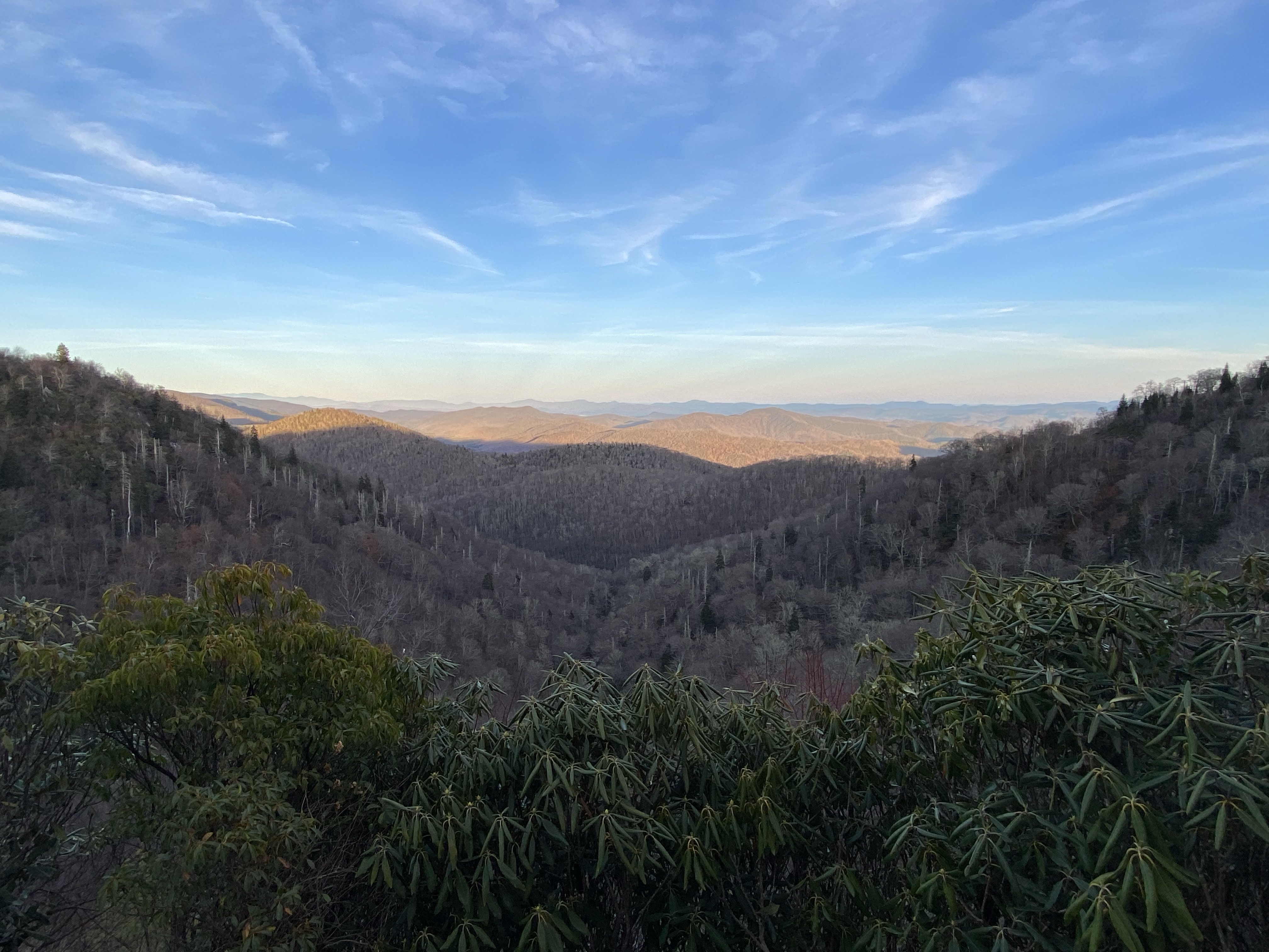 The highest point in The Smoky Mountains is Clingmans Dome, otherwise known as Old Smoky (yes there’s another song coming on..) After a steep walk up, there’s a viewing platform which on such a clear day meant we could see for 100 plus miles in all directions. What a spot to take it all in. Retracing our steps back to base we stopped at a viewpoint to gaze at the soft setting sunlight, throwing the valleys into relief. Pictures can’t evoke the scene as we watched the sun go down and the last golden leaves flutter down as they give up in the cold, to the carpet of colour.
