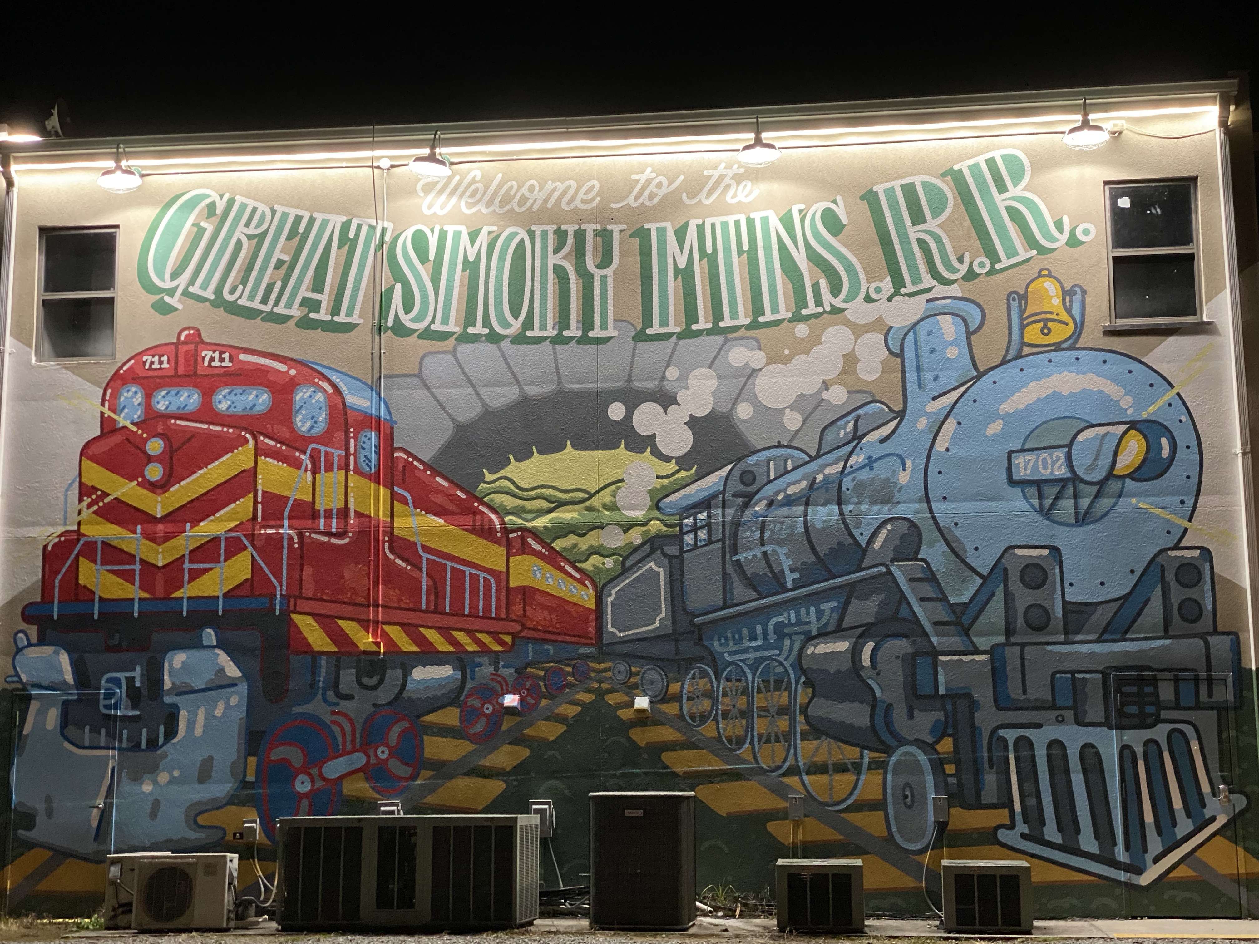 Heading inland away from the beaches the temperature started to fall as the elevations increased, we were heading to the mountains. First stop was Chapel Hill, another uni town, this one The University of North Carolina. It just happened to be match day so everyone was in their pale blue colours, it’s incredible the scale of the College Sports set ups over here, to rival at least our division 1 or whatever its called these days, in crowds. Great vibes though, pre game. From there to Boone where we found no Mills but we did stumble upon a fab veggie place for dinner. Not surprisingly, there isn’t usually much for us odd ones who don’t eat meat around these parts! Another uni town with a polar bear for street art, among other oddities and who knew the police are sponsored?!