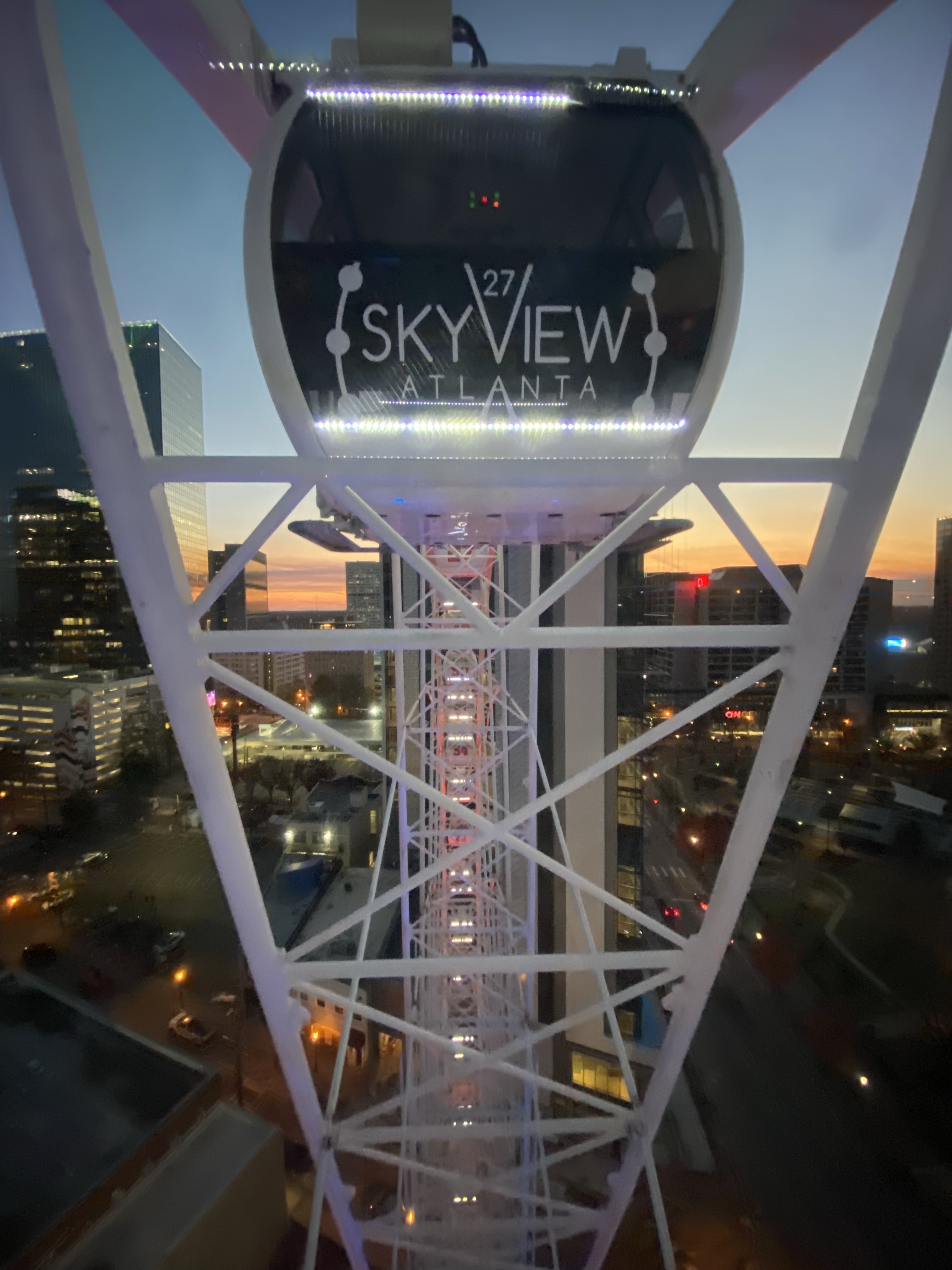 Following our route back we admired many urban art pieces, many seemed showoffy in front of the grand tall office buildings and hotels, seemingly ego statements, but impressive all the same. We timed our ‘Date Night’ ticket on the Sky View Atlanta wheel perfectly, not just because of the choc’s we got in the deal but we, in the course of 5 spins of the wheel, saw an incredible sunset and reflections on the buildings. (in addition to the advert for Tasers!)