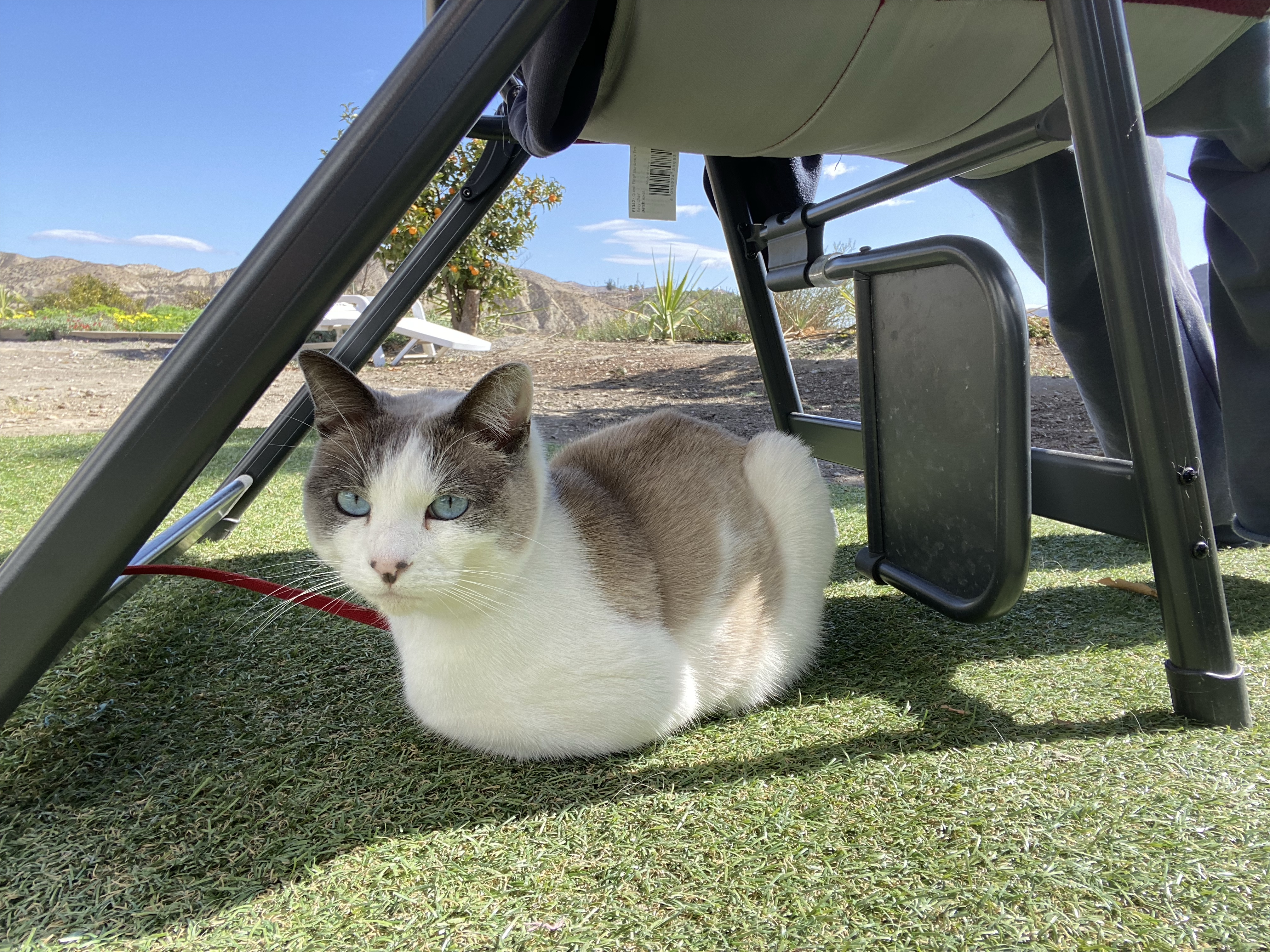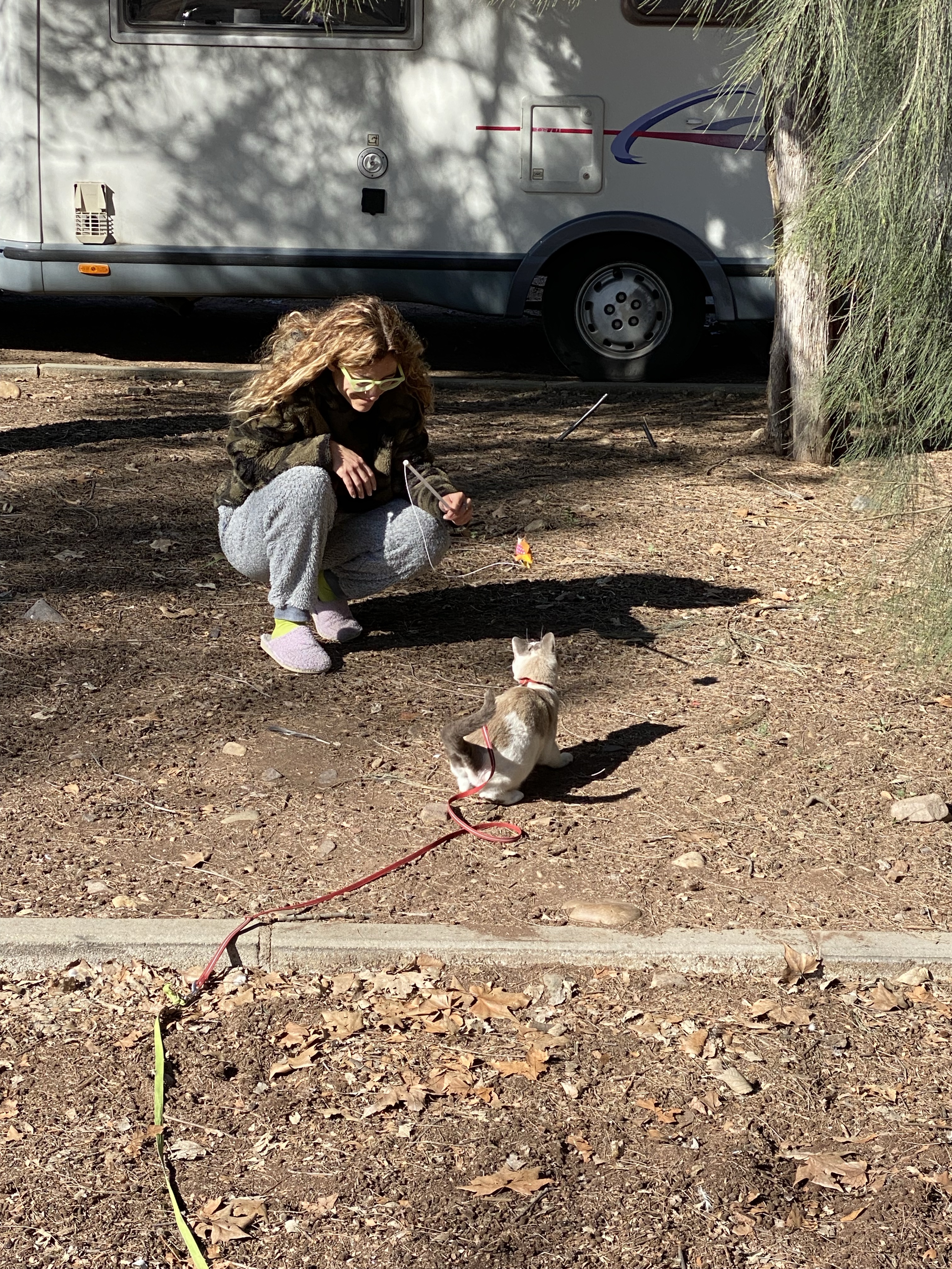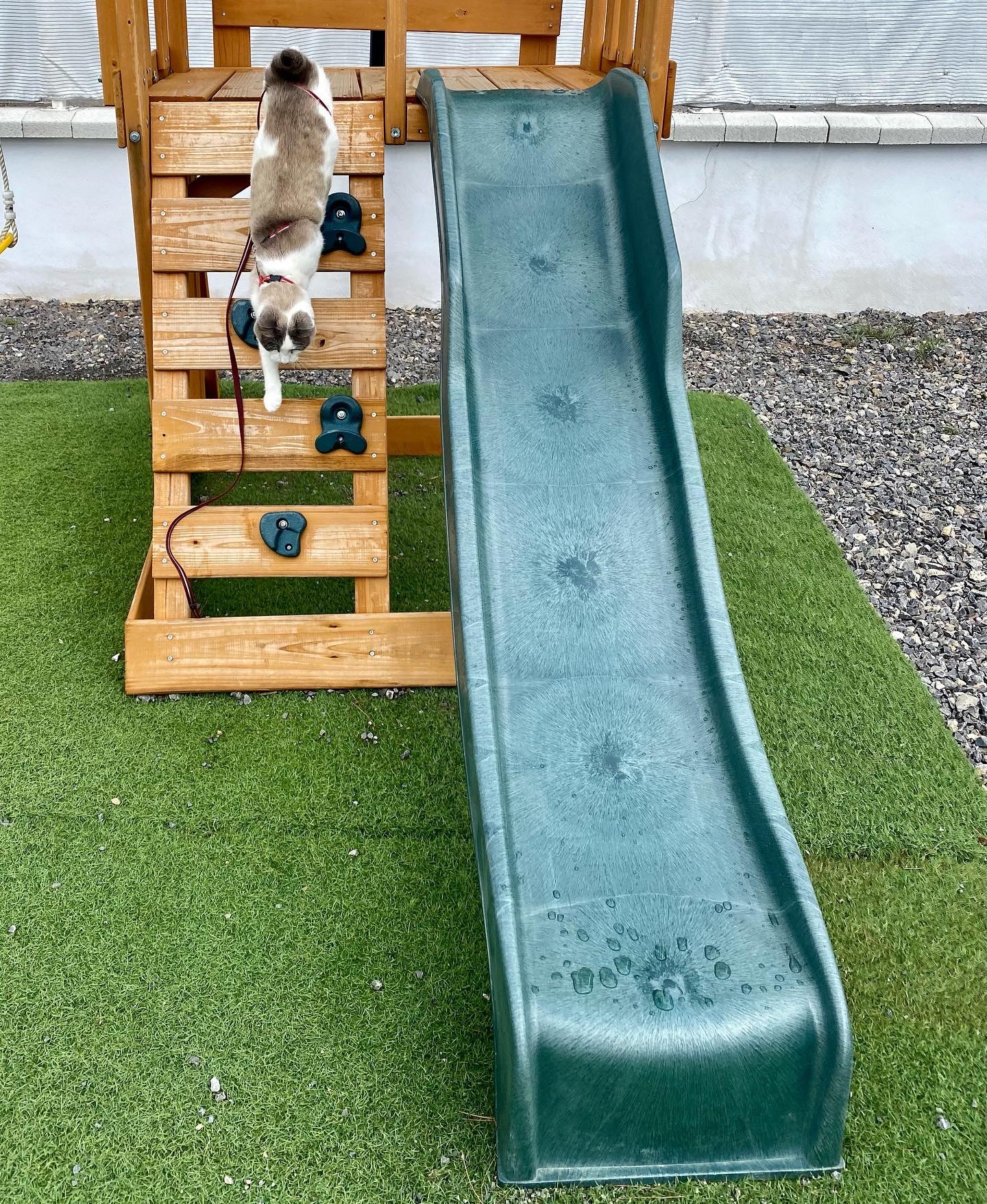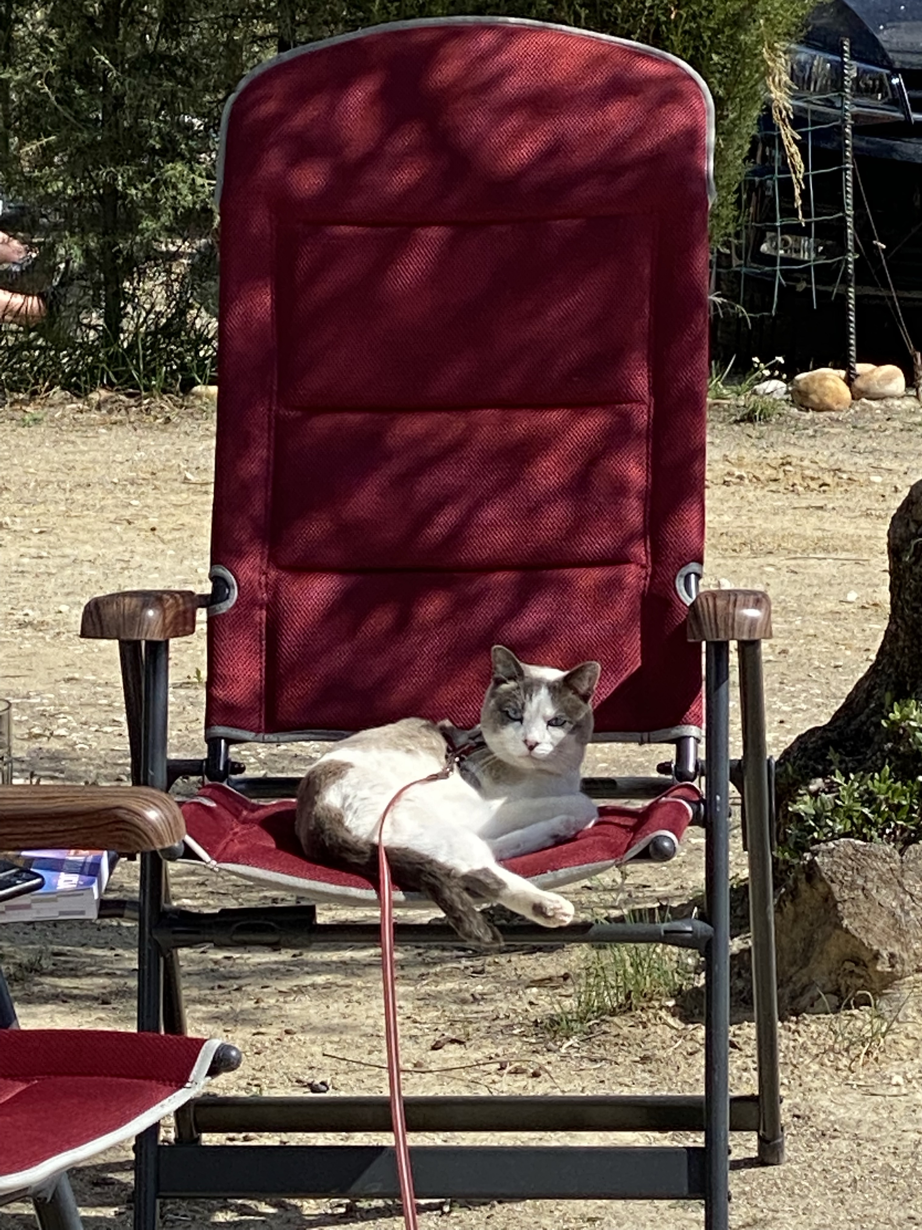 For the cat lovers among you, Jigsaw is fine. She’s come across quite a few other travelling cats and has seen off a few others. She’s getting quite adept at climbing tree’s and not so adept at getting down from them. She maintains her liking for rolling around in gravel and showing off to any human who wants to meet her. A Spanish lady even gifted her a little toy, you know how she can be charming at times with her blue eyes! One day she took ‘play’ to another level, trying out a trampoline and thinking about a slide.