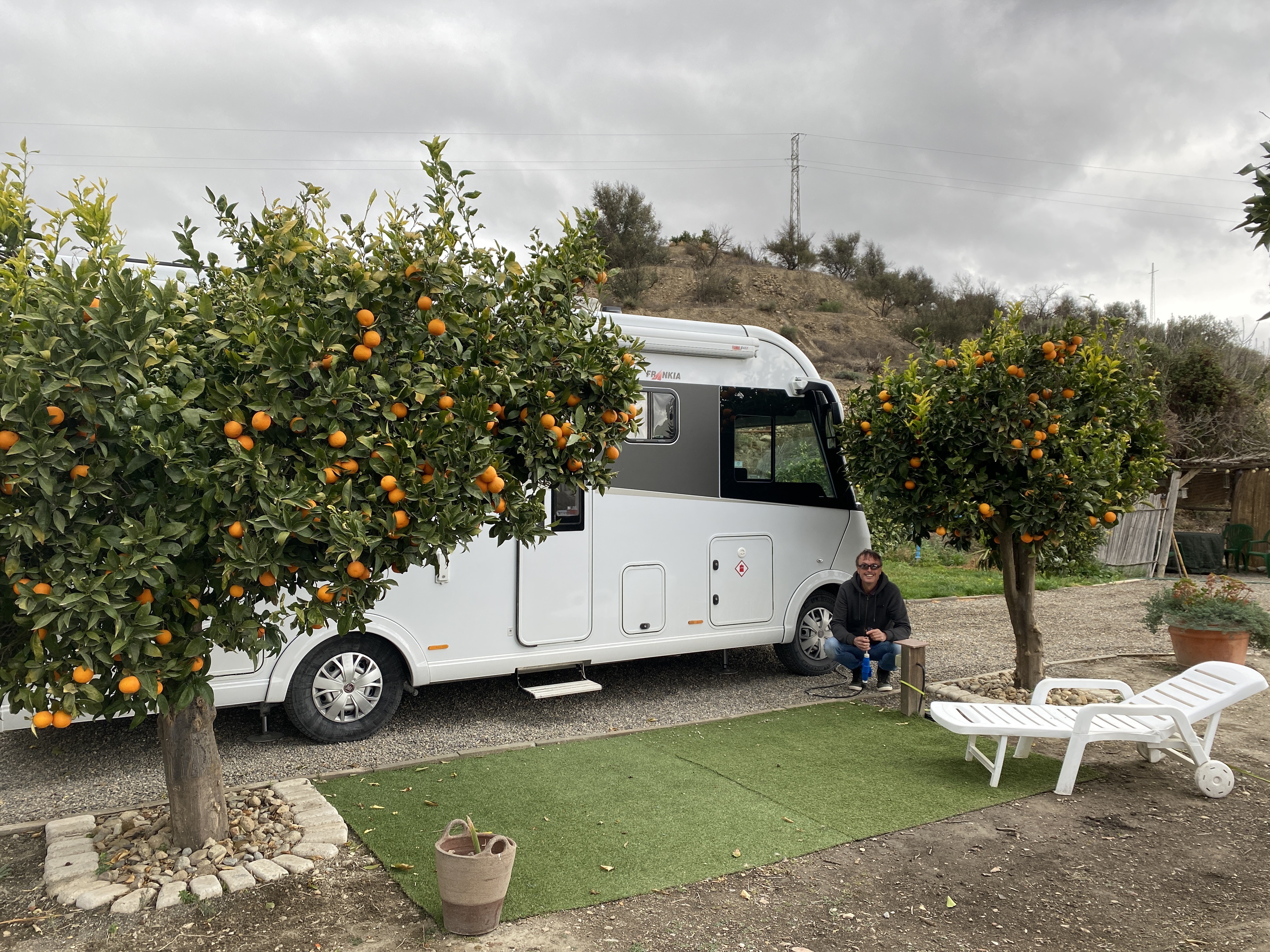 Travelling in the South East area we are naturally seeing different landscapes and that continued through Almeria. As noted, it is very like Death Valley, high, sharp edged, eroded mountains, arid land and a slight breeze carrying dusty sands. It is very wild west with lots of small seemingly deserted towns peppering the landscapes. Further to the west of the region we planned a few nights that became five as we enjoyed the area. Finding a campsite which only took 2 vehicles at any time between Terque and Bentarique we were in a gorgeous spot among the Orange trees on a small finca. Jigsaw was in her element in the trees, we were just scratched! Free oranges, fantastic mountain views, idyllic! Heading out on the bikes we landed at Bar Yolanda and toasted our luck!