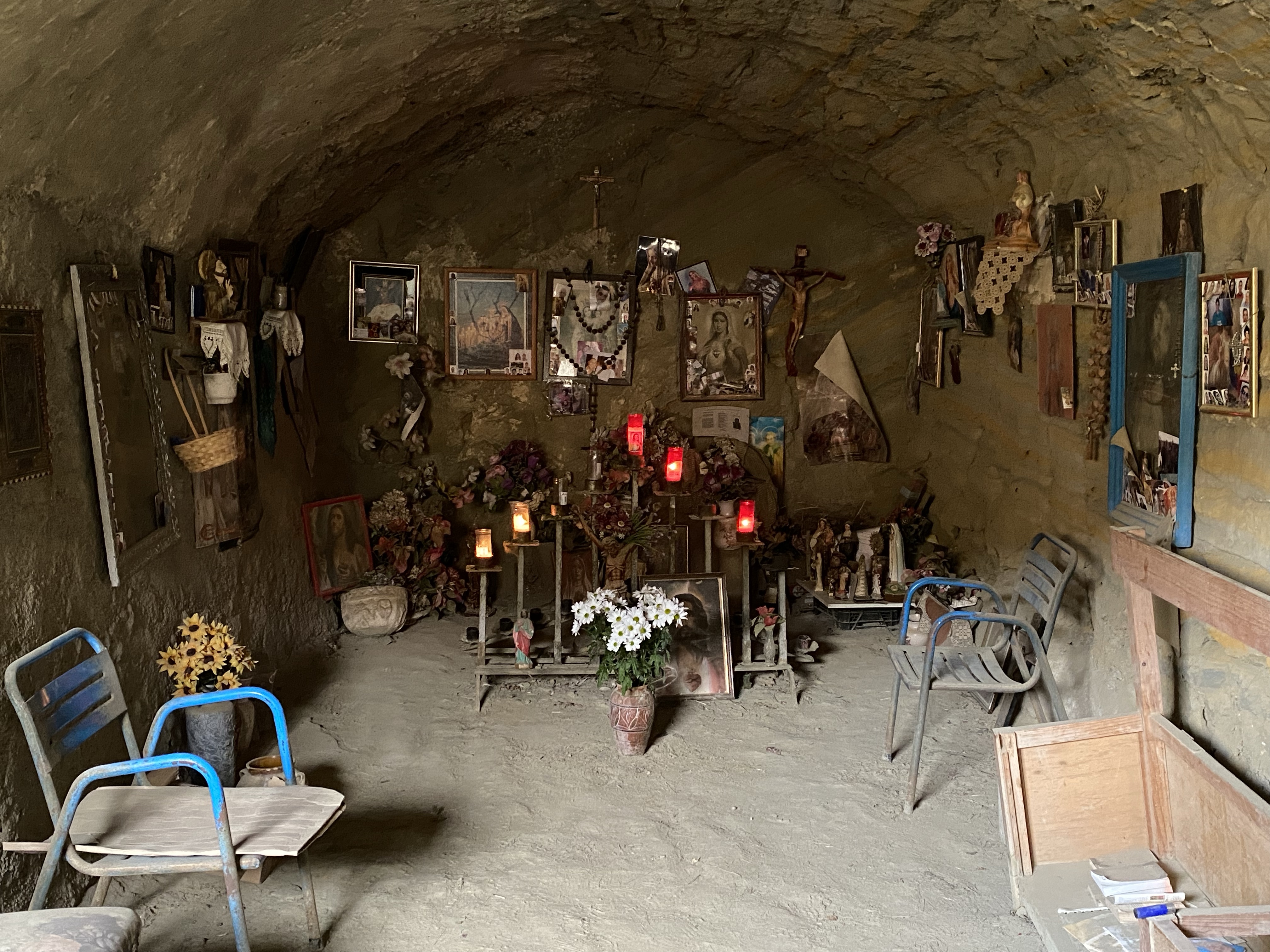 The Andarax river valley area has a string of charming villages a few miles apart. The villages all have Roman origins, when baths were the main focus it seems but it was the current appearance, white walls, narrow streets and bougainvillea colour are undoubtedly Muslim era. The whole area is full of swathes of Orange trees and Olive trees, the late afternoon aromas of Orange blossom at this time of year are glorious. Being close, we were able to get out on the bikes a lot and explore. Alhabia is very well known for its cave houses and they are scattered around the small town, evidenced at time by the unique hoodoo style chimneys. They certainly bring a distinct character to a town that is more alive than some of the others. Emerging from the narrow car free streets on the bikes there is a town carbuncle however, a huge unfinished development of holiday apartments looms, grey. Apparently the developers sold the flats off plan and ran off with the money leaving a shell of a building that will no doubt someday be demolished, if it doesn’t fall down. Its already been there over ten years. On a tiny track we found The Virgin Mary Caves, a couple of tiny caves, a tad unsettling but very much alive with visitors evidenced by lit candles. It is supposed to have healing qualities to visit so attracts coach tours for the vigil.