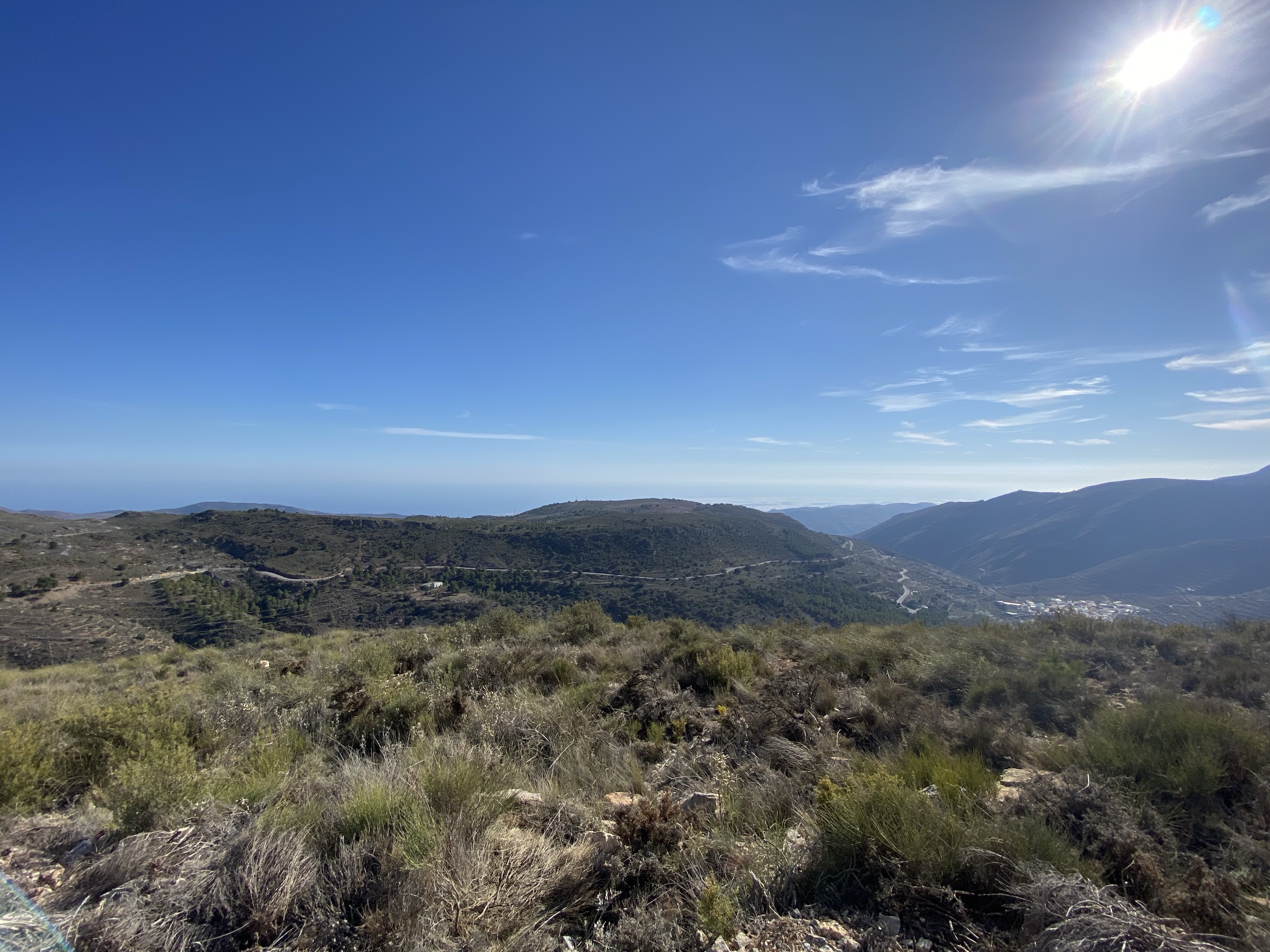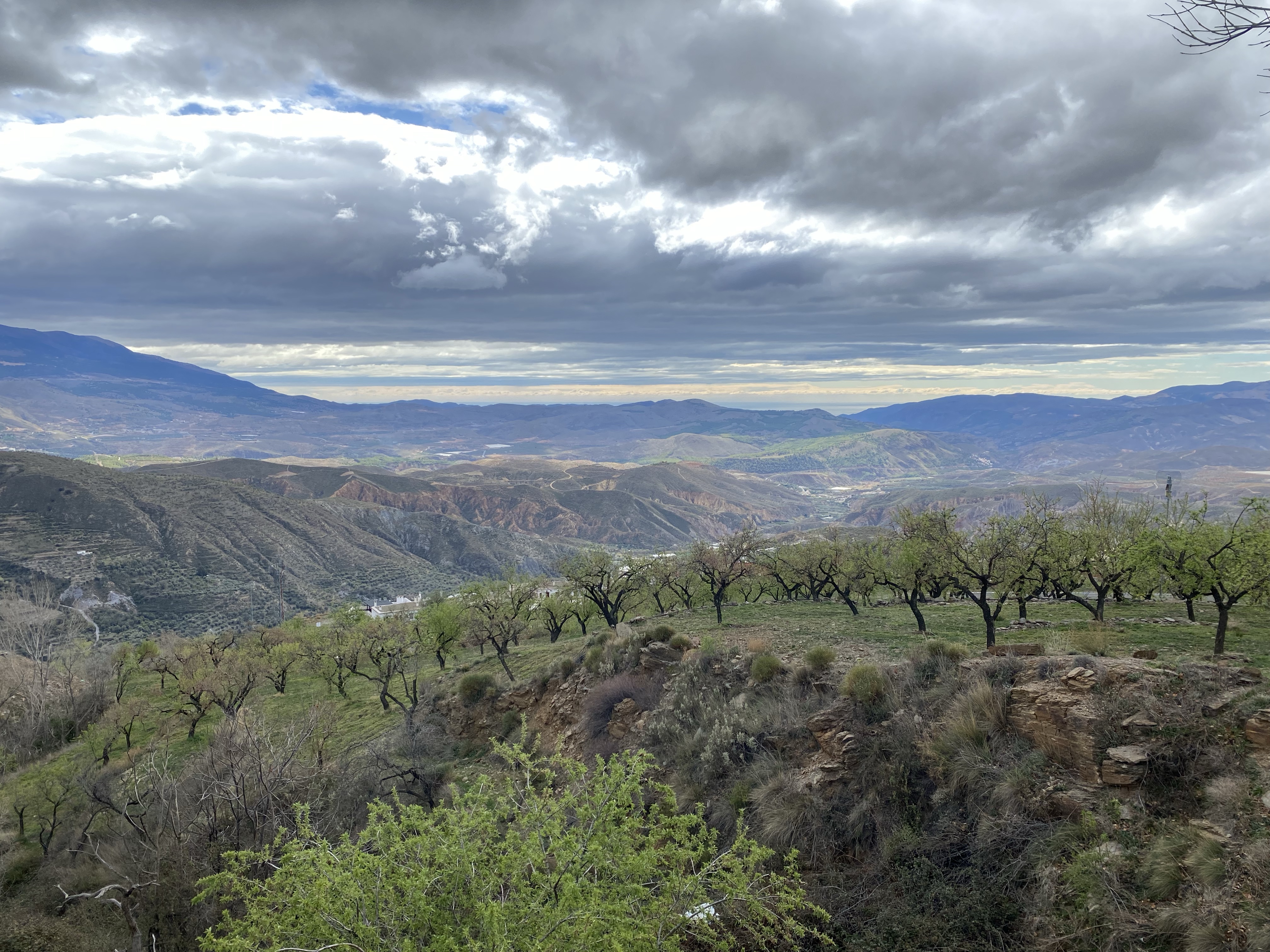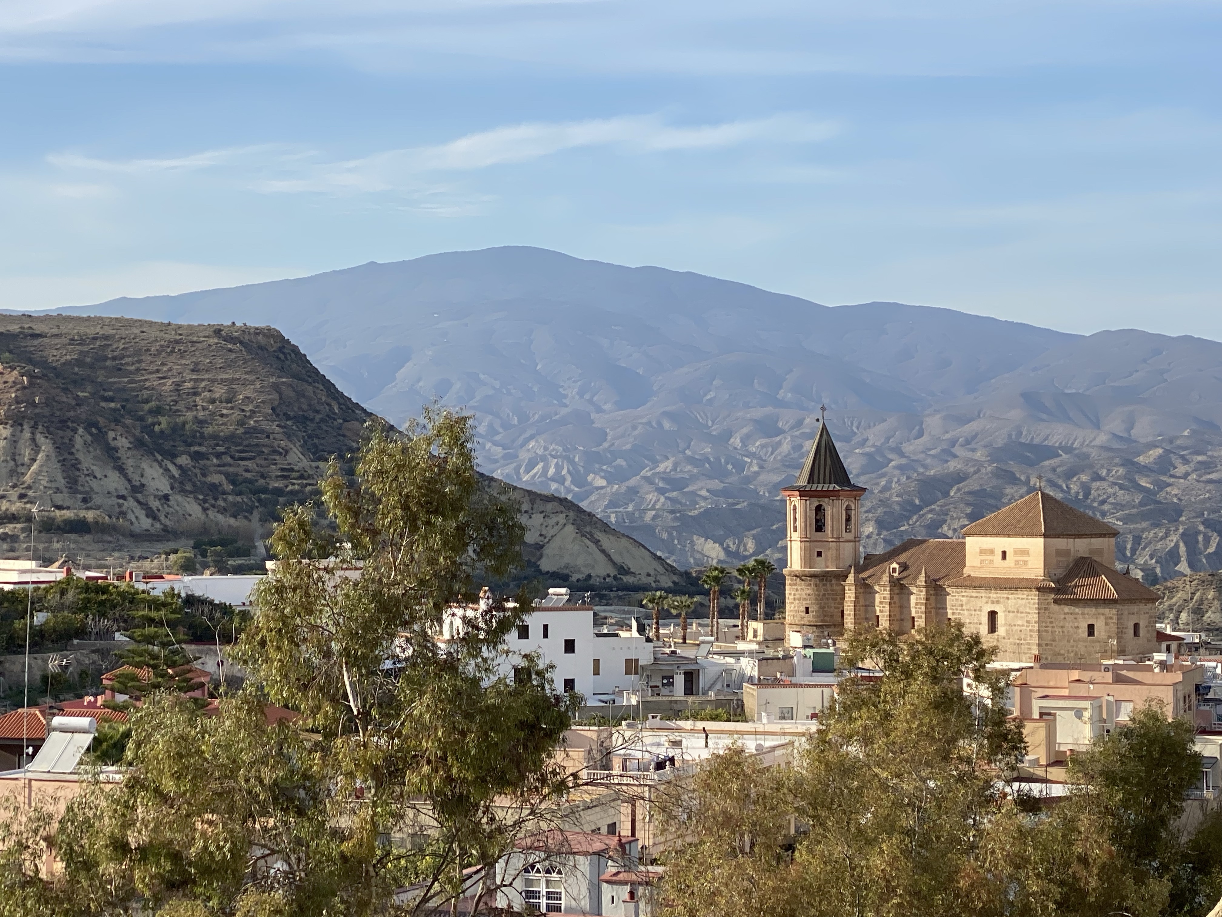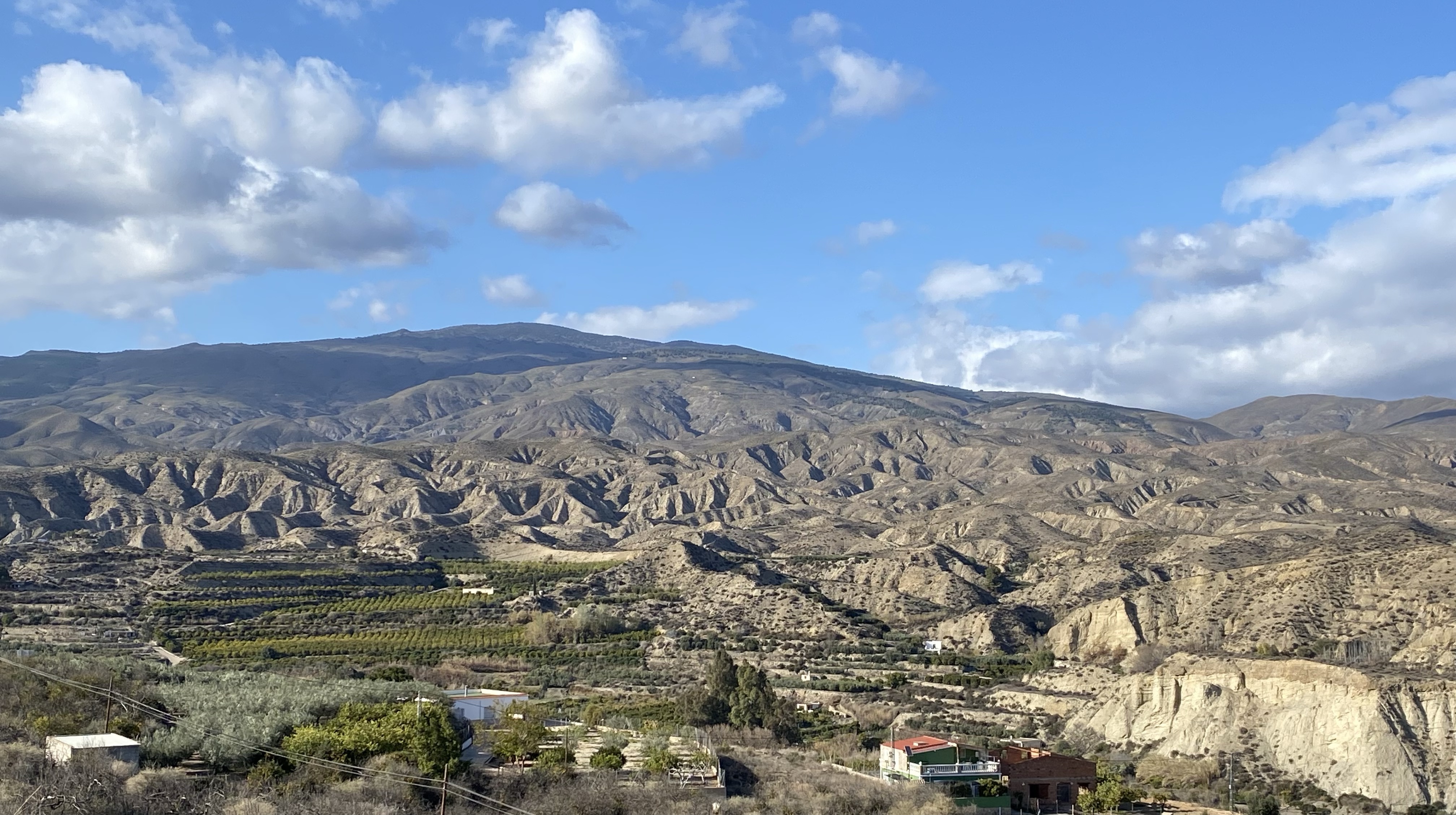 The area has some great cycling. We headed out on a track through a tiny village called Huecija and it felt like we just climbed and climbed through some incredible landscape changes. We did, the altitude app had us at 3615ft at Enix view point among the wind turbines. From there we could see the sea, the town of Vicar and beyond, the vast swathes of greenhouses producing Europe’s fruit and veg. Google Earth is a good way to see its scale. Anyhow, a great ride, a lot faster on the return but fulfilling. We learnt about Orange tree management and why they look like donuts from above, post harvest.