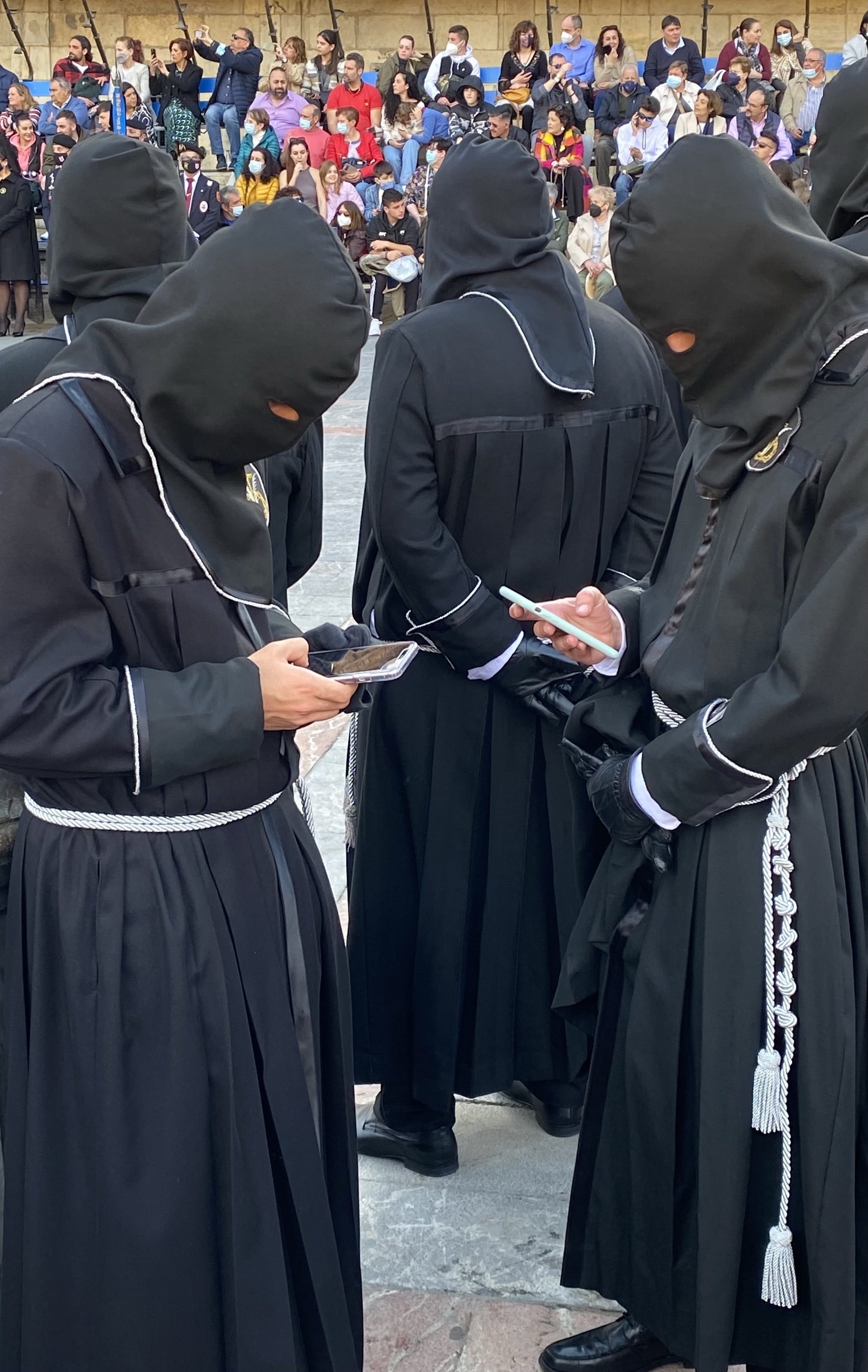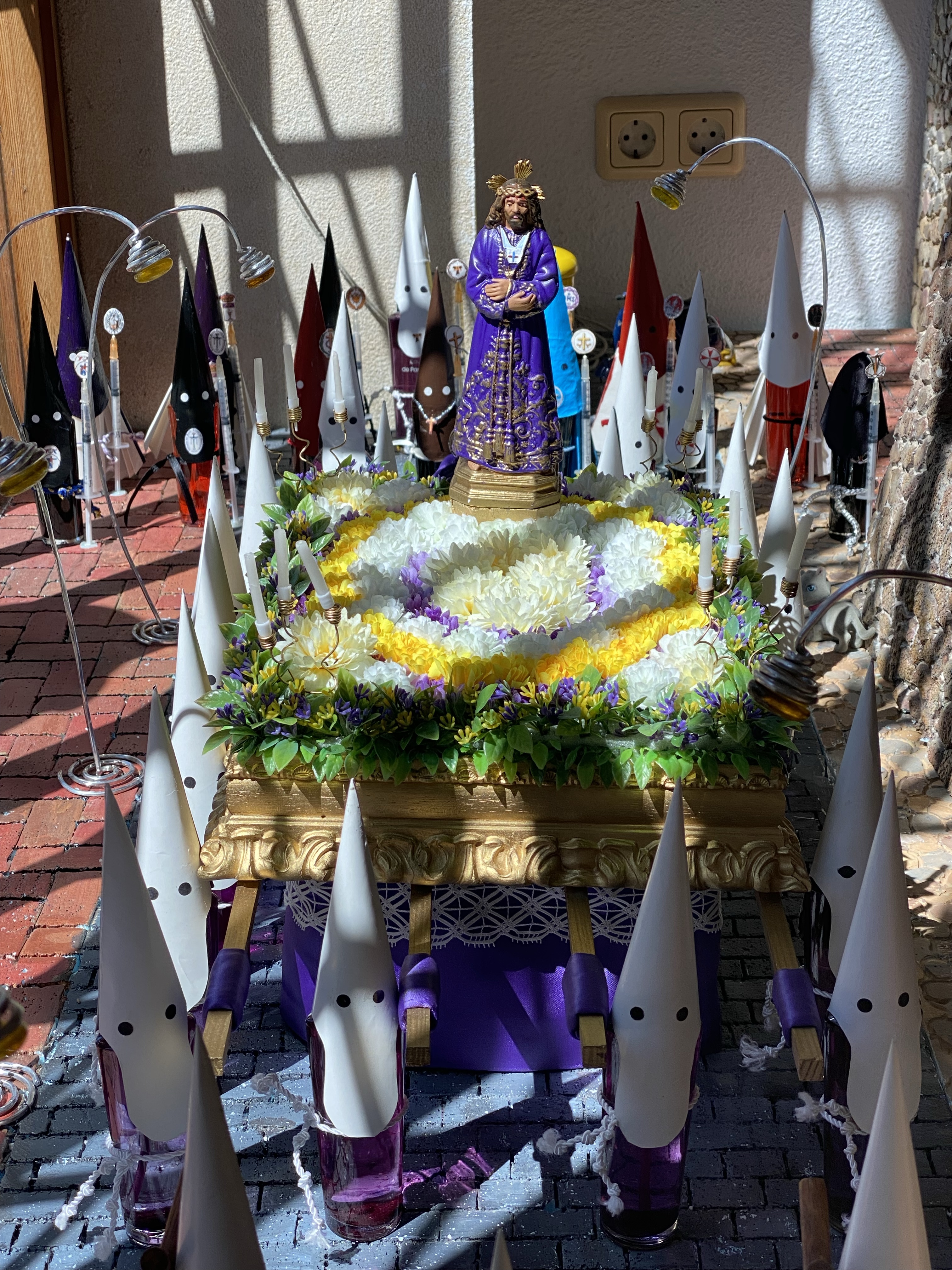 Mi Spanish improving, I was able to converse a bit more and understand! Religion in Spain, I was told, isn’t the force that it once was, especially among the young, but Semana Santa (Holy Week) is still highly popular and respected across all generations. It isn’t seen as being a sorrowful procession of solemnity as it’s easily viewed, but a celebration and a coming together of friends and families under an umbrella of a serious message about love, forgiveness and understanding. It’s easy and frankly lazy to see it with “Oh my goodness” comments when first viewing the clothing, the pointed hats and gowns and covered faces. We own up to that comment ourselves, before adjusting our thinking and realising our own ignorance. These are just traditional costumes going back to the C17th that have sadly been negatively appropriated by as certain US group. It is the same as the appropriation of the Swastika symbol. When seeing the parades for the reasons they are intended it induces quite an emotion, not of sorrow but of amazement and joy at the togetherness of the Paso carrying Costaleros, Penitents, musicians etc and the pleasure they all take in the involvement.