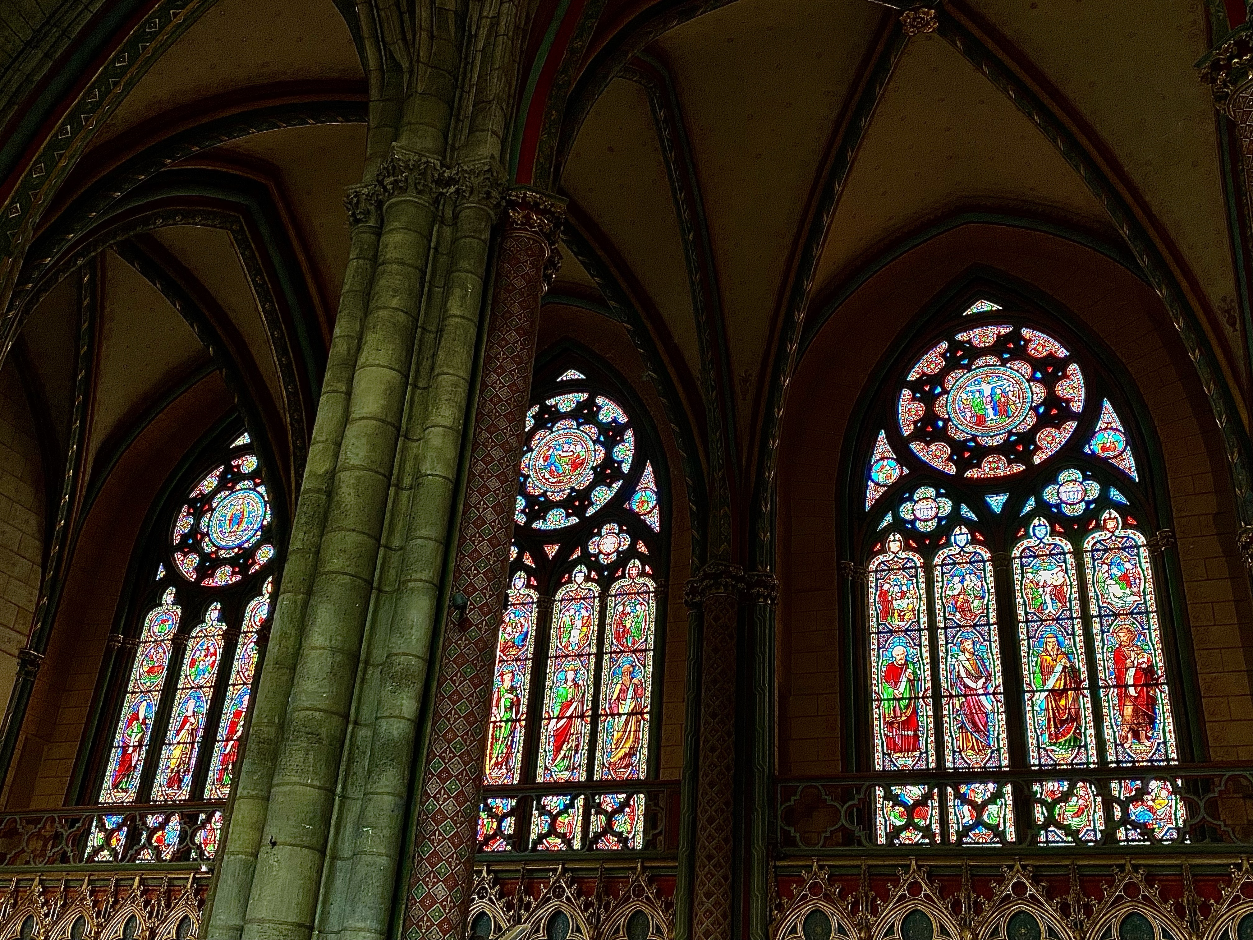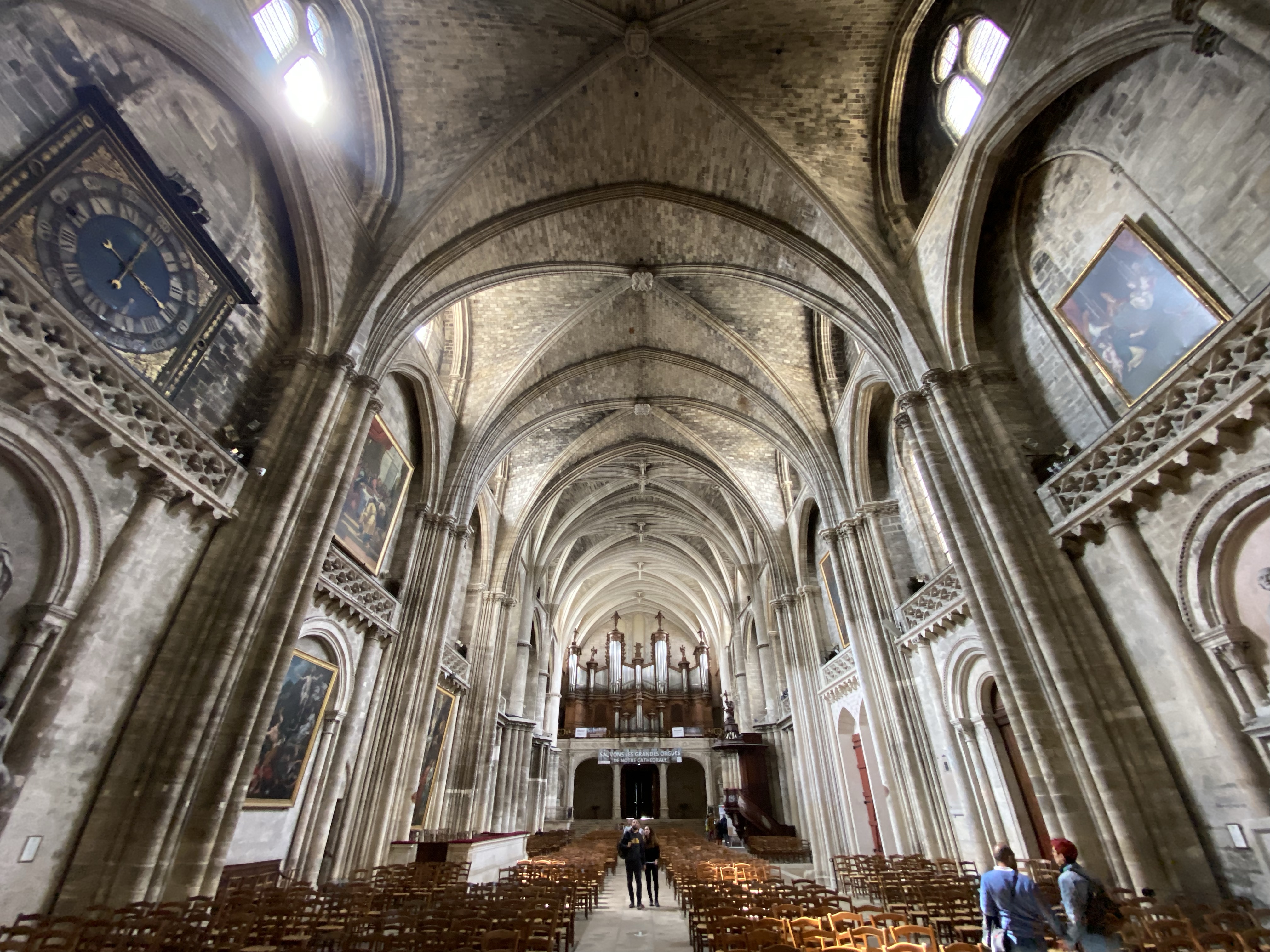 Wandering into the town, being a bank holiday there too, it was bustling with people out enjoying the weather and a get together. We didn’t have any specific places we wanted to visit other than the Cathedral so just explored and found what we found. Nor did we find out why there was an oversized head in the ‘Grands Hommes’ area, perhaps just because of the part of town or maybe a Macron self sculpt?! In Vieille Ville, the French restaurants were so obviously French with the wooden external doors and shutters and everything cooked in duck fat! (kidding!) The Grosse Cloche isn’t a gross clock but actually c18th bell set in a Disney style double towered building, part of the city gates infrastructure, once housing a dungeon for juveniles. That’s when times were really bad, pre mobile phones for kids… Next door was the smaller Gothic, St Eloi Church, the plain and simple interior offset by beautiful stained glass windows.