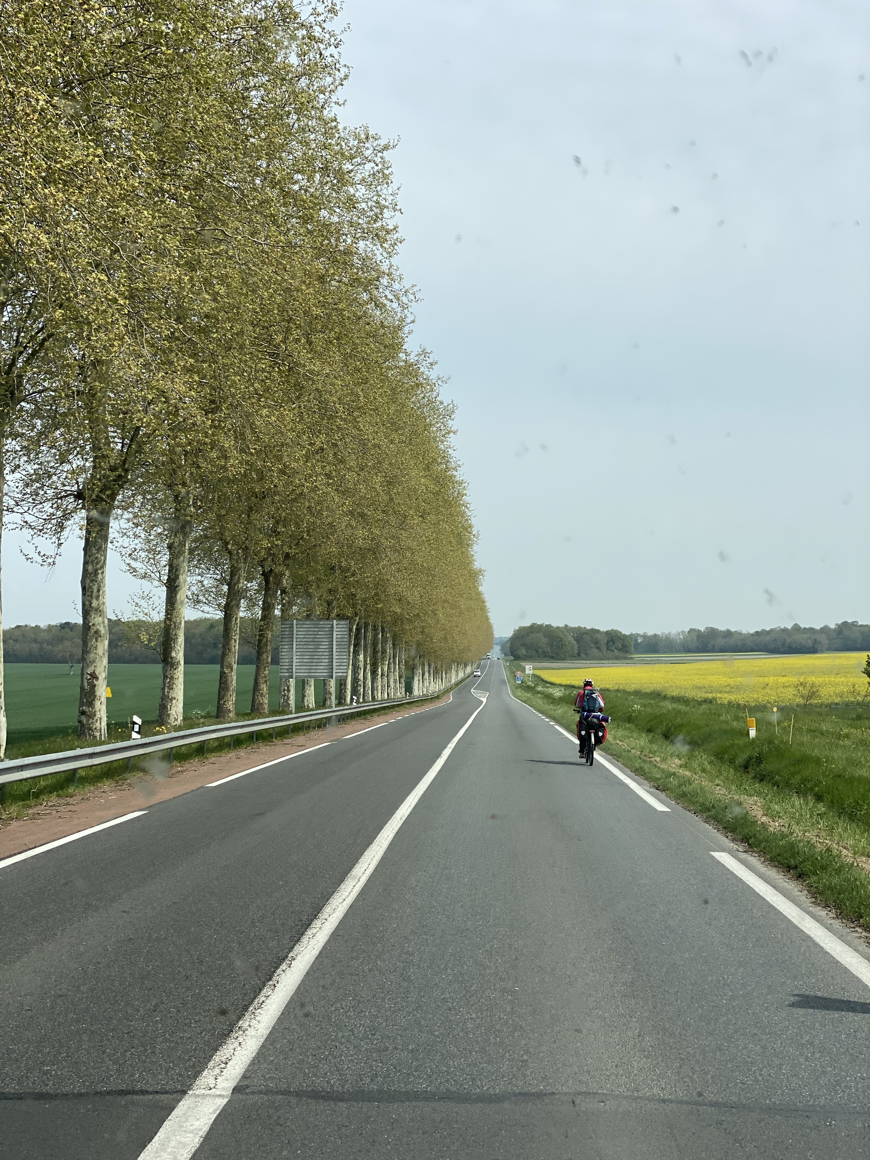 Having limited time to get back we were on the long toll roads, rolling fields of oilseed rape, agriculture and grain silo’s towering like cathedrals in the skyline. Other sections were as dull as the M6, trees and banking hiding any possible view. [sorry, the M6 north of Manchester is never dull :-)] We did find possibly the best ever Jigsaw spot to stay though, she was on her uber long lead with nothing to get tangled around, proverbial cat in her element!