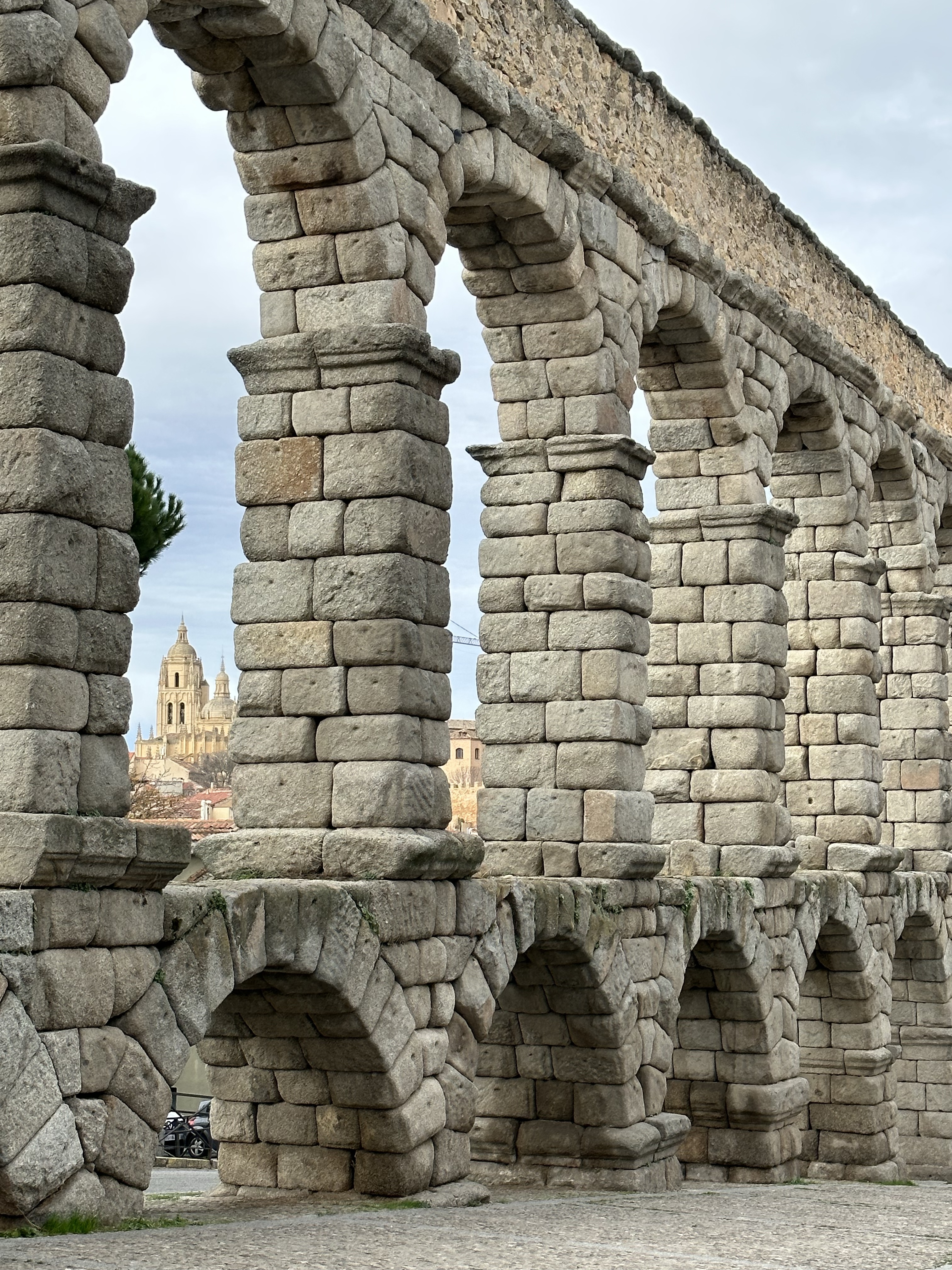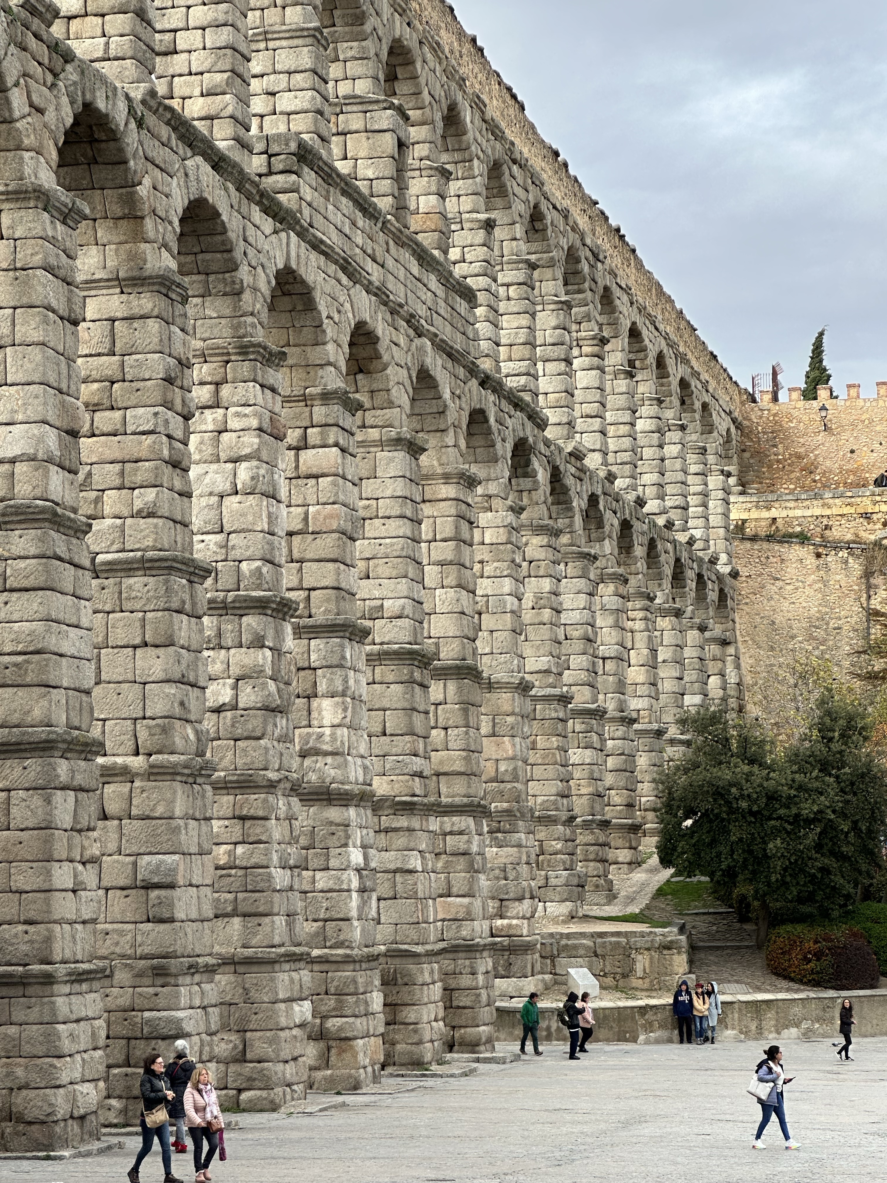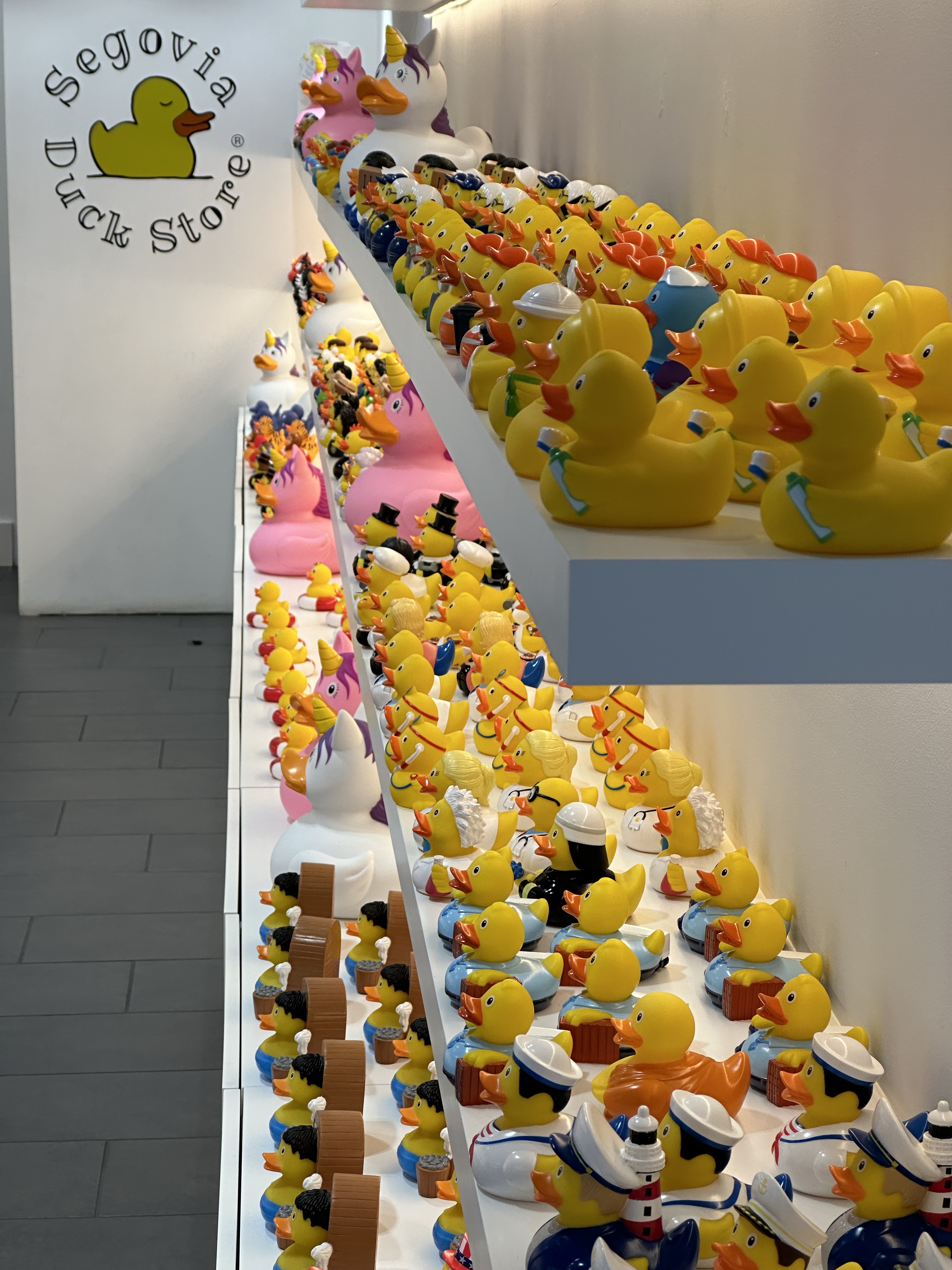 Segovia is a city we’d not had on our radar but what a place. South of Burgos its famous for three pretty spectacular elements; Its Roman Aqueduct, Its Cathedral and its Alcazar. Parking next to the still in operation Bullring, we set off to explore and it wasn’t long before we were alongside the Aqueduct as unusually, it stretches through the town rather than skirting it. Towards the centre it gets taller and taller, eventually at its maximum it is over 28m. It is 167 arches, was built in 1st Century AD and was in use until 1973, water flowing form the mountainsides into the city. It really is a sight to behold and remarkably, there’s no mortar used between the blocks of stone. From there we wandered the Old Town streets, coming across another unusual shop, selling ‘Ducks’, a mermaid sphynx and lots of lovely ornate touches.