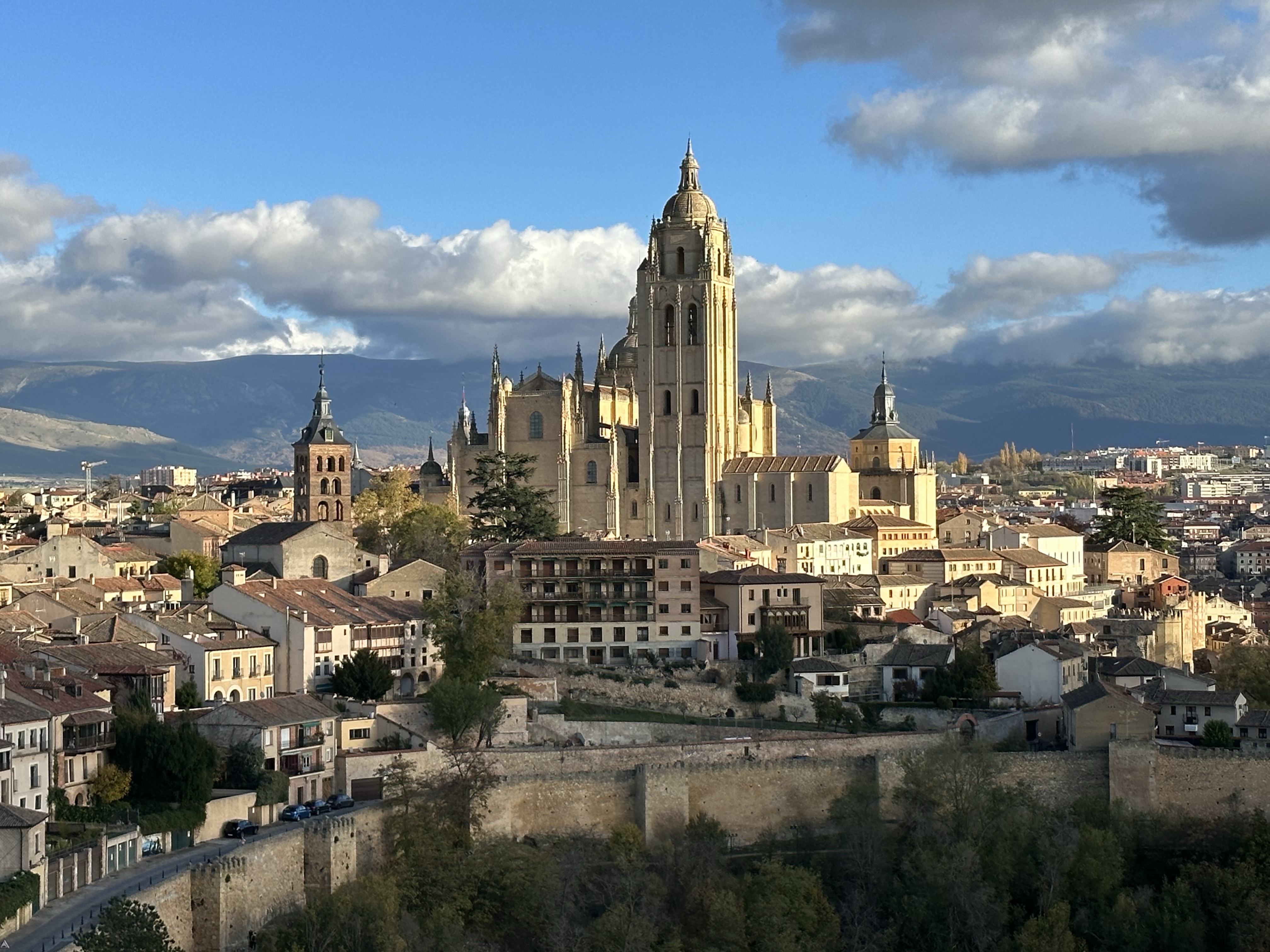 Segovia Cathedral is quite different to Burgos, tall pillars giving to a very open and ornate interior and a spectacularly complicated exterior array of towers built of a warm stone. The Bell Tower is 90m. Internally a magnificent array of chapels, a sumptuous Chapter House, an unusual ‘Chariot’ and a favourite, an allegory of ‘The Tree of Life’. The painting depicts a riotous party in a tree while a skeleton hacks at the trunk, aided by the devil, whilst Jesus stands by ready to ring the bell. On a lighter note, we felt the female headed serpent needed some moisturiser!