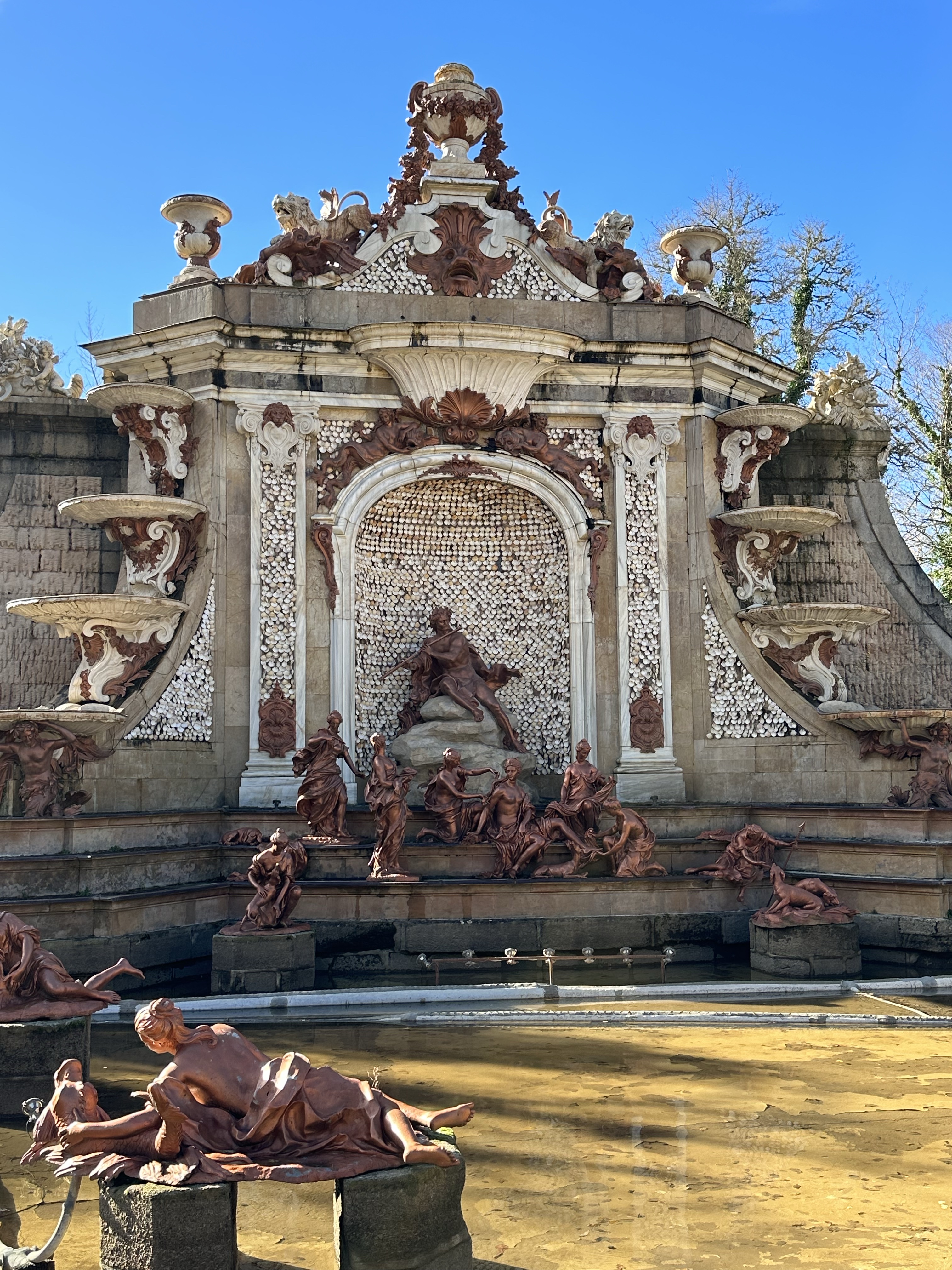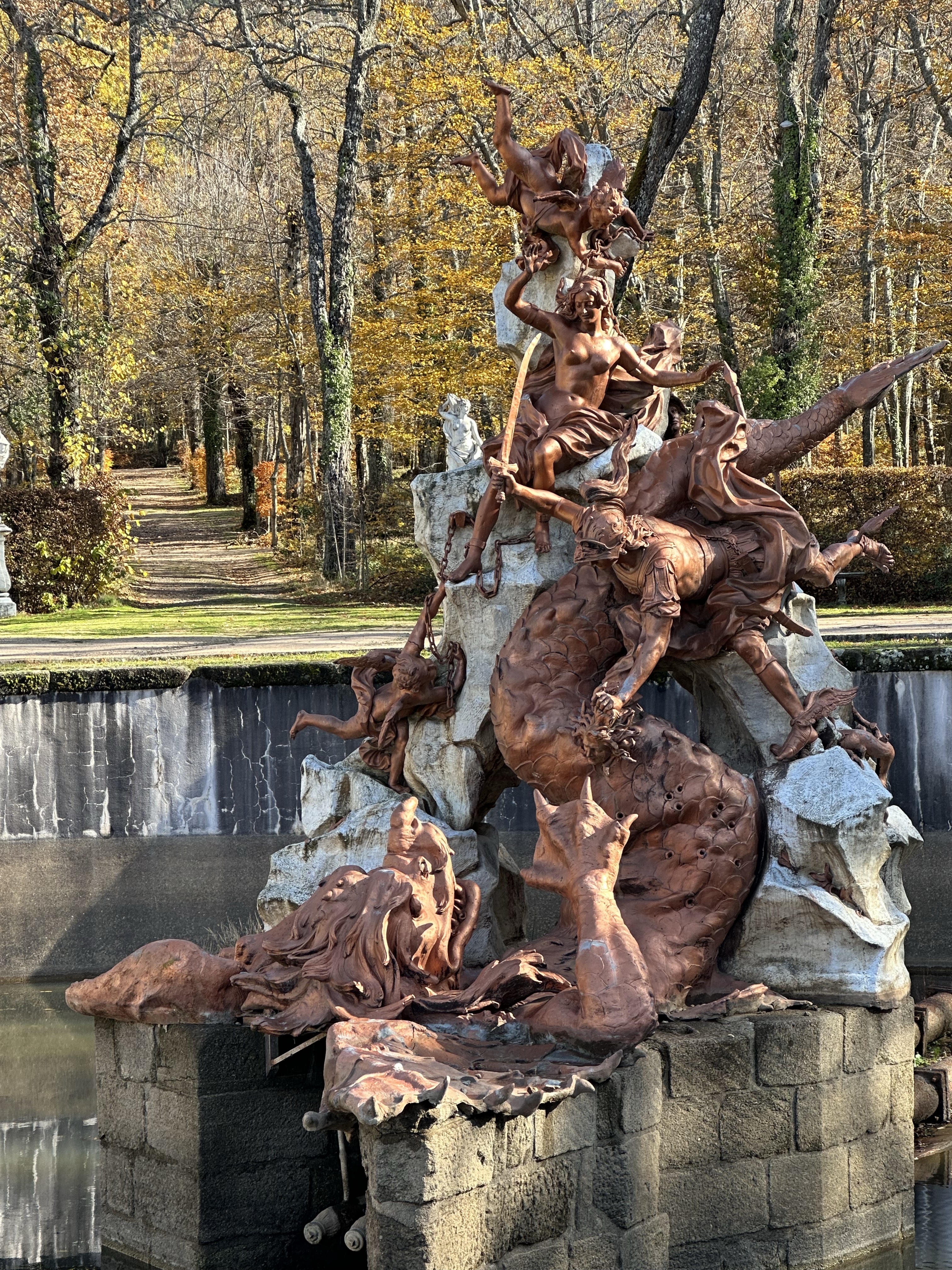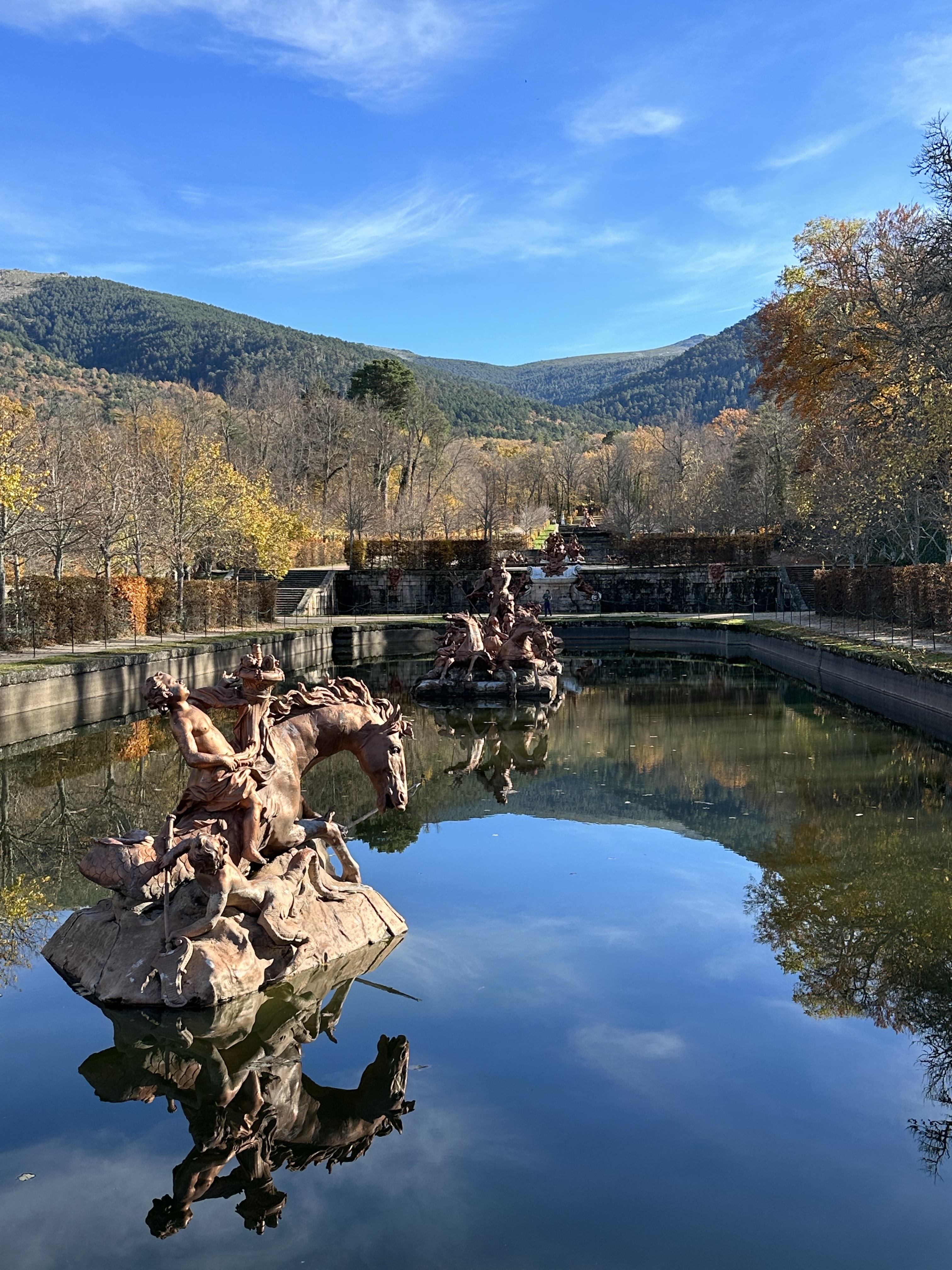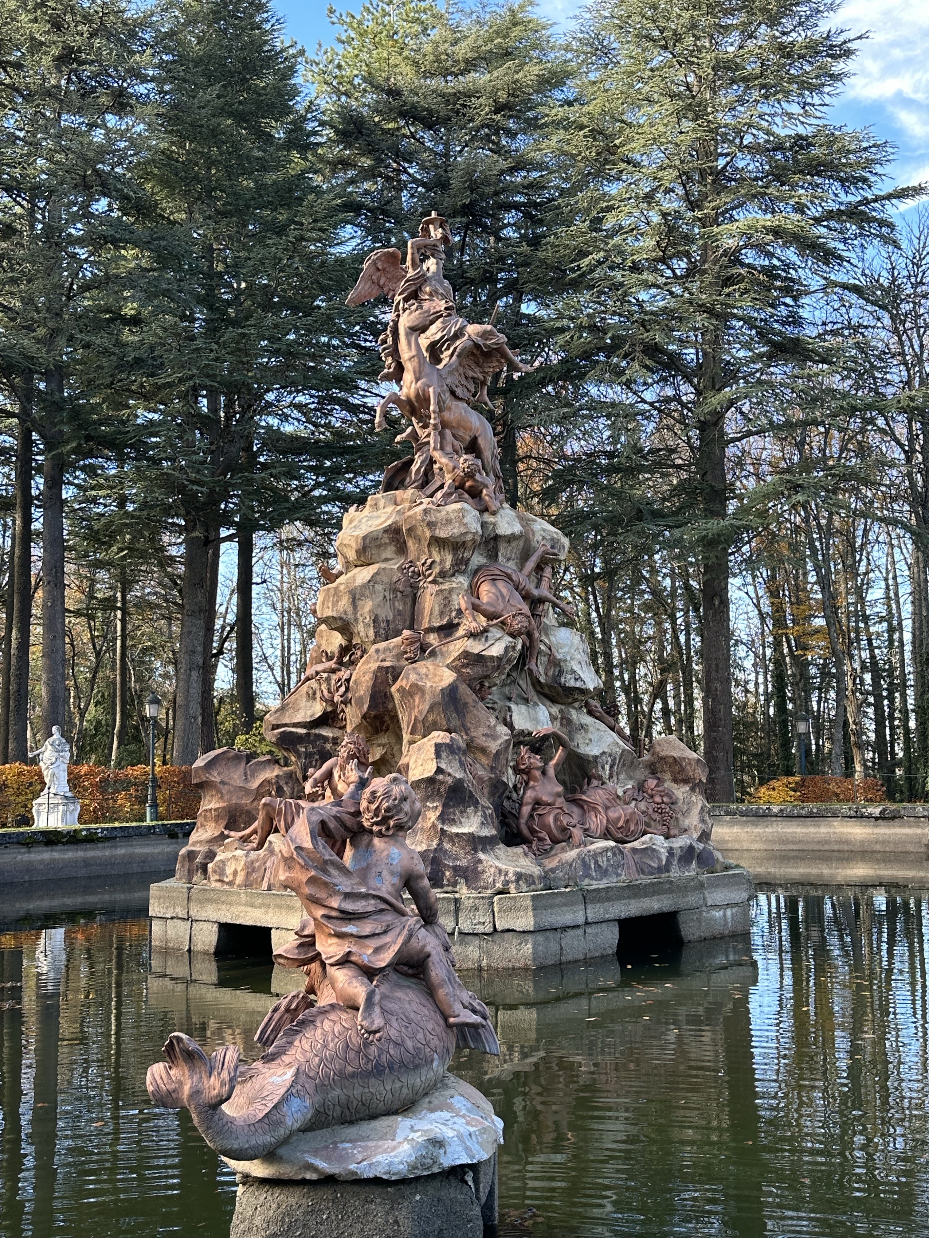 Not far from Segovia is Real Sitio de San Ildefonso where the Royal Palace and Gardens have to be up there as one of the best gardens we’ve ever walked. Known as The Spanish Versailles it was designed in French style in the early 1700’s for Felipe V and reflects the formal designs of the time. It became the summer residence of Kings of Spain from then. An abundance of mountain water, an intricate plumbing system feeds 26 fountains and my word, these are M&S fountains. Made of lead and painted bronze they appear at every turn of the 360 acre garden. All are based on mythological themes, one of the best depicts Andromeda chained as a sacrifice to Poseidon, released by Perseus with Medusas head. Not sure where the Frog Fountain sits with that theme but the Baths of Diana did and reminded us of the Trevi. One of the tallest fountain is Source of Fame, which depicts Fame on a winged horse trampling envy, meanness, evil and ignorance. This was actually one of the prettiest! We spent hours wandering the avenues, taking in the glorious autumnal colours, listening to the birds and marvelling at the beauty of the place. What a lucky find, the ‘Irish’ has come with us.