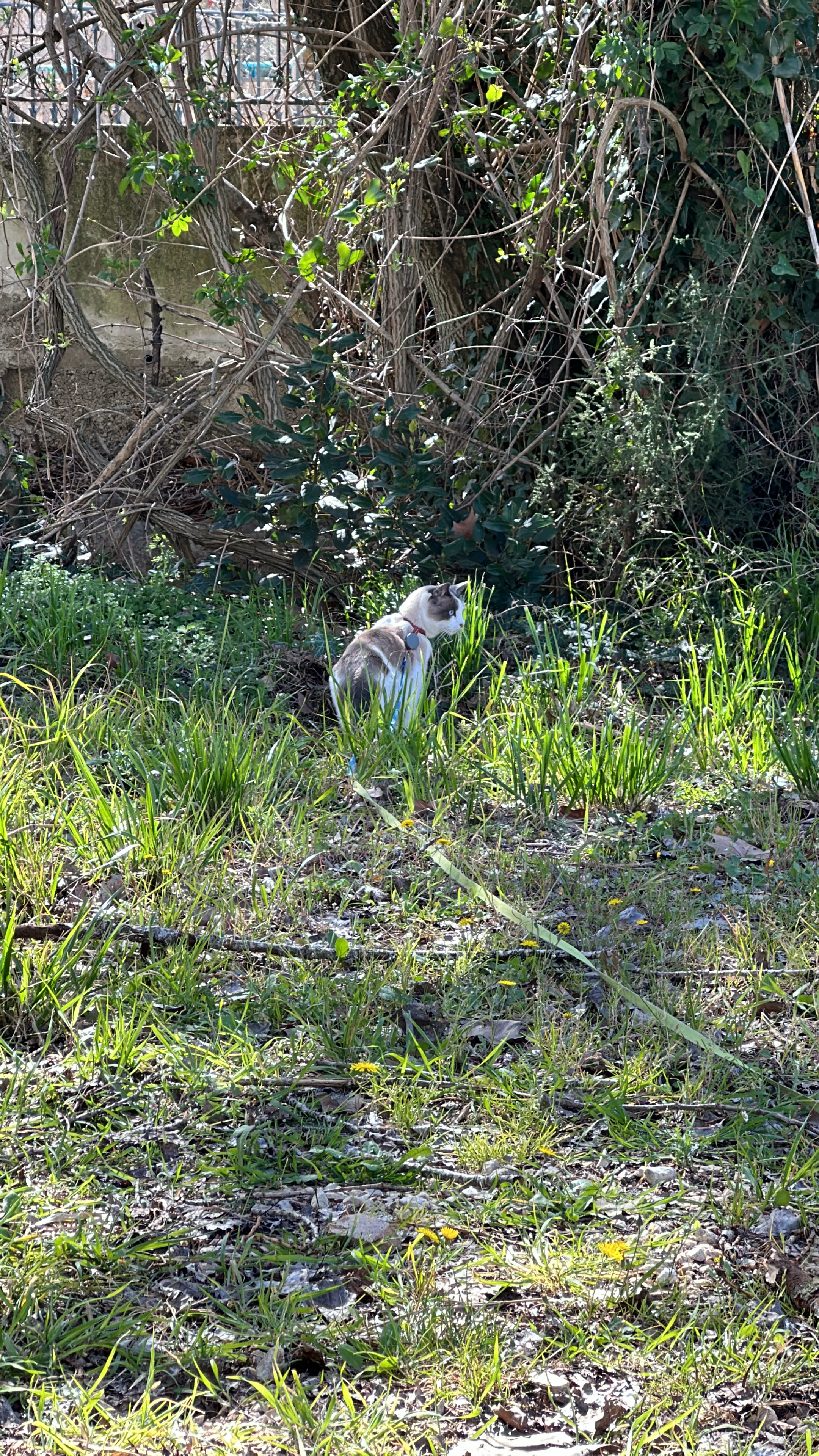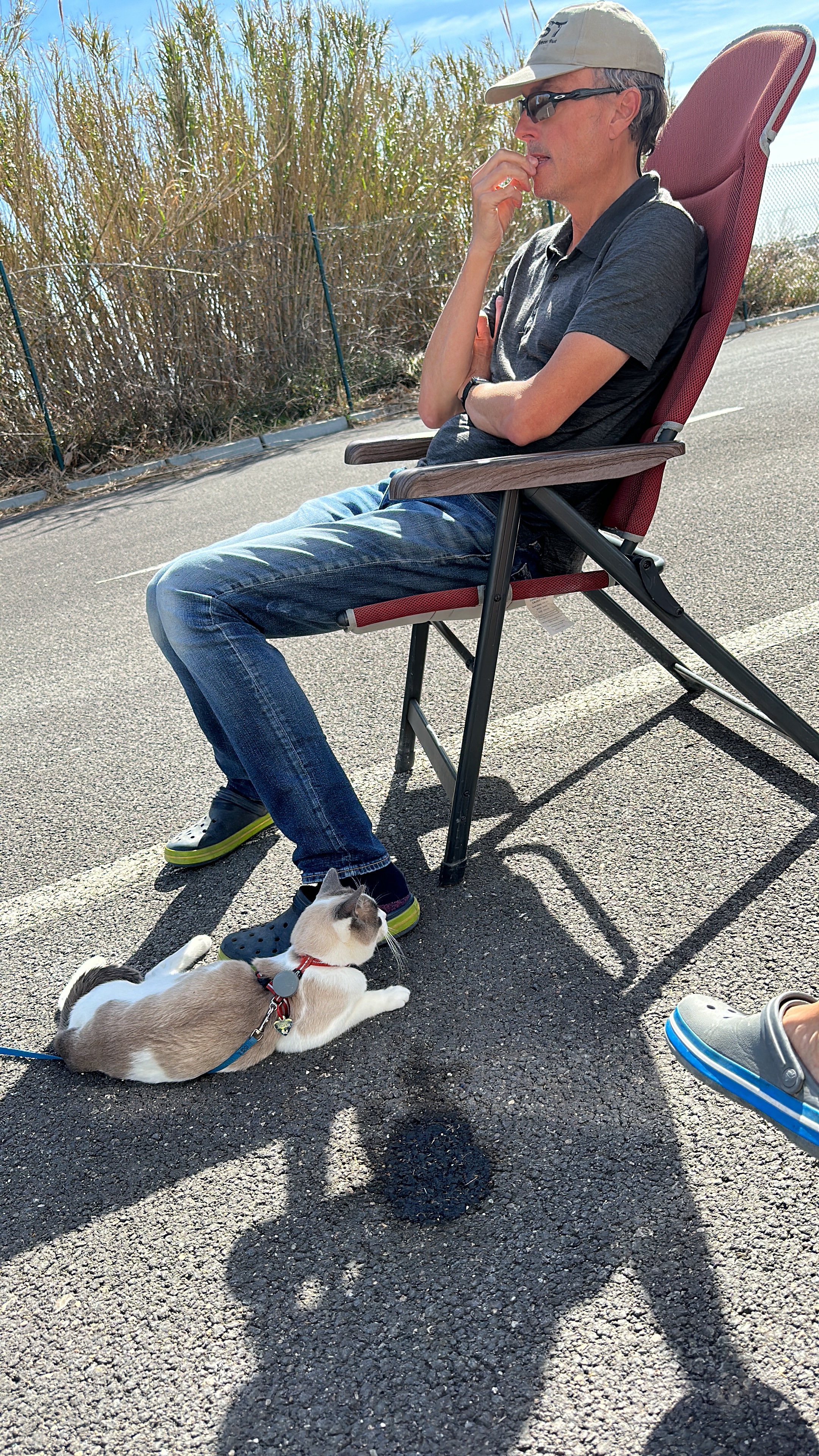 Jigsaw 1 – Mice 0 So far on this whole trip she’s been lacking on the mousing stakes. She said it’s due to the places we have parked up in, typical young’un, always someone else’s fault. Missing Bronwyn, Kelly and William at ‘The Ranch’ she spent time watching another horse being put through its paces, Spain style (i.e. no safety in mind whatsoever) before going face to face with a dog, twenty times her size, she’s no mouse! (We were glad for the chain fence!) She did spot another cat in a van so did some show off ‘arctic foxing’ but it ignored her so she went off in a huff into the long grass. While mooching around, she also managed to nose some oil (we think) so any tips for getting that off will be gratefully received or her model days are over! The tall one said that she’d told him she was done with all the teencat chasing of furries and that she planned to settle down into middlecatness for a while, little does she know! As the feeder one, I continue with my duties in the hope that one day she’ll sit on my knee. Anyway, that’s unlikely as I’ve just booked her in at the dentist so all I’m going to be seeing is teeth! And it won’t be a smile I can tell you!