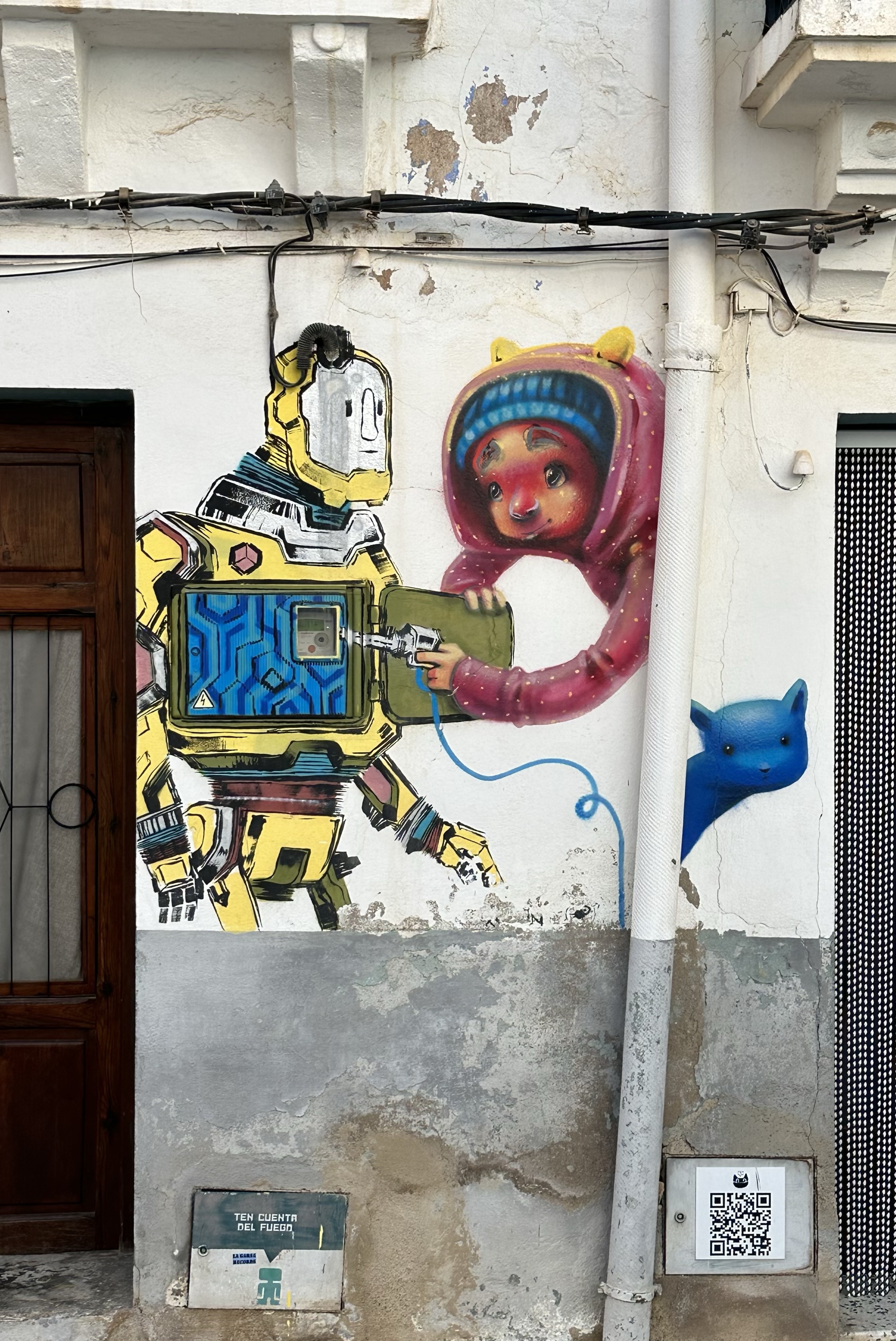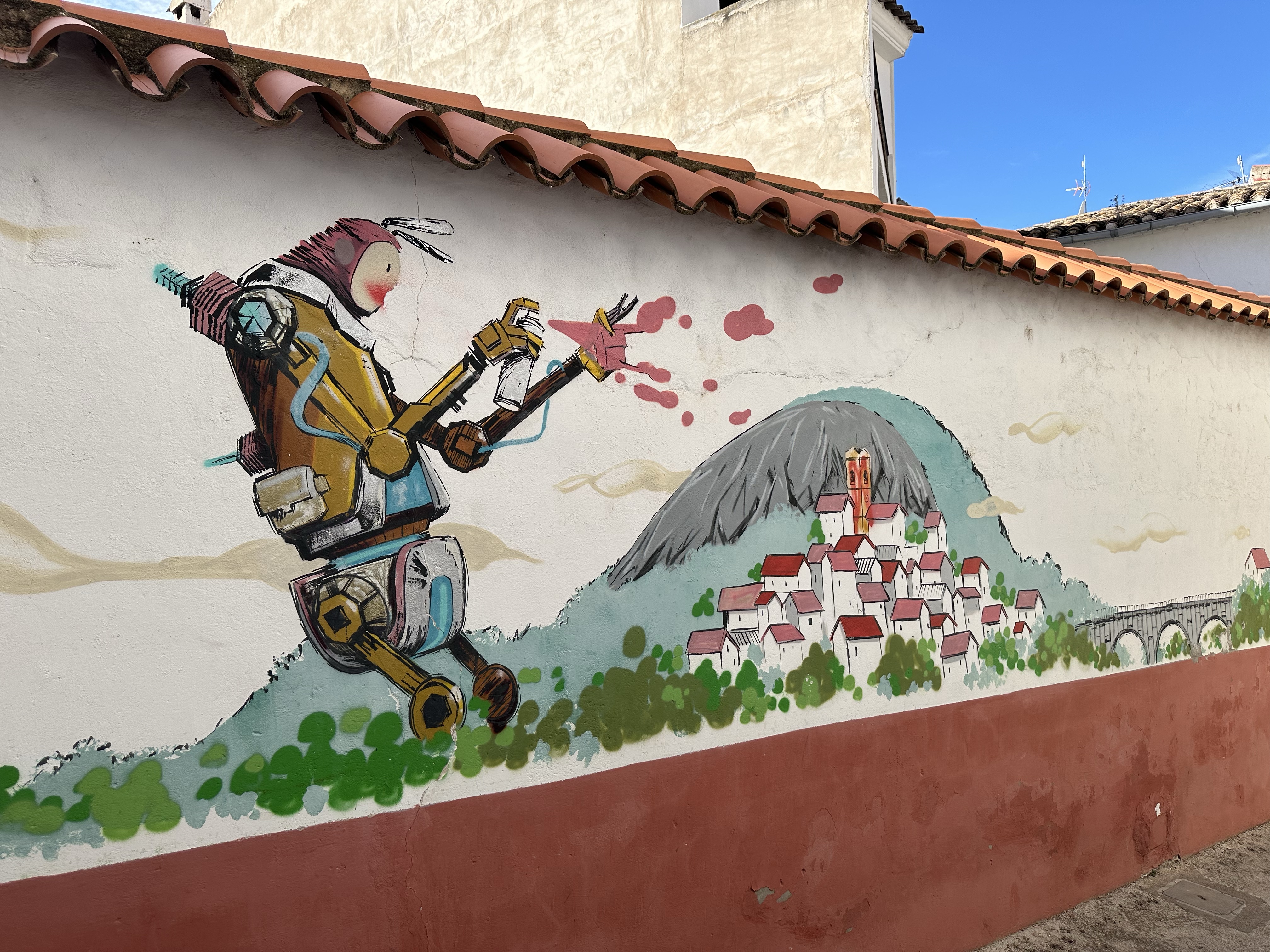 Fanzana is a tiny village in the mountains, 50km north of Valencia, home to c. 300 people who like spray paint it seems. Transforming itself from a dying village to to the street art capital of Spain, it’s wonderful. An annual fiesta brings top artists from all over the world and the village has become a huge open air gallery. The nicely cat referenced MIAU (Unfinished Museum of Urban Art) started the movement in the town, which as a pre requisite, must involve the community in the creative process. This built the trust of the aging residents and the star was born. So many pictures, you’d be bored, but we had a fabulous few hours wandering the streets and marvelling at the talent. Our own contribution was a pastry and coffee at the one cafe in town, and a fresh bread!