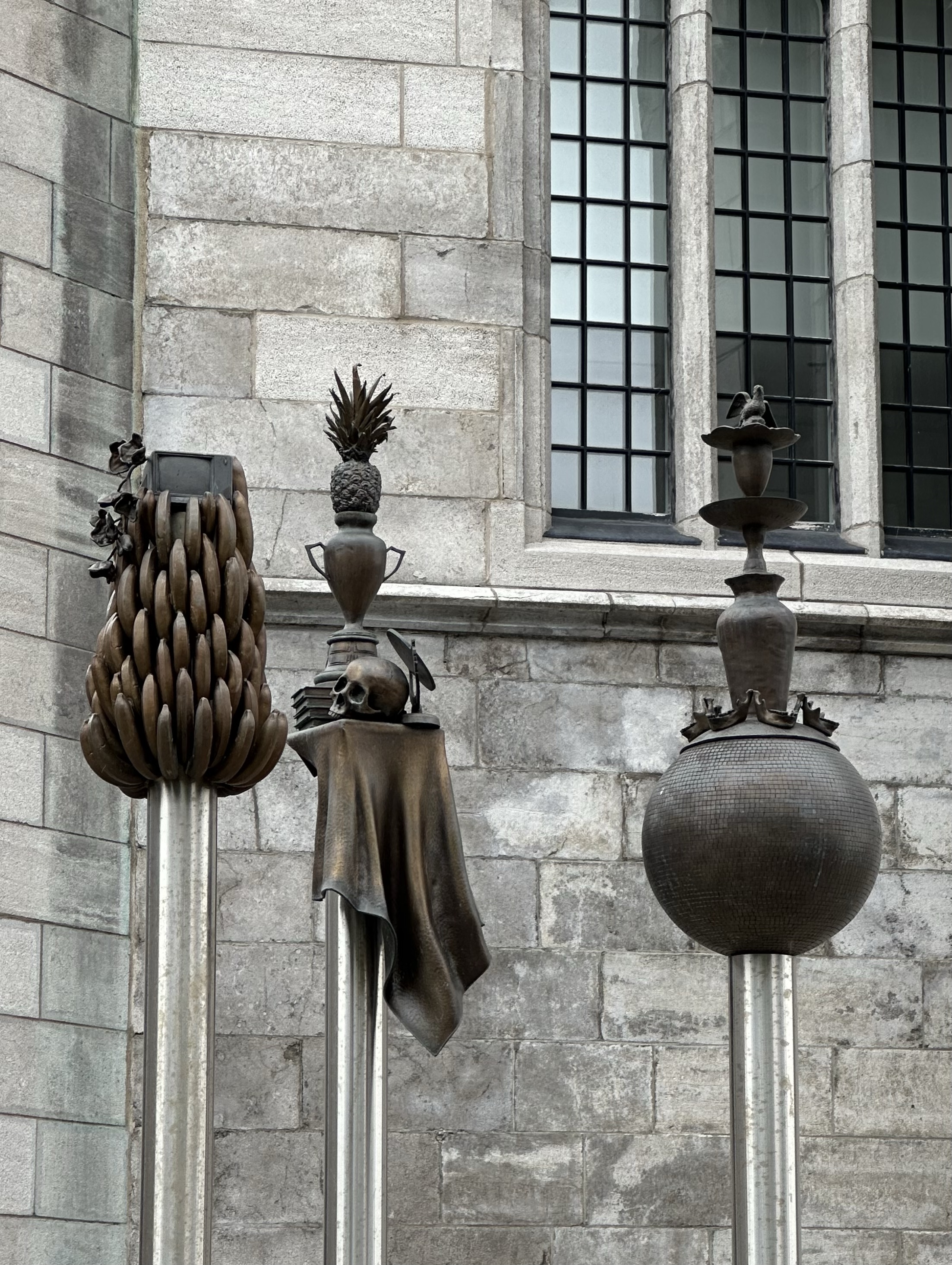 Getting back to history as we like to do, Artillery Park is the part of the city where the French, British and Canadian military presence has been since 1712. The buildings there really show how this part of life was a core integral part to the original development of Québec City itself. Talking of tradition, the old prison is now a library (Morrin College) and the close-by Maison de la Literature was once a Methodist Church of 1848. Outside, a Baroque style “Vanitas” sculpture, designed to remind humans of their mortality and the precariousness of everything eg contemporary objects, tv, mirror and trophy alongside traditional symbols, skull, candlestick and fruit. Interesting!