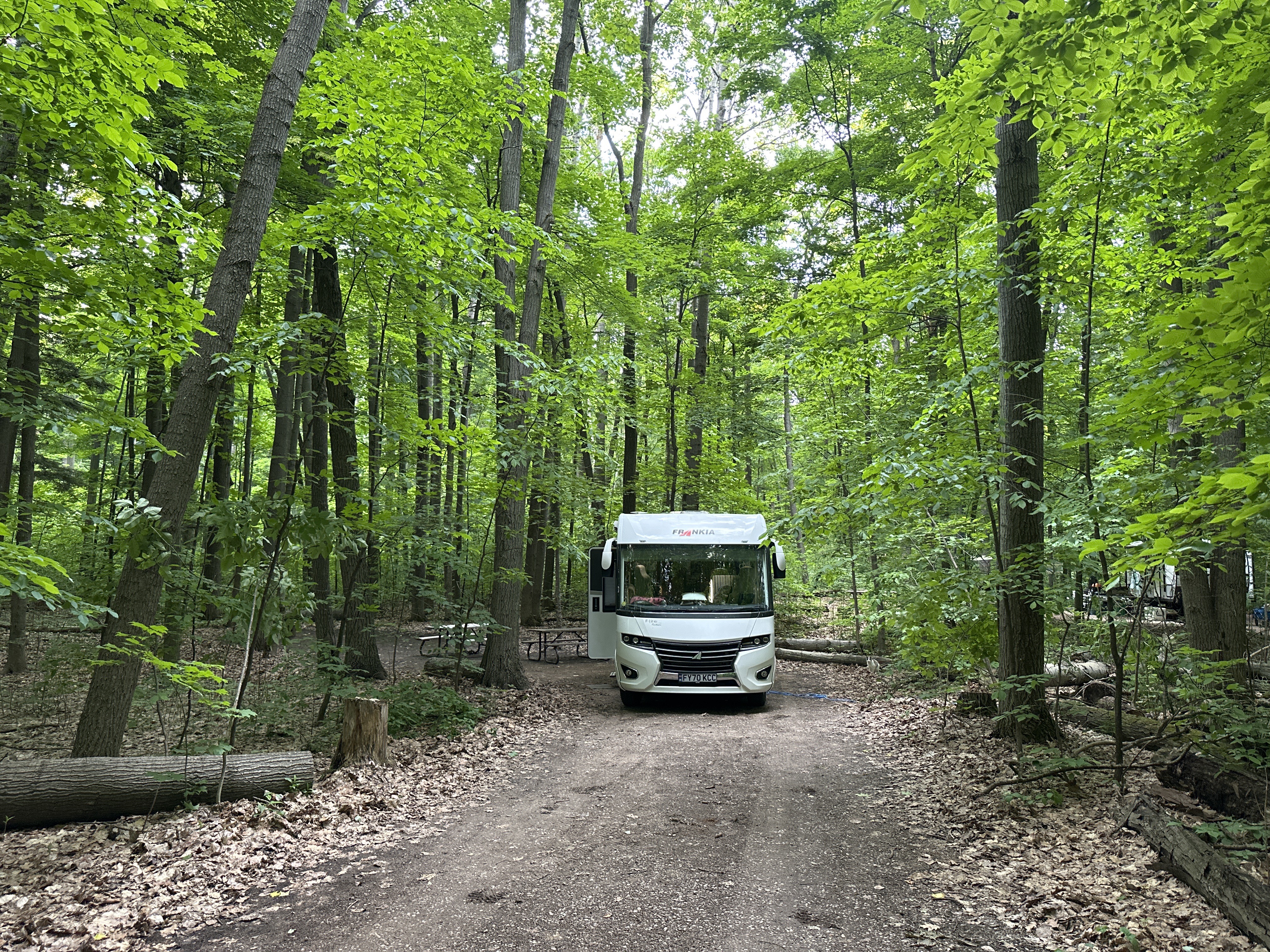 Around the Great Lakes there are thousands of small lakes, making for fabulous drives. The Muskoka Lakes (>1500) fall into the wonderful category as we headed to Killbear Prov. Pk. on Georgian Bay. This whole area, and it is vast, is known as Cottage Country, where the vacationers from the cities head. Think of Londoners to Salcombe and Devon, same thing. Lots of smart lakeside properties among the tree’s that wouldn’t fall into our description of a ‘cottage’ at all! Killbear is a tiny park in ‘The Canadian Shield’, a vast area different to the South of Ontario as it’s rocky, rugged and forested. Much of the rock is Gneiss which is pink granite, makes for a wonderful hue. It’s hardness has meant c. 30k islands in the Georgia Bay area of Lake Huron where the softer rock has eroded. It’s really lovely and so vast it’s like the seaside but on a lake, with families out on small beaches enjoying life.