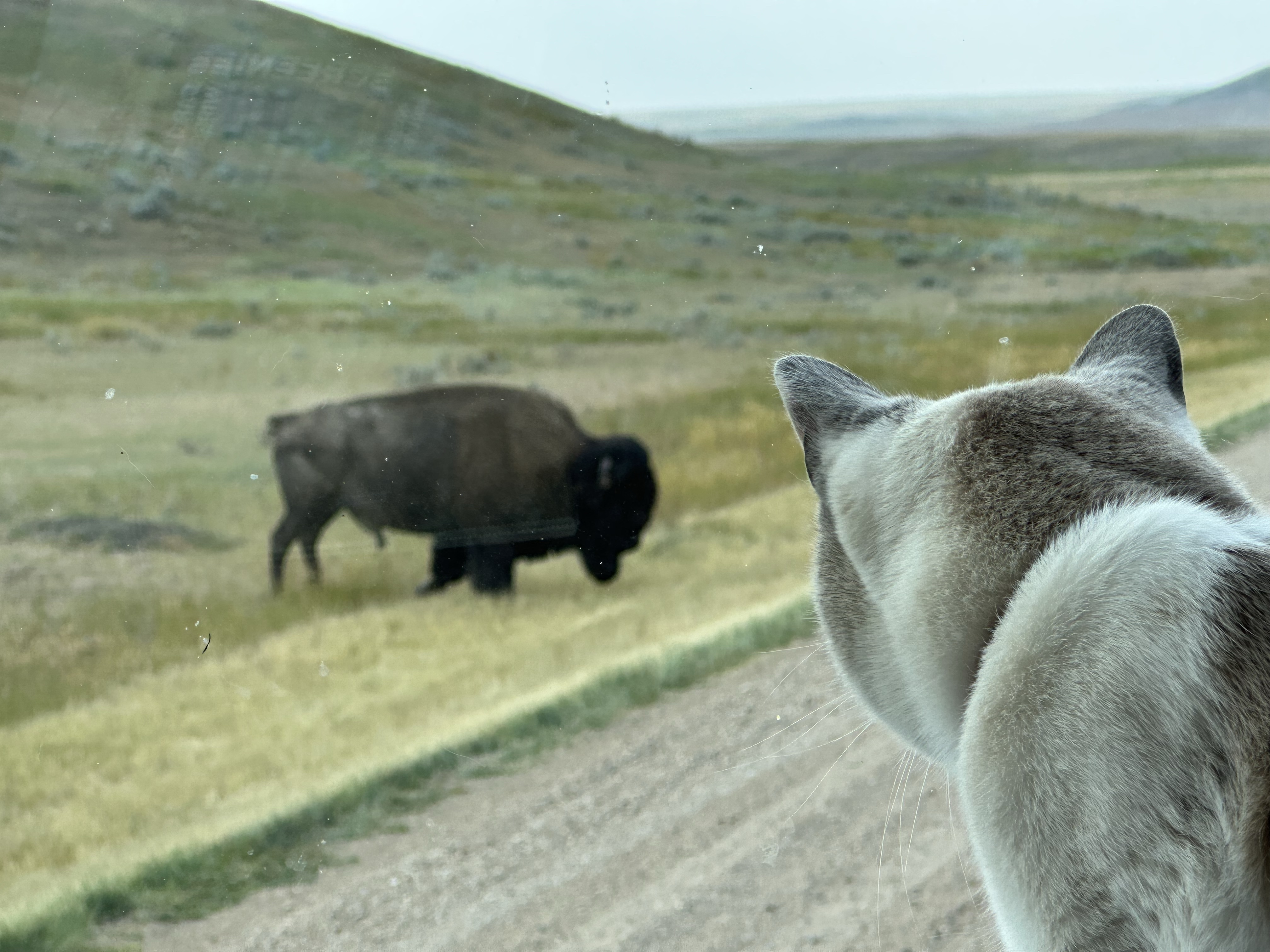 Our reason for being in Val Marie was however, Grasslands National Park. Vast prairie lands in a wide open glaciated valley, with a small meandering river, it was fascinating. Driving the unmade road, the landscape continually changed, very dry and arid at the plateau becoming slightly greener in the valley before becoming quite lush, either side of the river. We were lucky from a spotting perspective, Burrowing Owls, Bison rolling in the dust (including one that walked across in front of us) Prairie Dogs (so cute and noisy when they saw the feline one!) Deer, Gophers and Birds of Prey (one carrying a gopher/gonner)