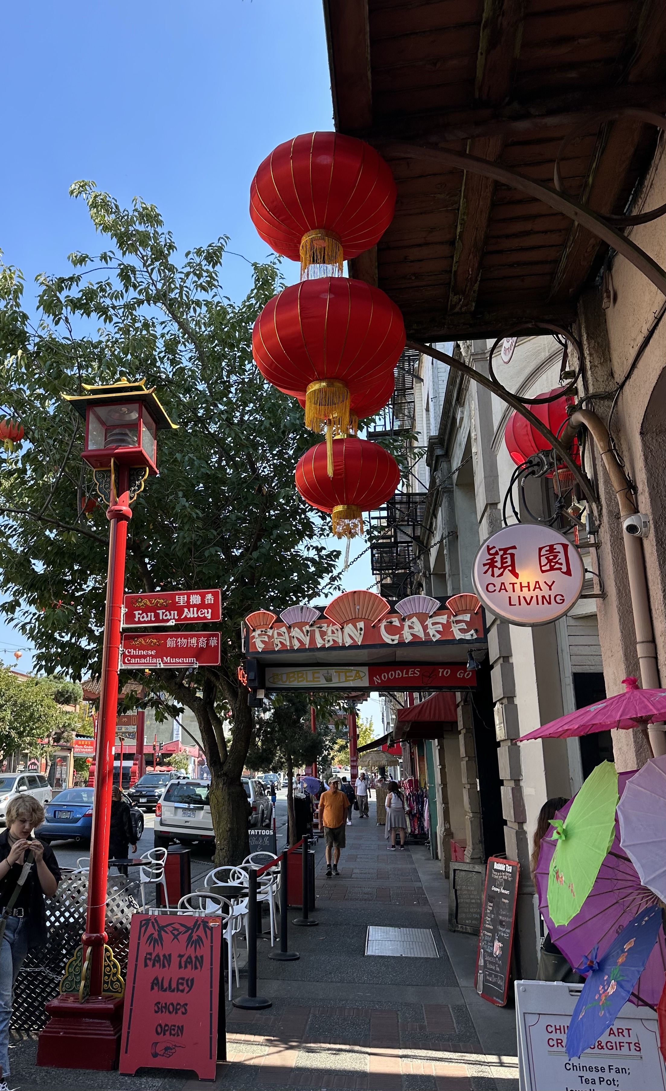 Its obvious when you are at Chinatown, a vibrant and colourful part of the city with a fabulously painted pedestrian crossing reflecting new year symbols. First settled in 1858 its the oldest intact Chinatown in Canada. Many of the buildings have flared temple roofs, balconies and courtyards. Bright tiles add to the distinct character. Fan Tan Alley is the narrowest street in Canada, it had tiny shops and too many people who weren’t tiny…