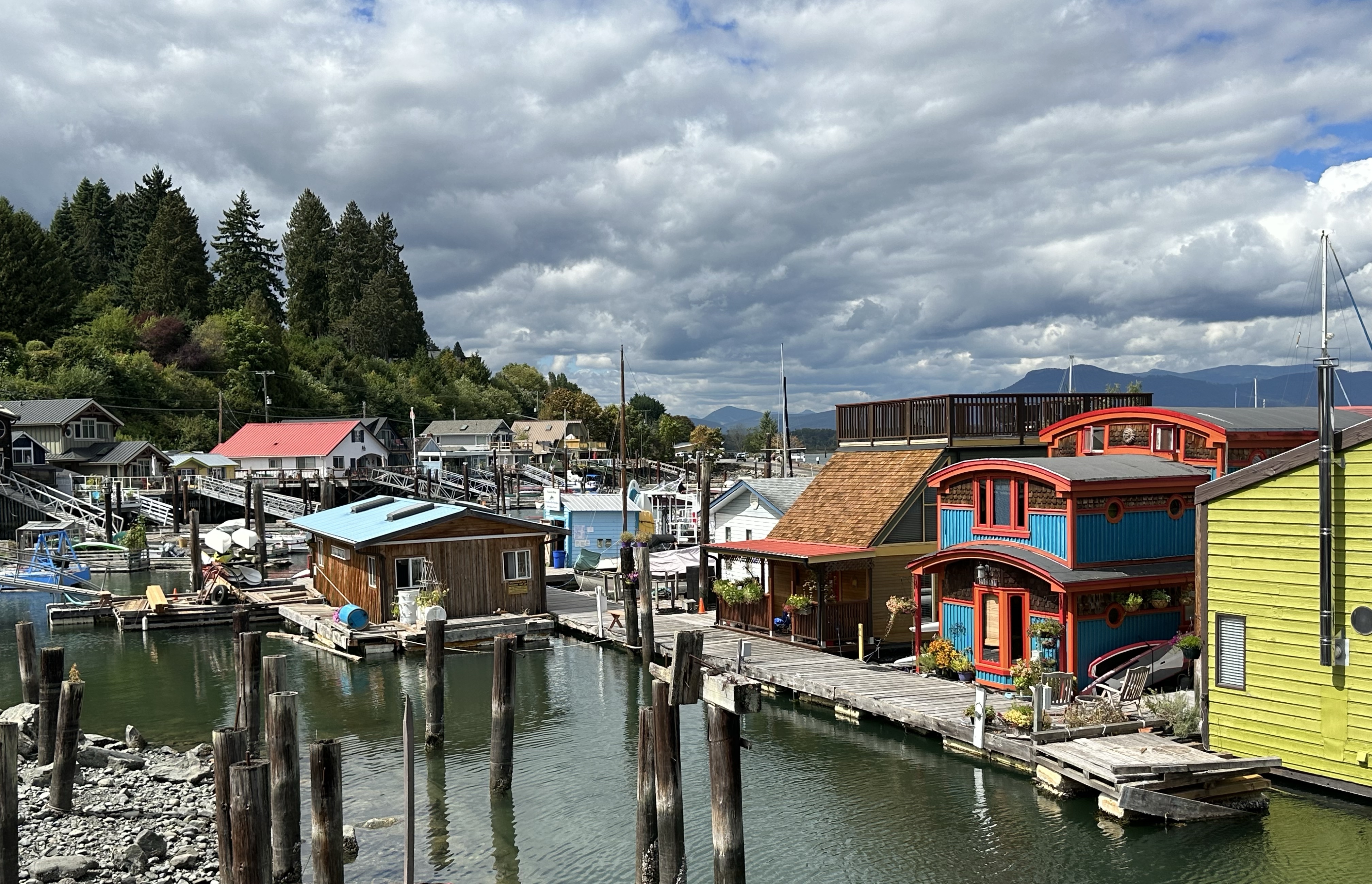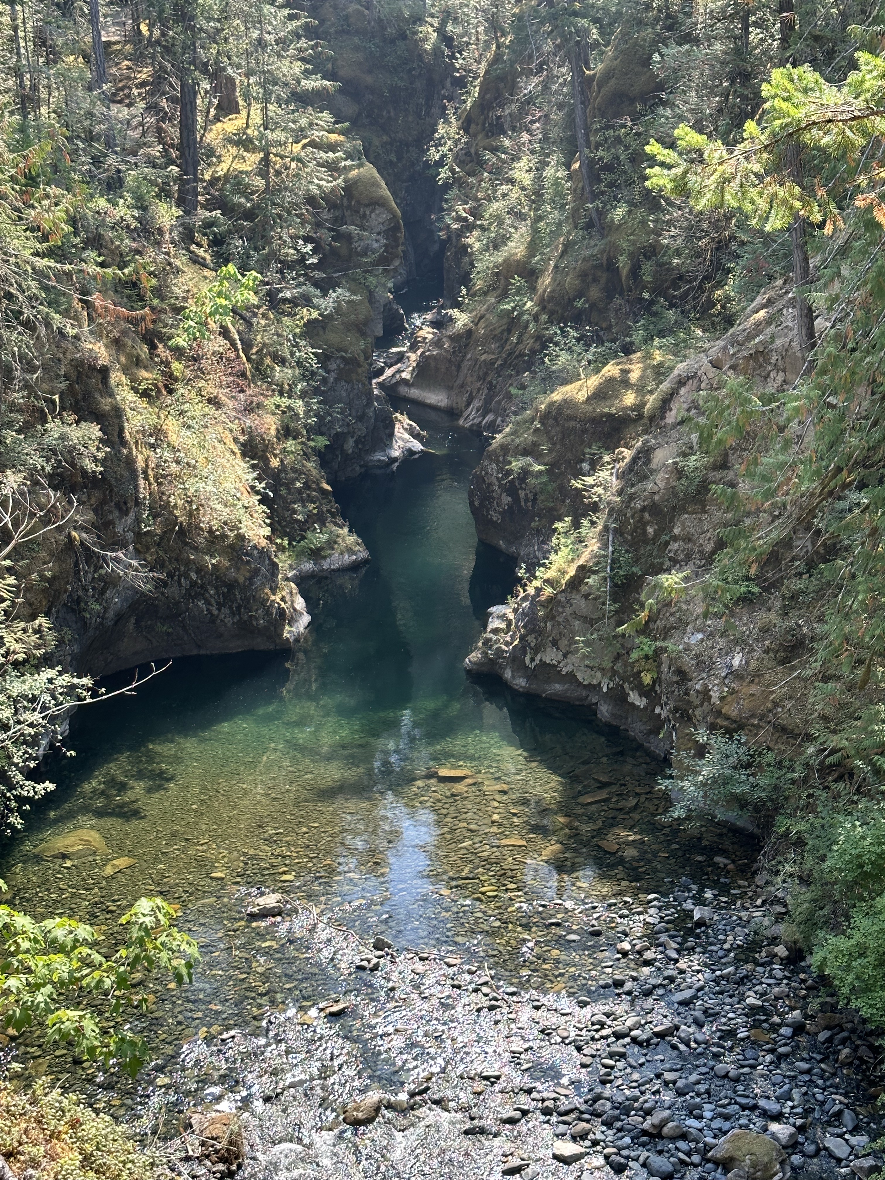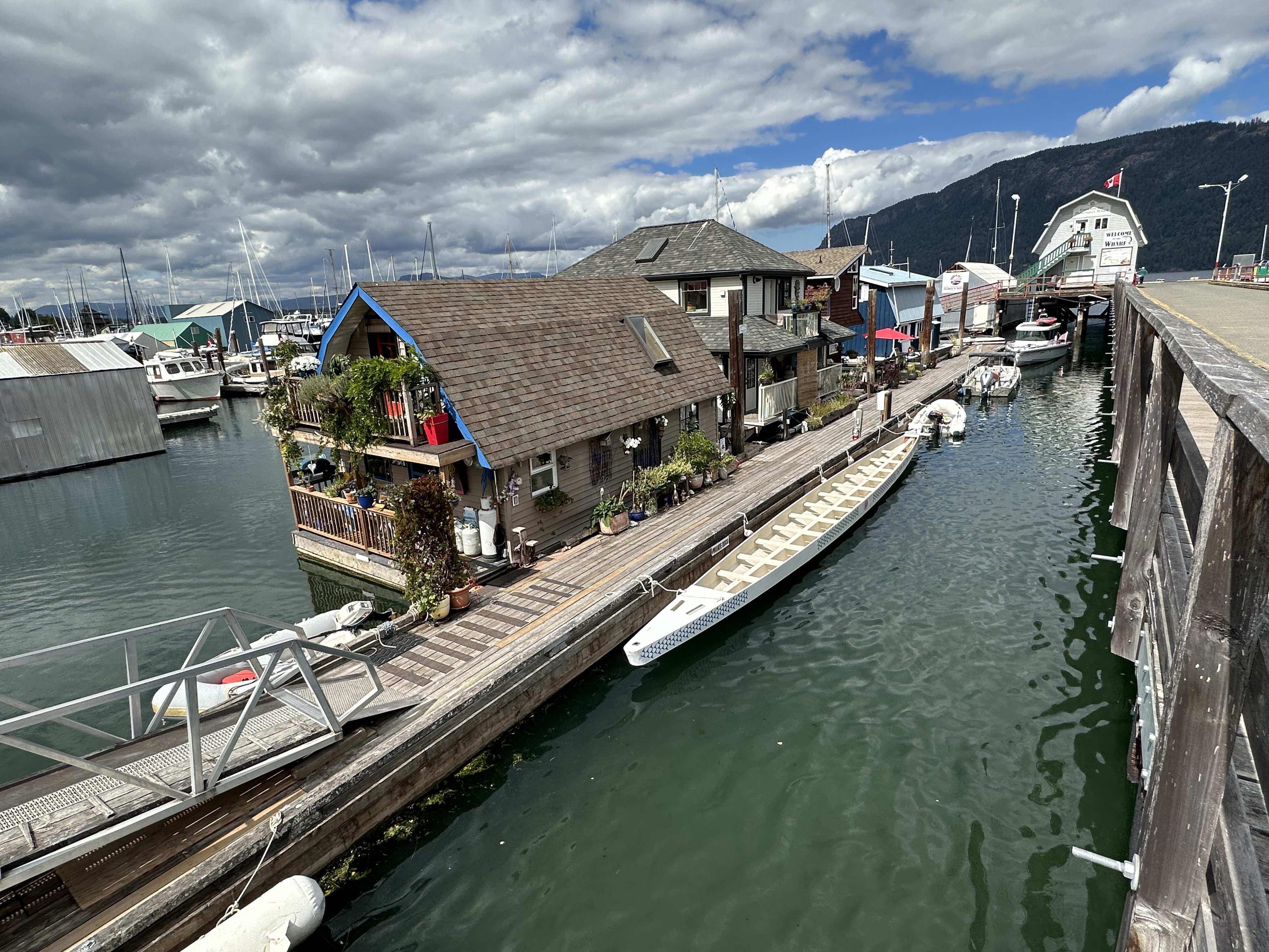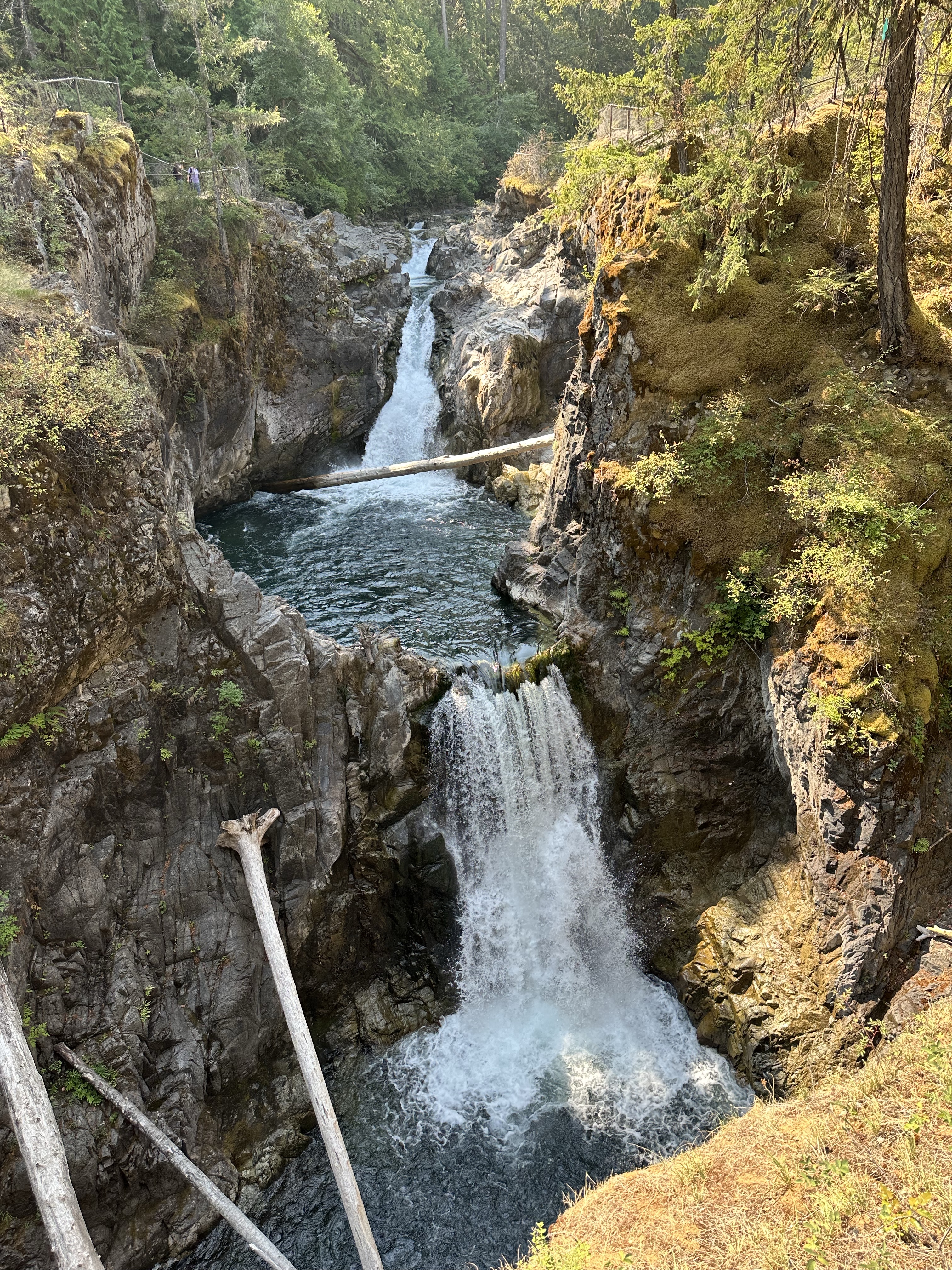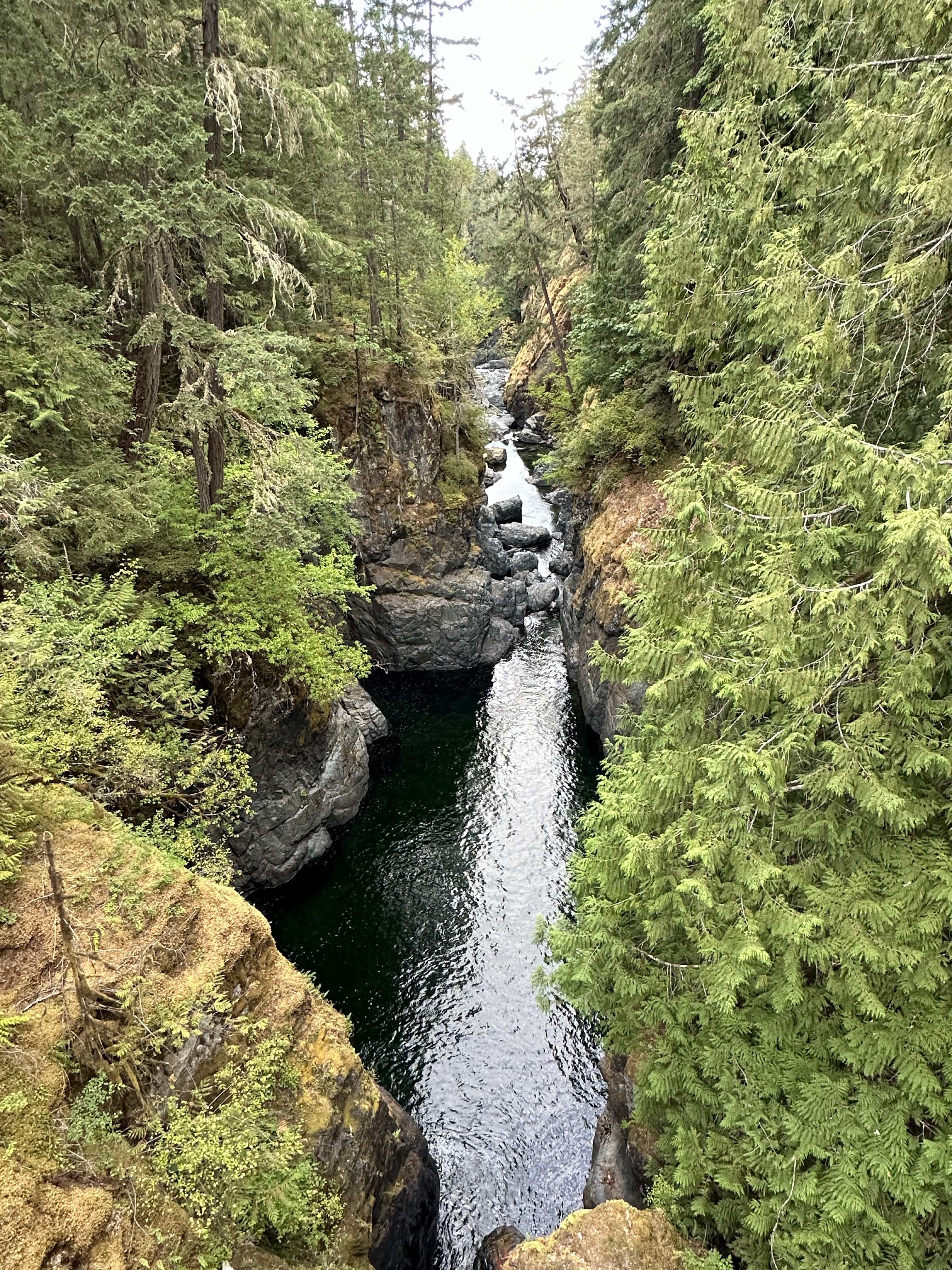 Anyhow, away from the city we followed a lot of rental RV’s up Hwy 1 towards the east coast of the island, stopping at a charming fishing village, Cowichan Bay, many of its houses on stilts, before taking a puck look at The Worlds Largest Ice Hockey Stick, 205 ft long. Staying near Nanaimo we adored Englishman River Falls, a walk through the rainforest of the provincial park, it was hot and humid. Tree’s and boulders covered in lichen clinging to the gorge sides next to the tumbling clear waters.