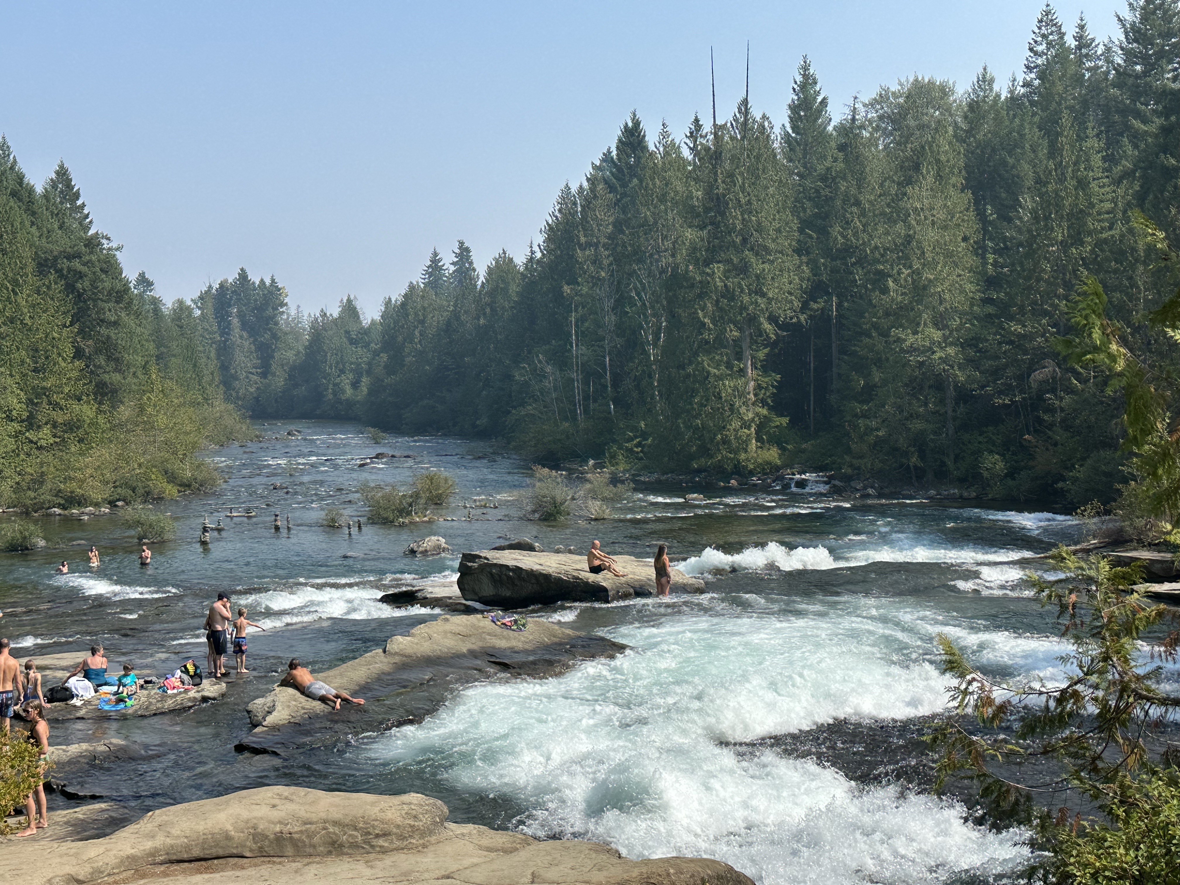 Qualicum Falls was a gem of a place, really pretty and some of the best falls we’ve seen. We were lucky to get there as the road closures had meant it had been shut. It has lots of layers of cascades and fairy pools, carved into the soft rocks, laden with moss. Giant cypress trees loomed over the misty and hot air, containing the atmosphere of mystery and solitude. Travelling from there we wound our way along the coastline of the Comox Valley, dipping to the water and back inland as we drove. We found ourselves at Coastal Black Winery for a Harvest Host boondock. Customary as it is to buy a product, we ended up with strawberry fizz. They produce fruit wines, not of the grape variety in this region. (referred to as table wines) The fizz was ok, as we sat in the warmth of the evening watching turkey vultures over the fields!