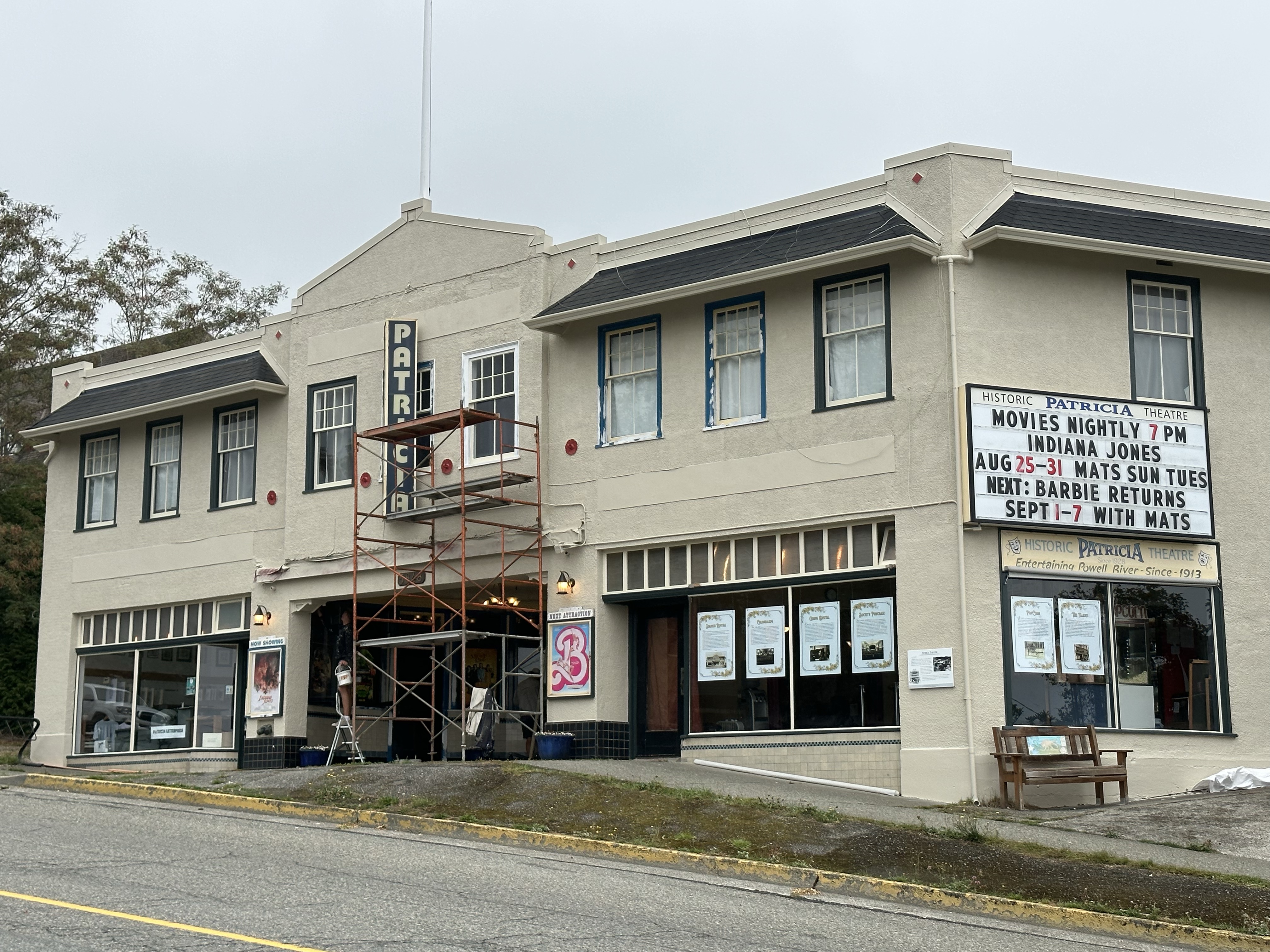 After the thunder storms let up the following day, we set out. Nearby is the older part known as Townsite Powell River. To get there we cycled past the iconic ‘Giant Hulks’, not a bunch of green men but 10 concrete ships, all acting as a floating breaker, anchored down, to protect the harbour area associated with the paper mills logging pond activity. A novel way of upcycling naval ships! The Old Town was full of little gems, especially the ‘Patricia Theatre’ built in 1928 as a cinema and vaudeville house and the longest running theatre in Canada, is supposedly Spanish Revival. not sure about that. We couldn’t get past the foyer as Indiana Jones was acting up! A building with a history however, as Tla’amin people were confined to the balcony and only admitted after the settlers were seated. It continued until around 1970.