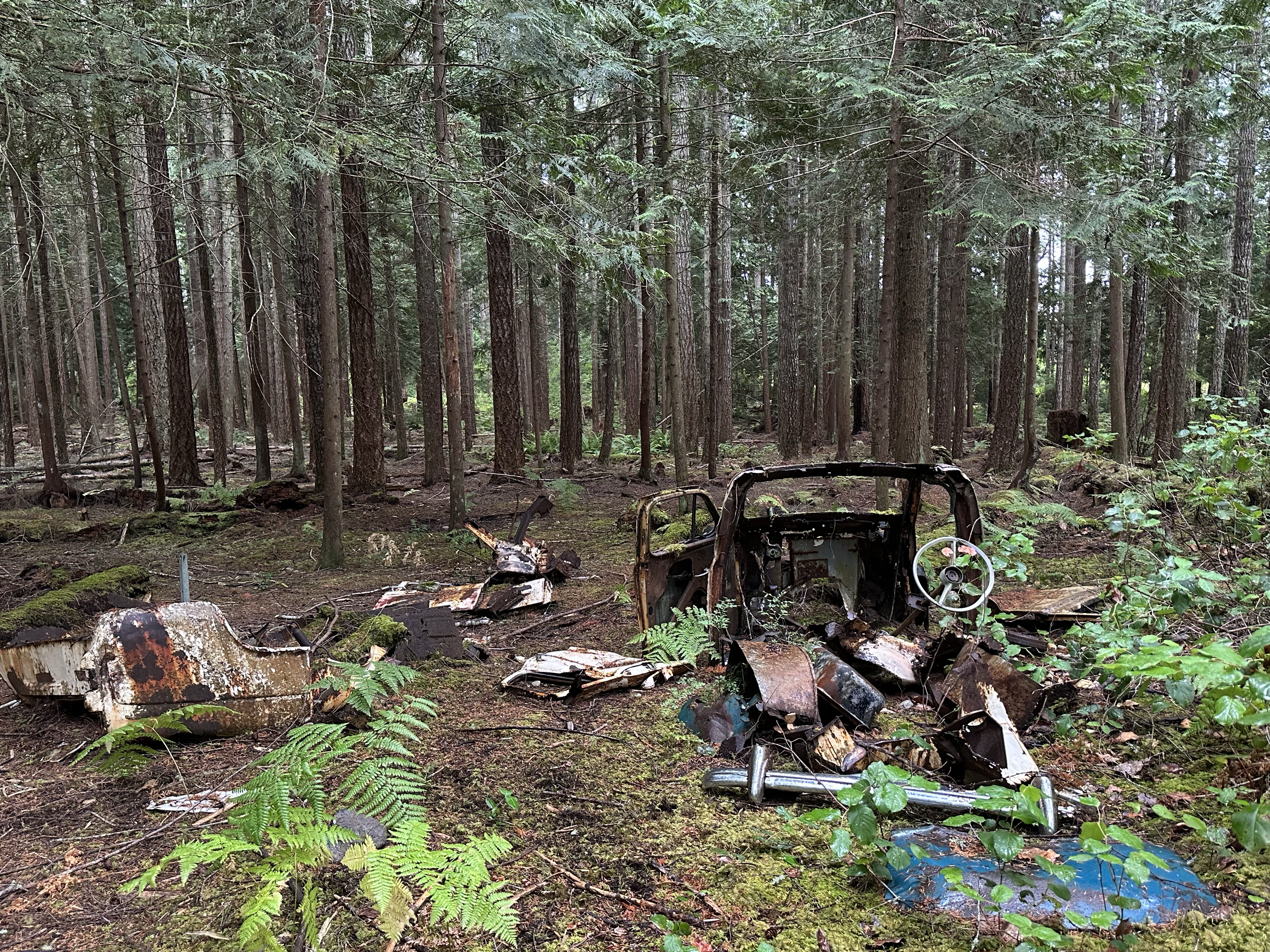 After a coffee to dry off after another rain shower, the Watersedge Trail gave us Harbour Sealions. From there we rode up hill into The Penticton Maze, you’ll be thinking we are deliberately trying to go missing eh? Fabulous forest trails in the rainforest above the town. Tranquil among the trees laden with moss and the ground vegetation and fronds starting to show some autumnal colour. The only odd bits were the abandoned rusty cars scattered around the place, why, we don’t know. Fabulous area for bikes or walking, we didn’t get lost and made it back in one piece, the target for a tricky forest ride these days.