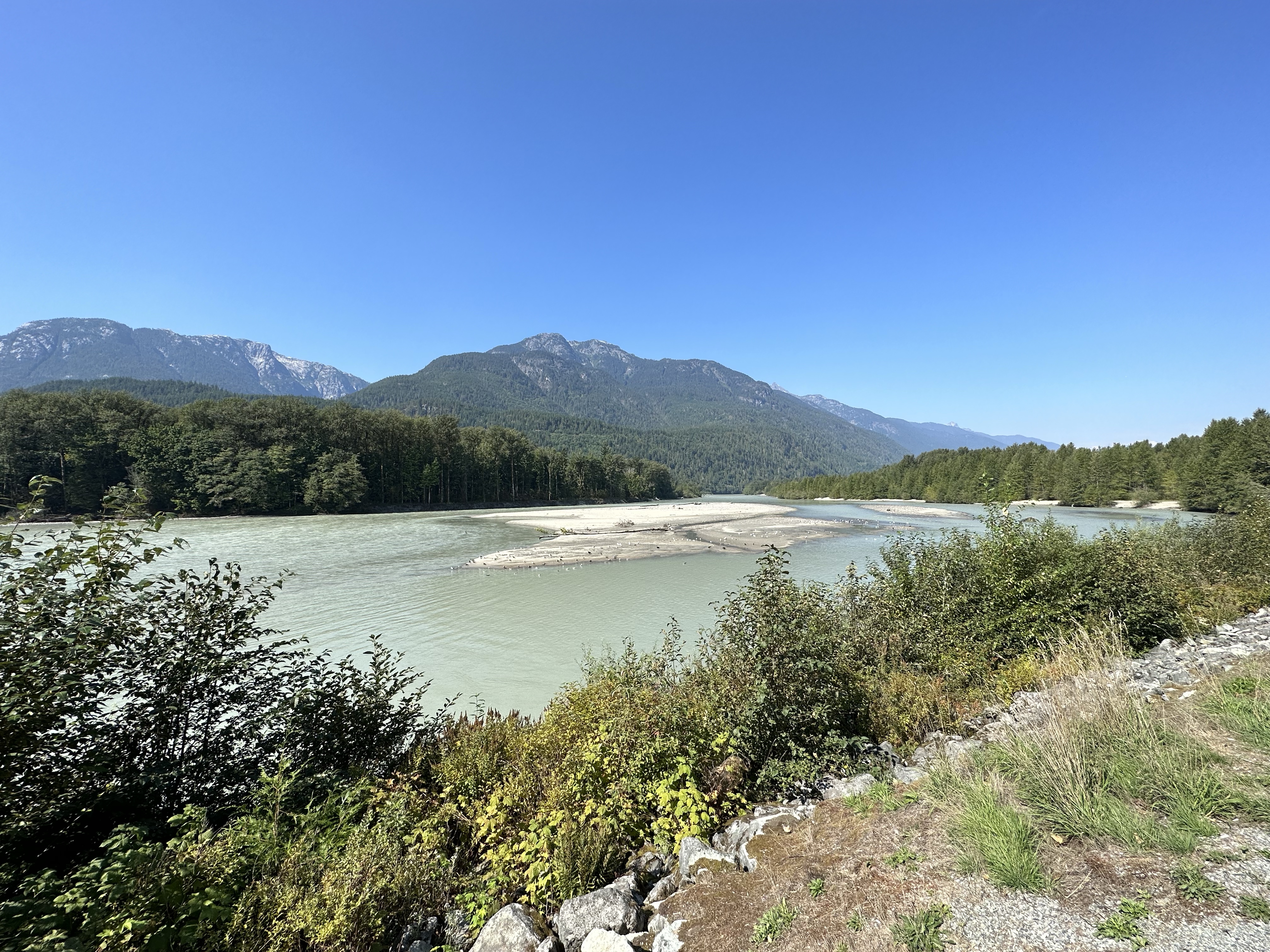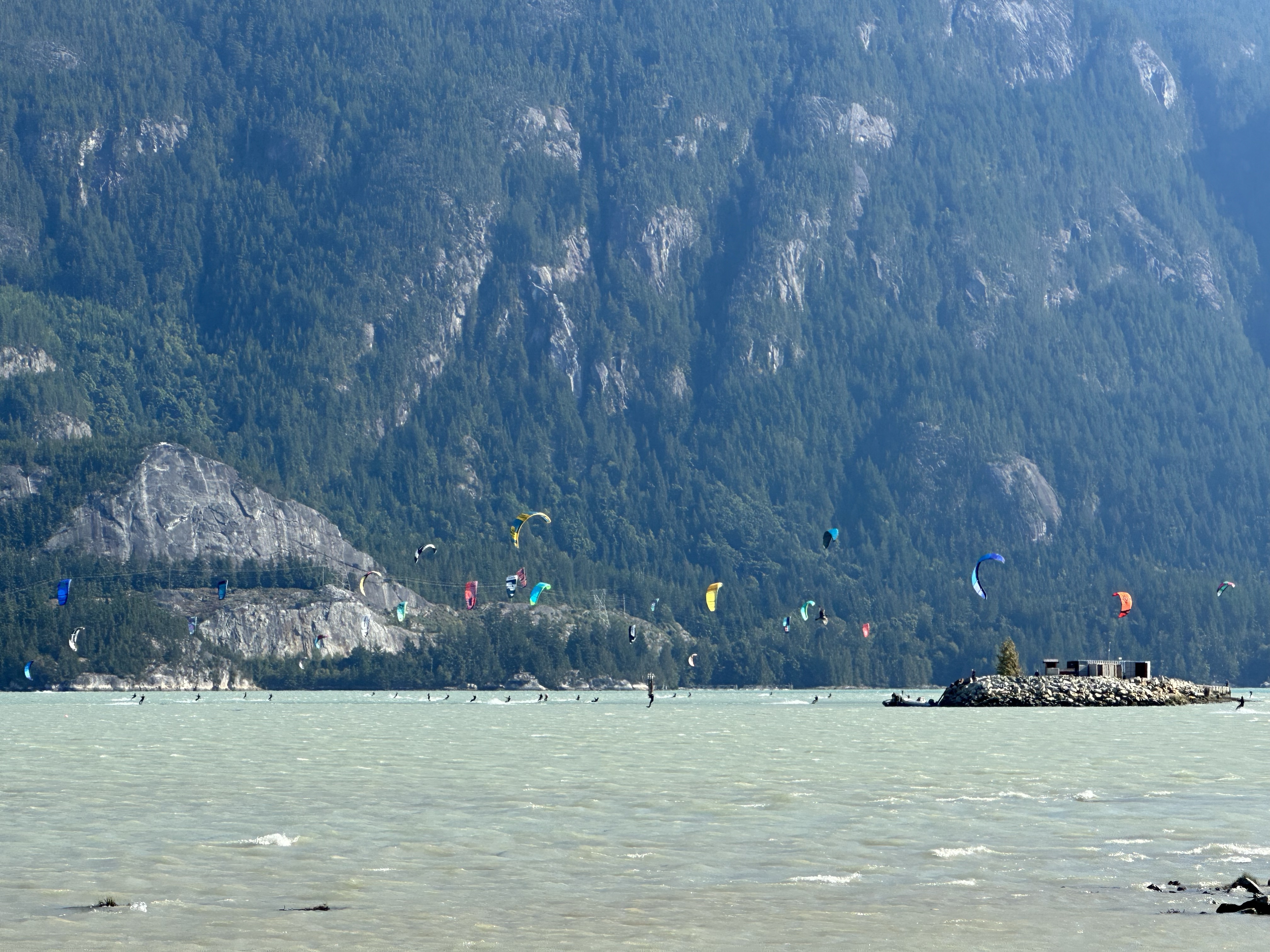 We had to do a campsite shuffle in Squamish, so busy and popular, it was a challenge finding places but once re-set up it was bikes again. A 10km ride, having to keep a look out for Sasquatch, and we were in Squamish, picking up a trail along the Squamish River and an area known as Eagle Run. A stunningly beautiful area, frequented by hundreds of Bald Eagles when the salmon are swimming upriver to spawn. Too early for us but there were plenty of Turkey Vultures around. The trail becomes Spit Road from where we watched kite surfers across the waters, not in the same league as the Tarifa, Spain folk though.