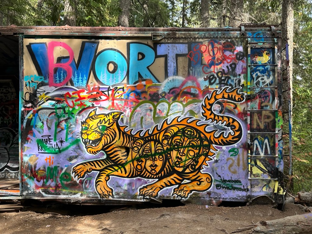 Whistler was the next stop. Travelling up The Sea to Sky Highway which was gloriously varied. A genius somewhere, decided that given the ski, bike, hike culture there should also be a Sea to Sky Trail. Designed to go from Squamish to Pemberton (north of Whistler) its c. 75% complete, so off we went. Starting at the spectacular Brandywine Falls we rode the trail through the woods over roots and rocks, passing small turquoise lakes, tumbling water and noting the leaves falling on us and the colours changing. We eventually arrived at Train Wreck. It has become a hikers destination, 7 derailed freight box carts from a disaster in 1958. A driver took a section under repair too fast, leading to the incident and these carts were pushed away by heavy machinery to become a rusting relic and art studio canvas in the forest.