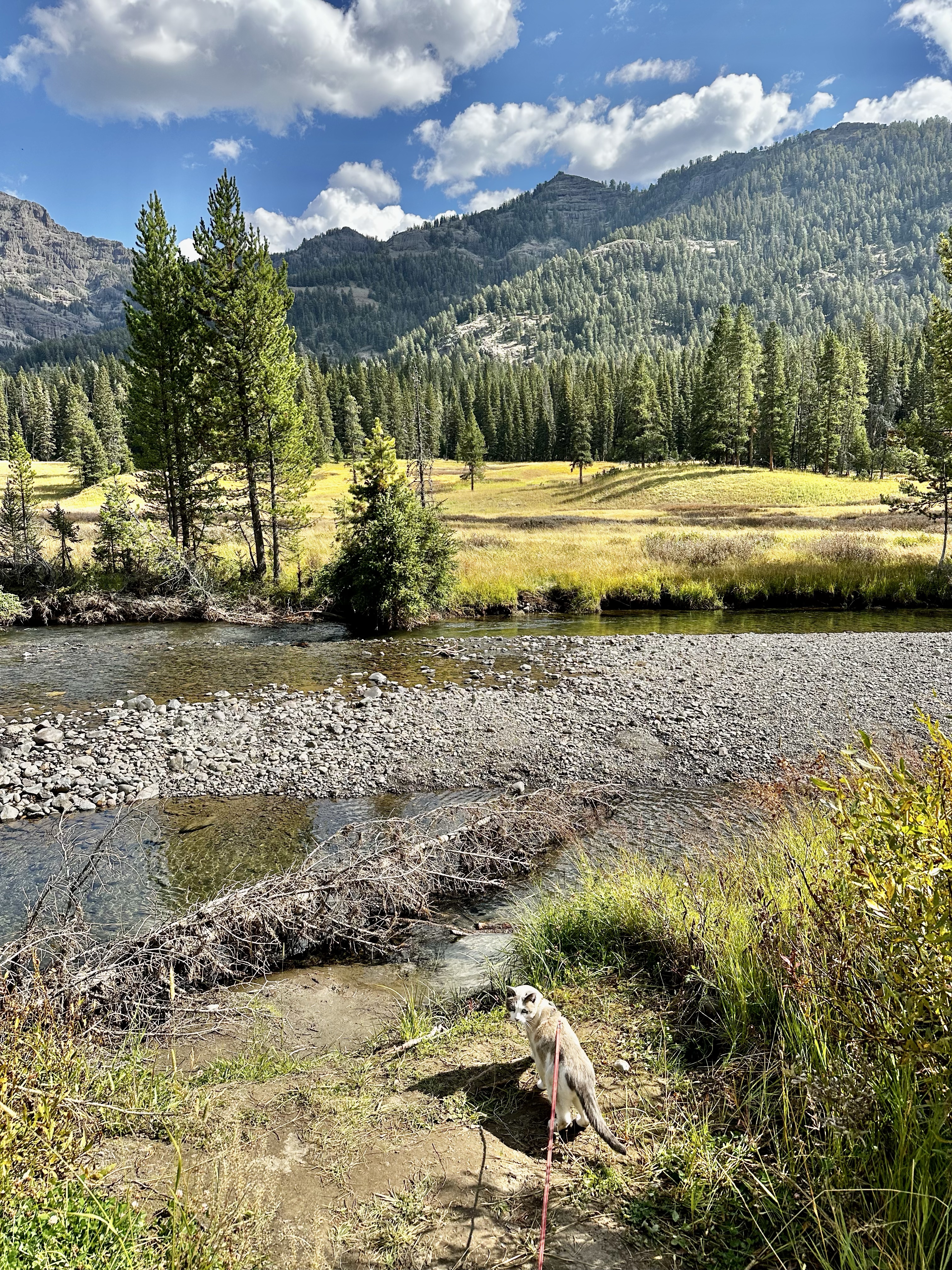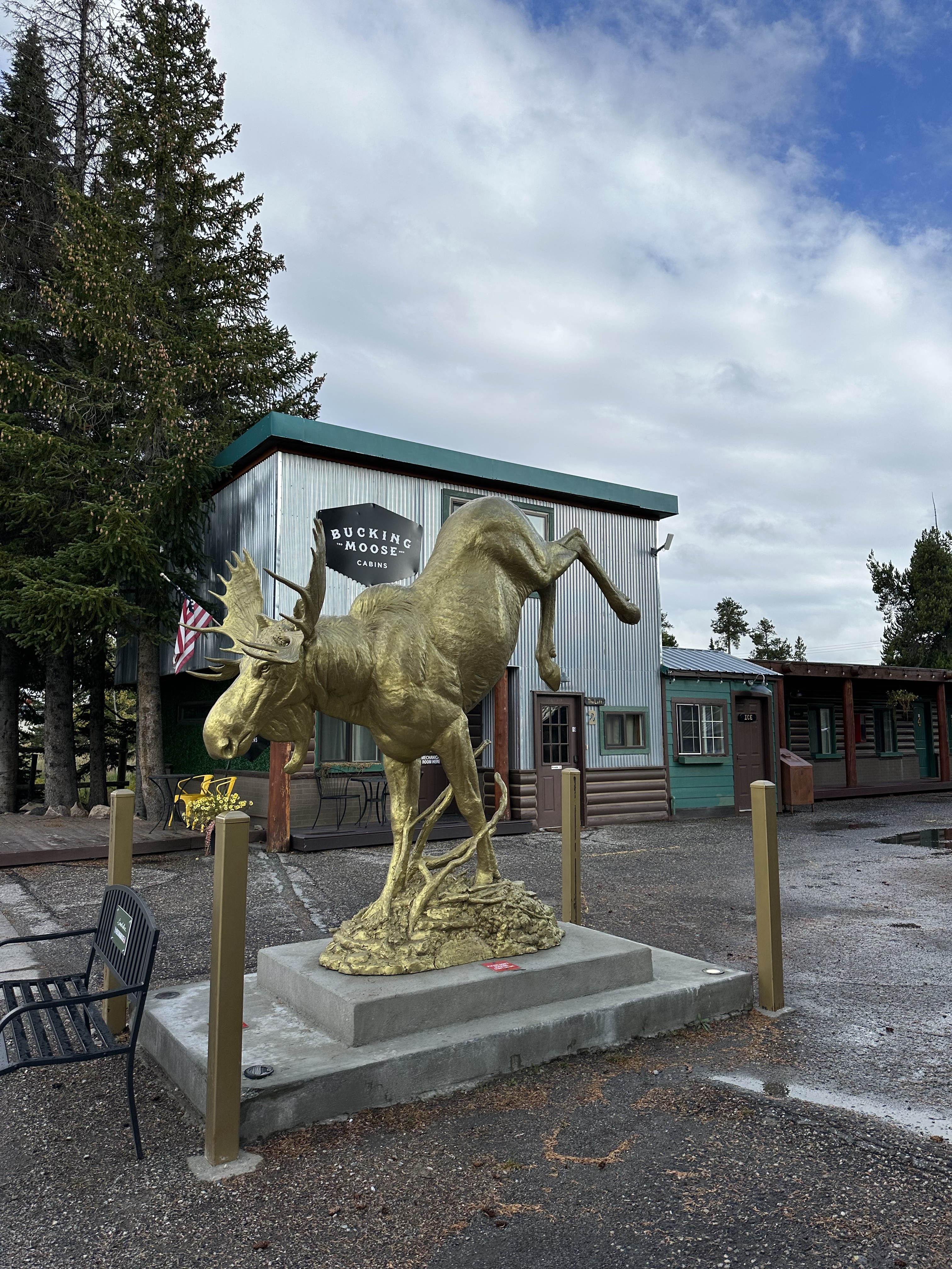 Being based near the faux cowboy town of West Yellowstone we were in a bit of a tourist trap. It’s the West entrance to the town and probably the easiest for many visitors. We had been keeping a log, as we do, of US state license plates we’d seen and when counted up we were shocked that we’d seen 43 of the 50 states, shows how immensely popular the park is. We’d also seen approx 10 European vehicles too, French, German, Swiss and Dutch so also international! As a town it was pretty shoddy given the tourism, lots of low end motels, tourist tat shops and not particularly great eateries. They search for the golden ‘moose’ here though! It did have some fun signage and a fab visitor centre though. Jigsaw made friends in the queues even at traffic lights!