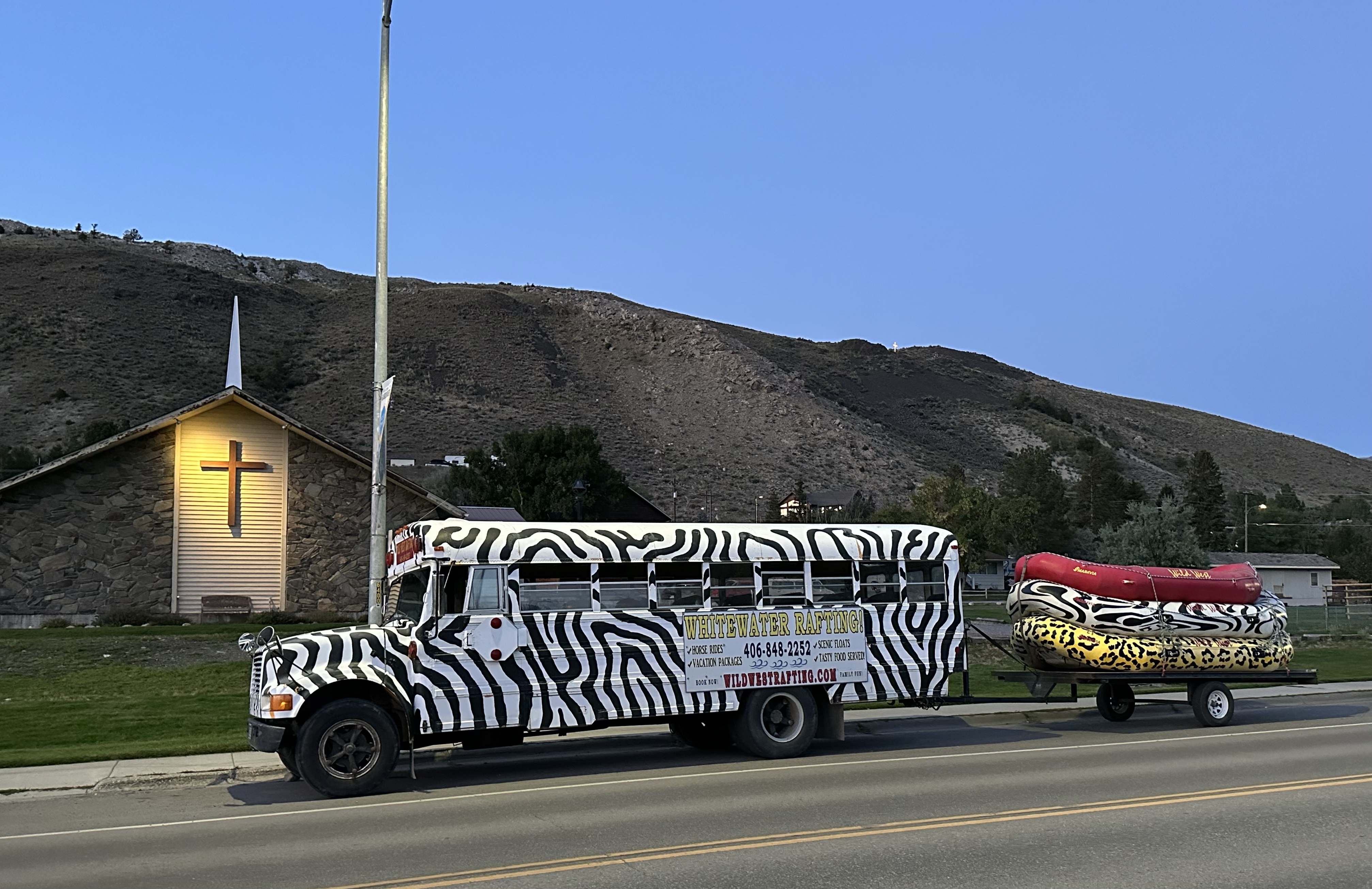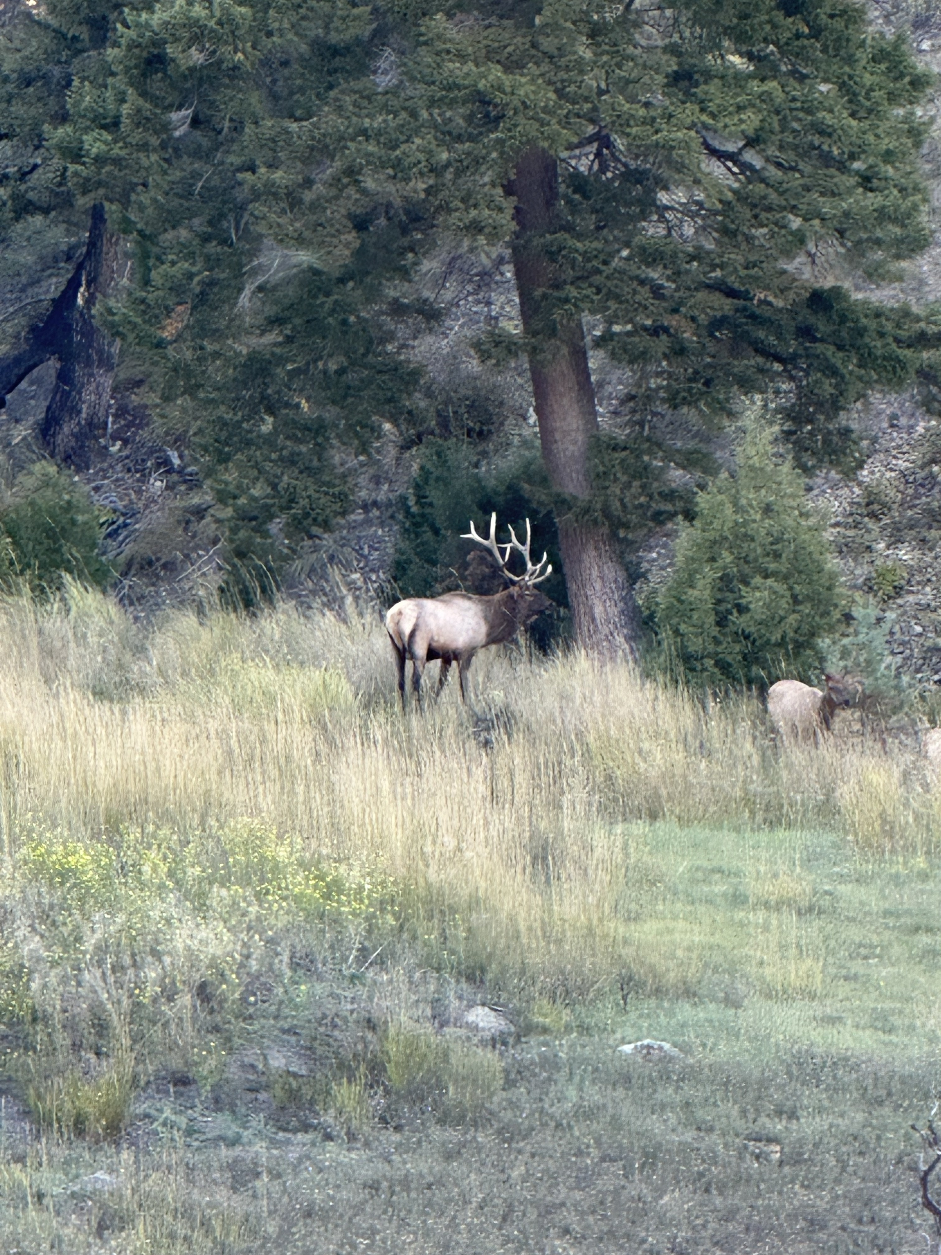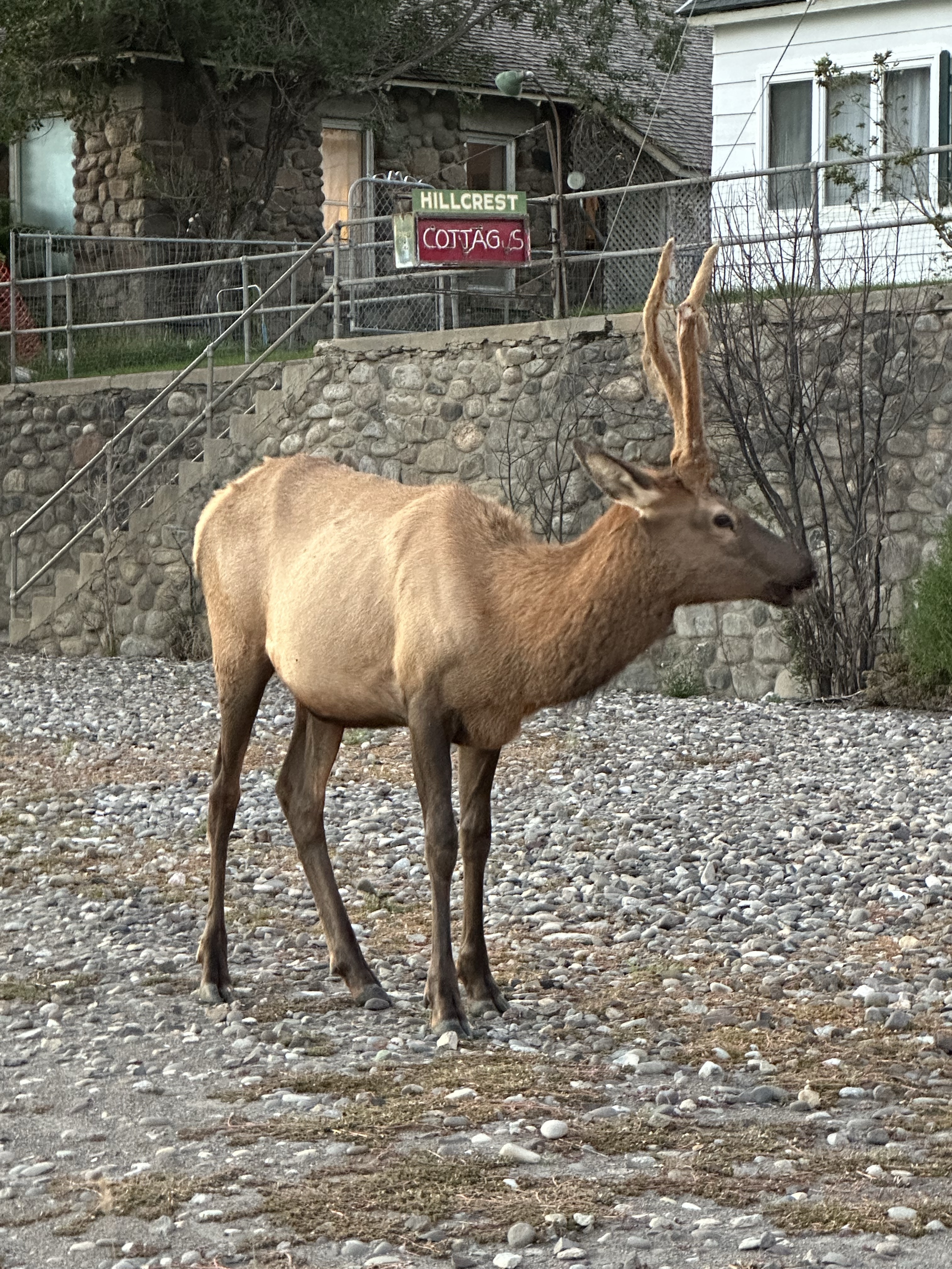 We arrived at Yellowstone National Park at the north entrance (it’s vast so they have a few) and we headed to our campsite at Gardiner. On our way there, we had a detour via a fabulous Swiss vet for Jigsaws jabs. After setting up and having two campers tell us to watch out for Jigsaw as there’s a Great Horned Owl around (which we saw) we headed into Gardiner to get a bite ourselves. No chance, this is meat country lady, I was told! We ended up sharing a salad and deep fried cheese curds, hmm… The very streetwise Elk wanted in on it we think or perhaps a coffee from the ubiquitous hut! We were a bit concerned that one of the local tour buses had made a wrong turn, they seemed to be advertising different animals to the ones we were seeing.