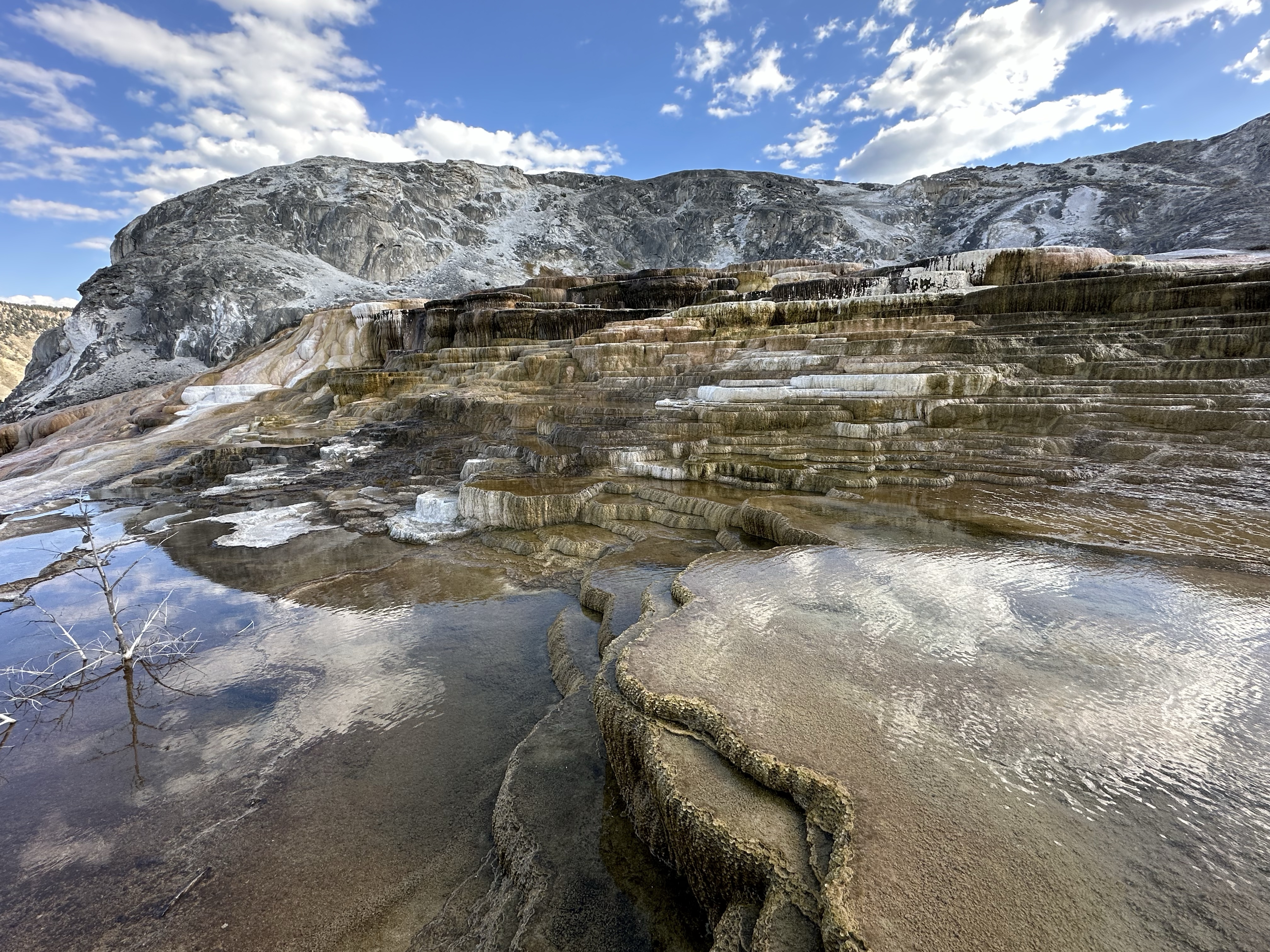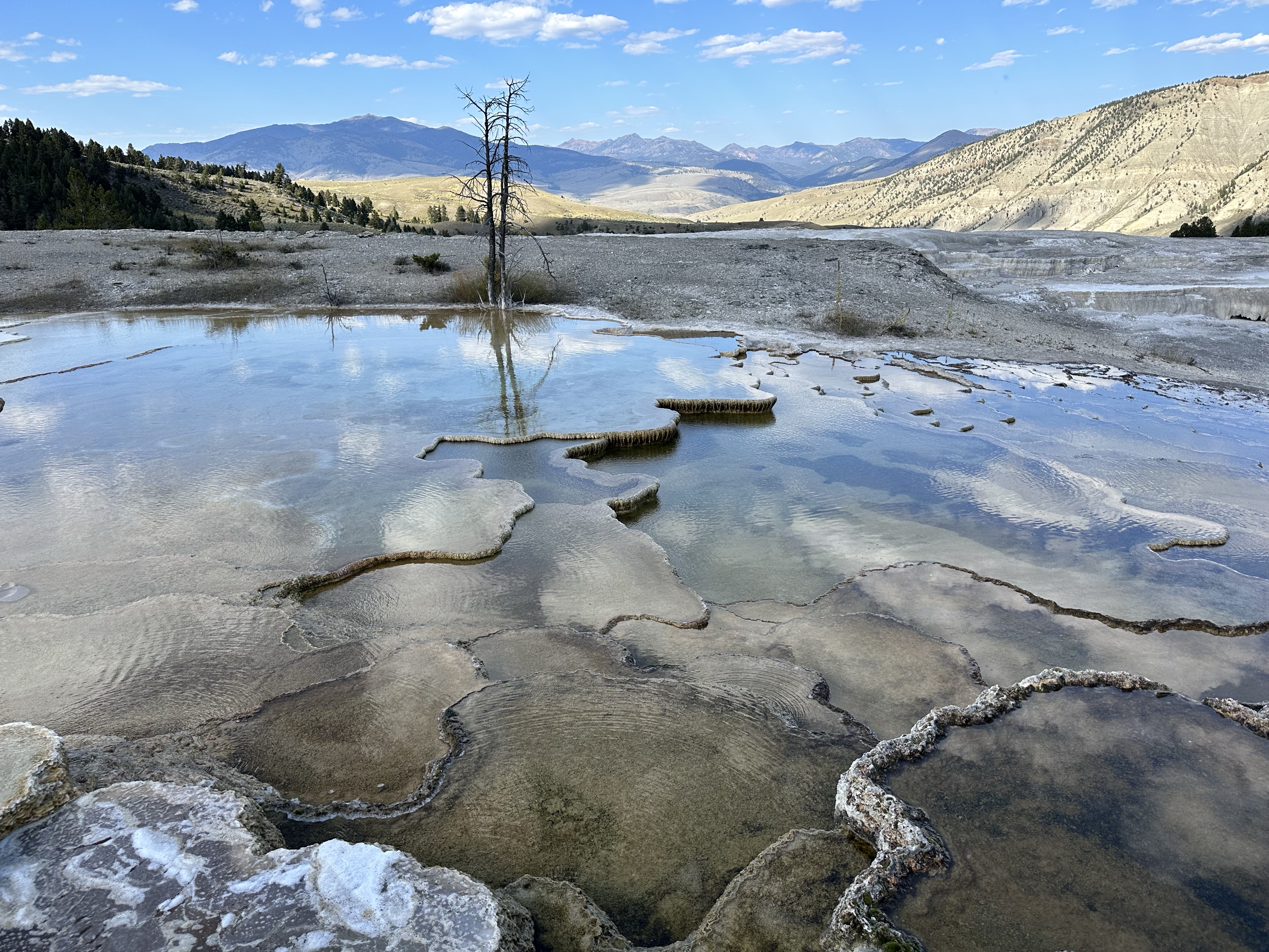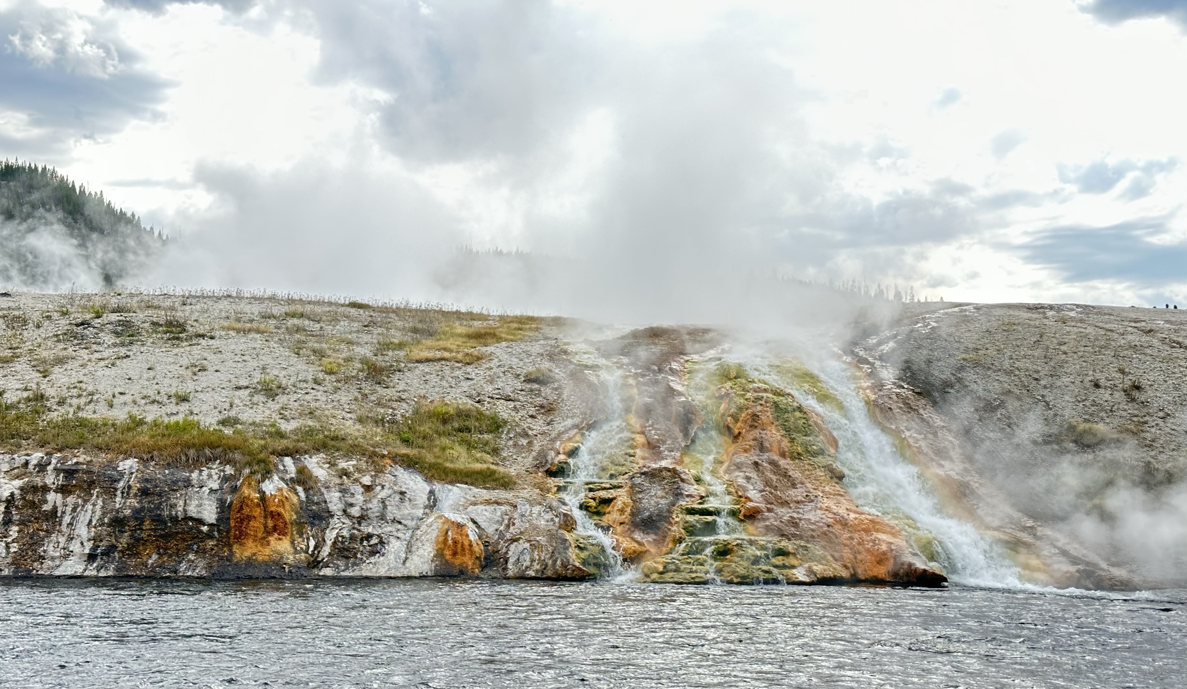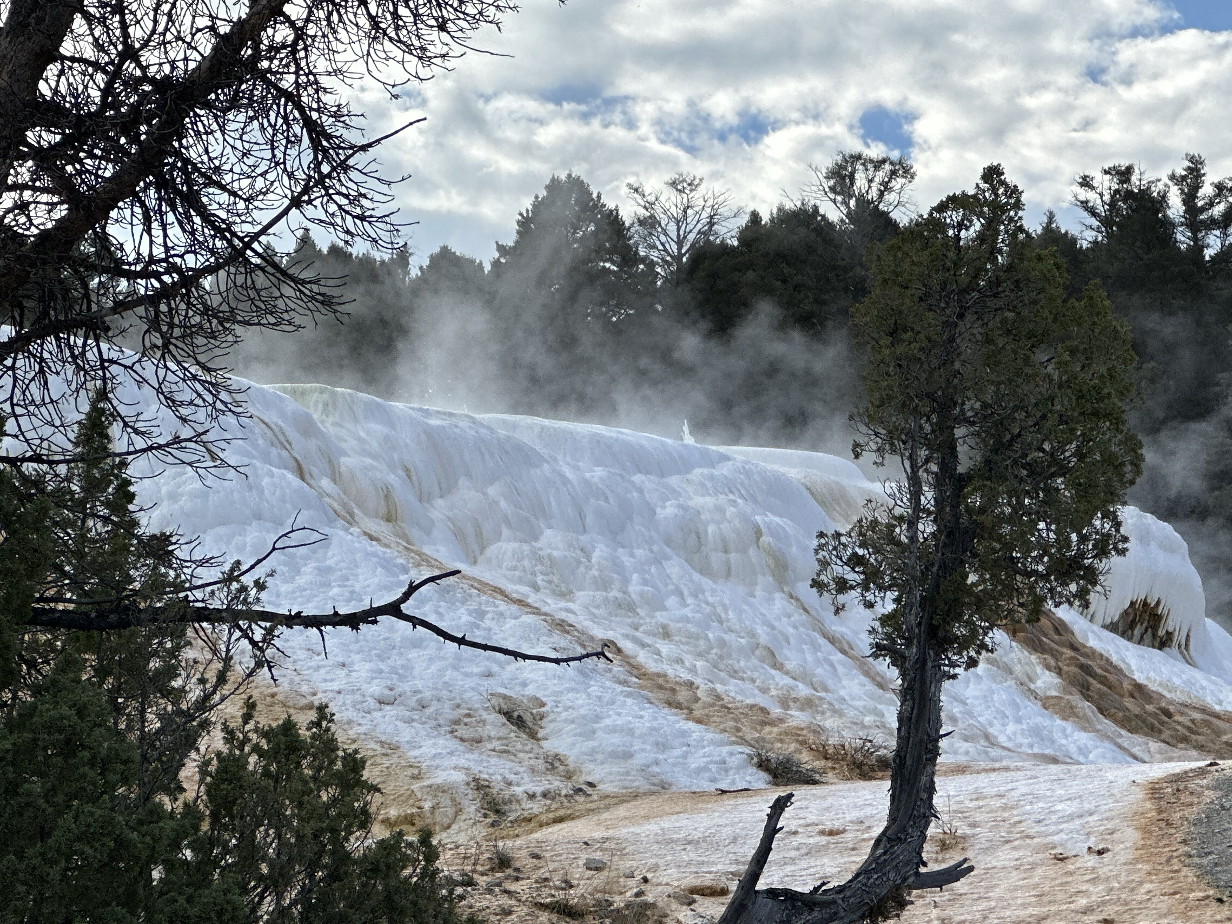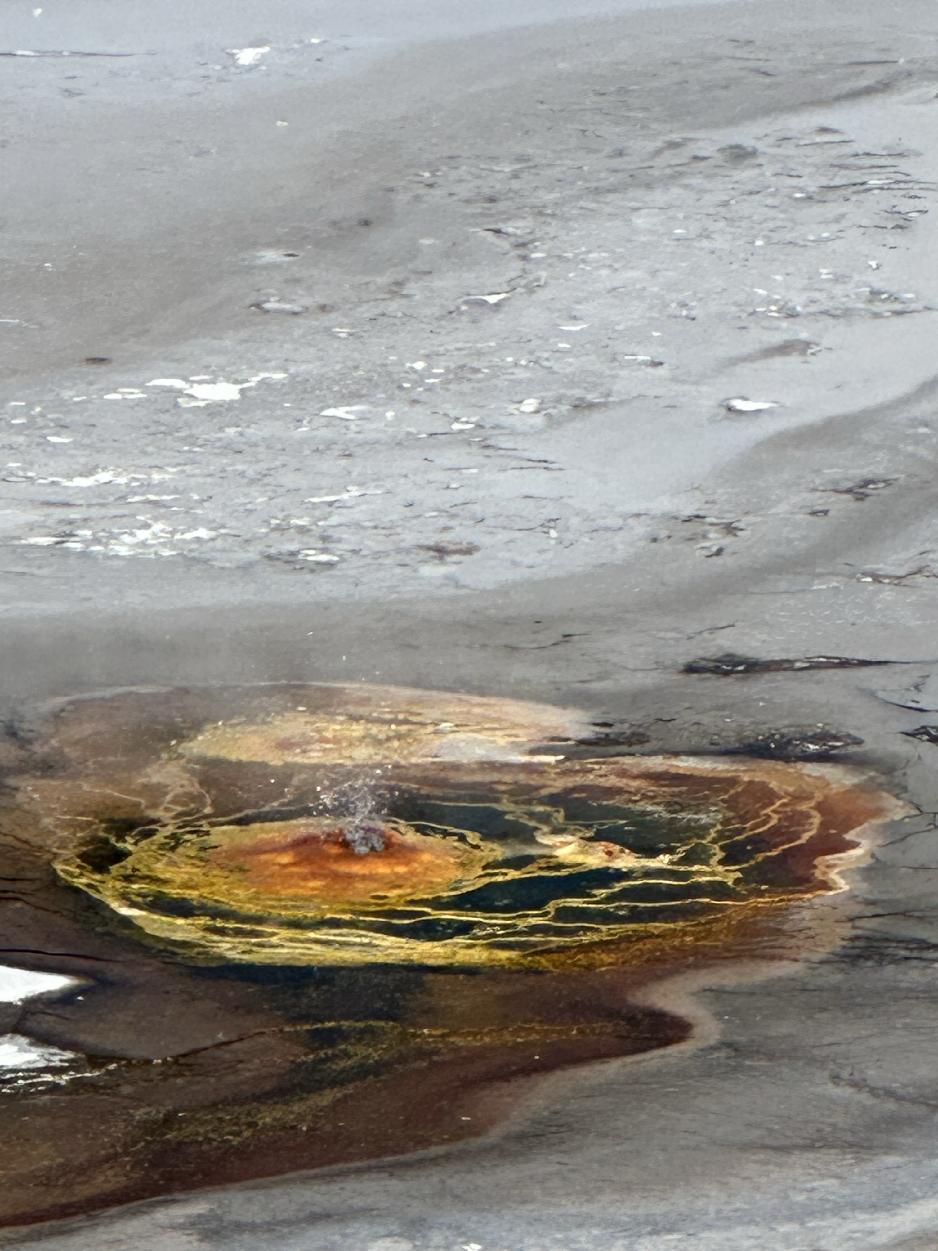 Moving to the West of the National Park we were on yet a different road, seeing Trumpeter Swans at Swan Lake, no kidding, the two pairs of Sandhill Cranes which apparently is a lucky spot. this route took us along the Gibbon River, first stop, The Artists Paint Pots. So named because of the density of colours in the gurgling pots, the steam vents and the colours in the mineral pools. The popular stop in this area is ‘Grand Prismatic Pool’. The best time to see this is a hot day so not steam rising and the sunlight on the water for the colour. We had cold and very little sun, however it was still spectacular. The myriad of colour was astonishing as was the cloud angel.