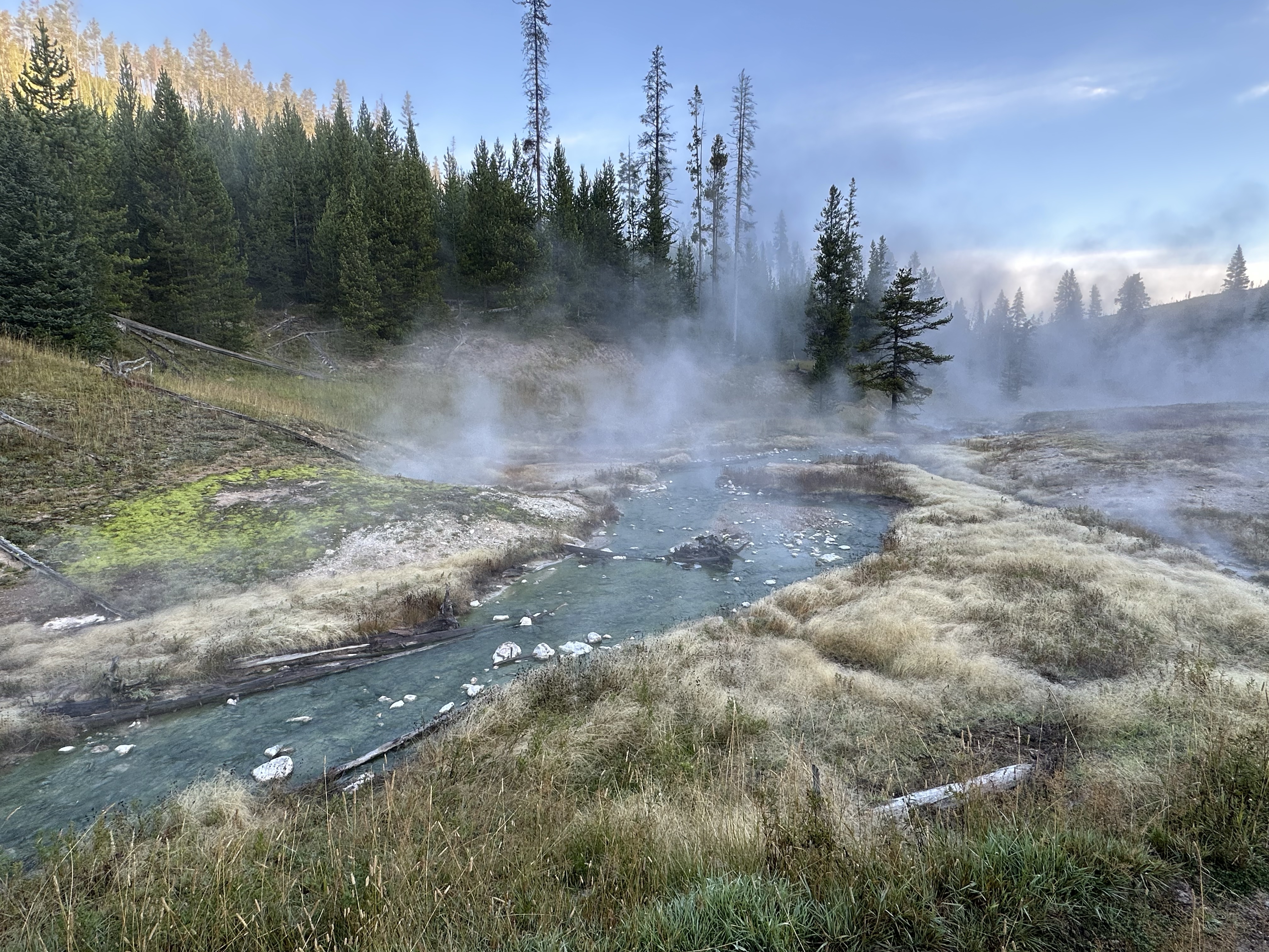 Our second early start to get ahead, we headed more south of Mammoth towards Norris and Yellowstone’s Grand Canyon. Driving in the early morning mist was just gorgeous, and seeing the hot springs steam rising with the sun was unbeatable. The ethereal effects over the boggy wetlands of the very low temperatures before sun up proper and the colourful pools at the lakes such as Nymph were as though an artist had created a moving painting on our screen. Tree’s semi shrouded in mist through half light, what’s not to enjoy (with a hot coffee!) This area of the park is more about the scenery, the geysers and hot springs being full of surprises, sounds and smells.