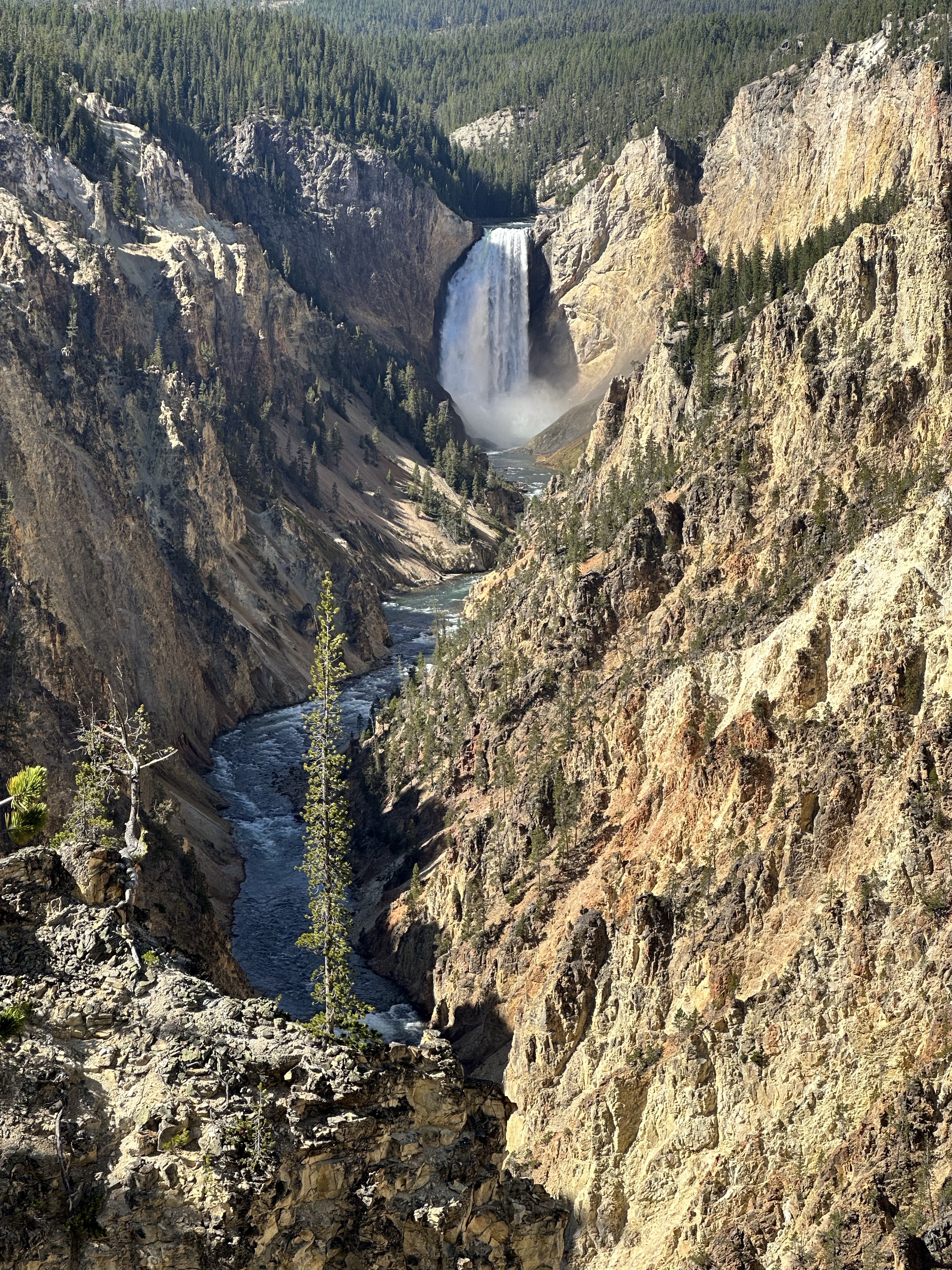 The best way to see places like Yellowstone is to set the alarm clock early and get out. Wildlife are more likely to be around at sunrise and dusk and the other wildlife known as tourists on buses are generally still asleep. The light is always spectacular too, if, like a certain person, taking photos is your thing. You’ll have to put up with my phone shots I’m afraid! Numerous stops on the way (took the van this time) we enjoyed Undine Falls, Floating Island Lake and Black Tail pond. The Lamar River Valley though was where it was at for the wildlife though. We had Bison scattered everywhere, young and old; Coyote; bald eagles; Elk; Deer and amazingly a grey wolf. I was amused by the Raven who’d been released on remand from somewhere… tagged, while we were in a roadworks queue!