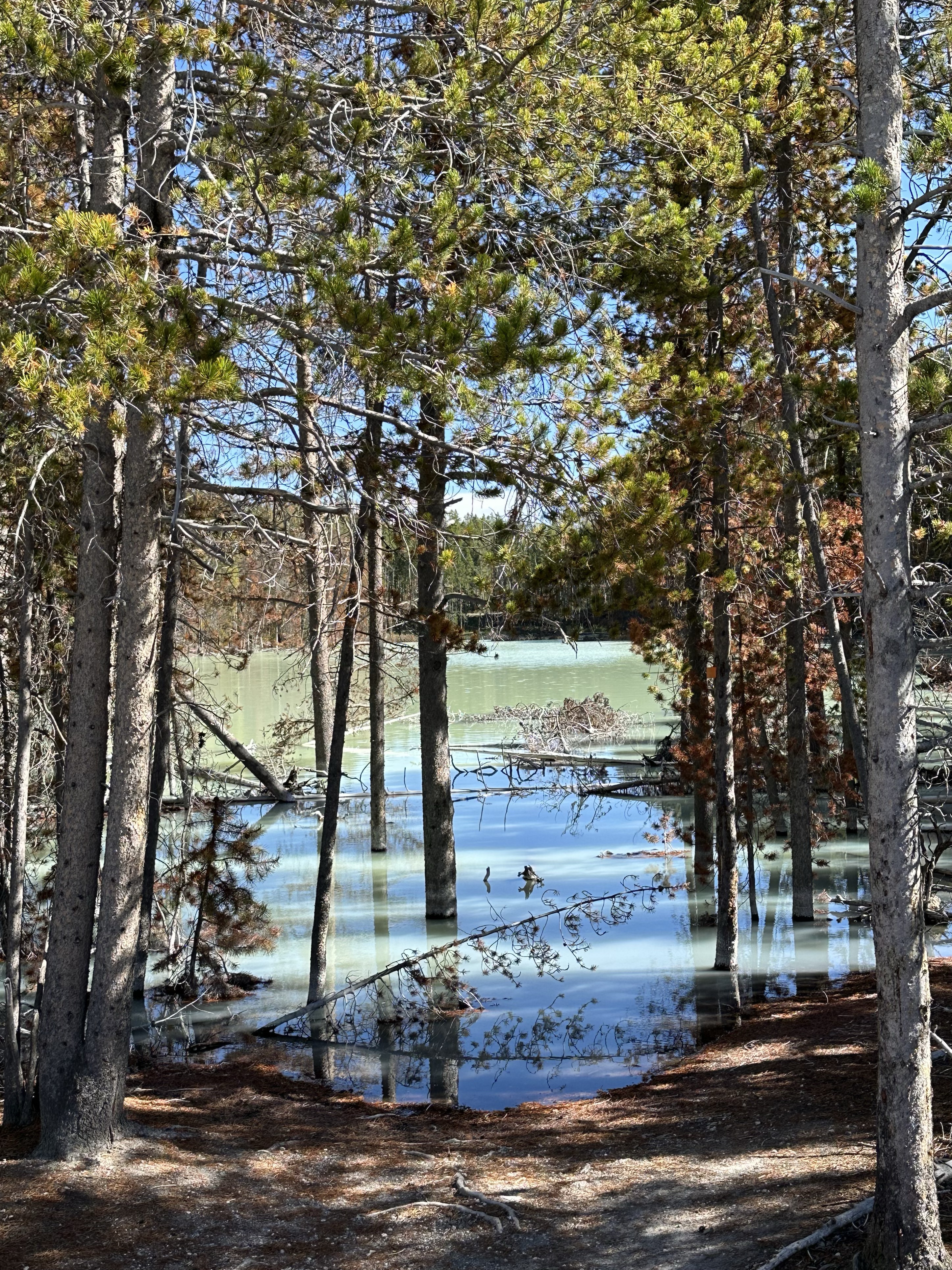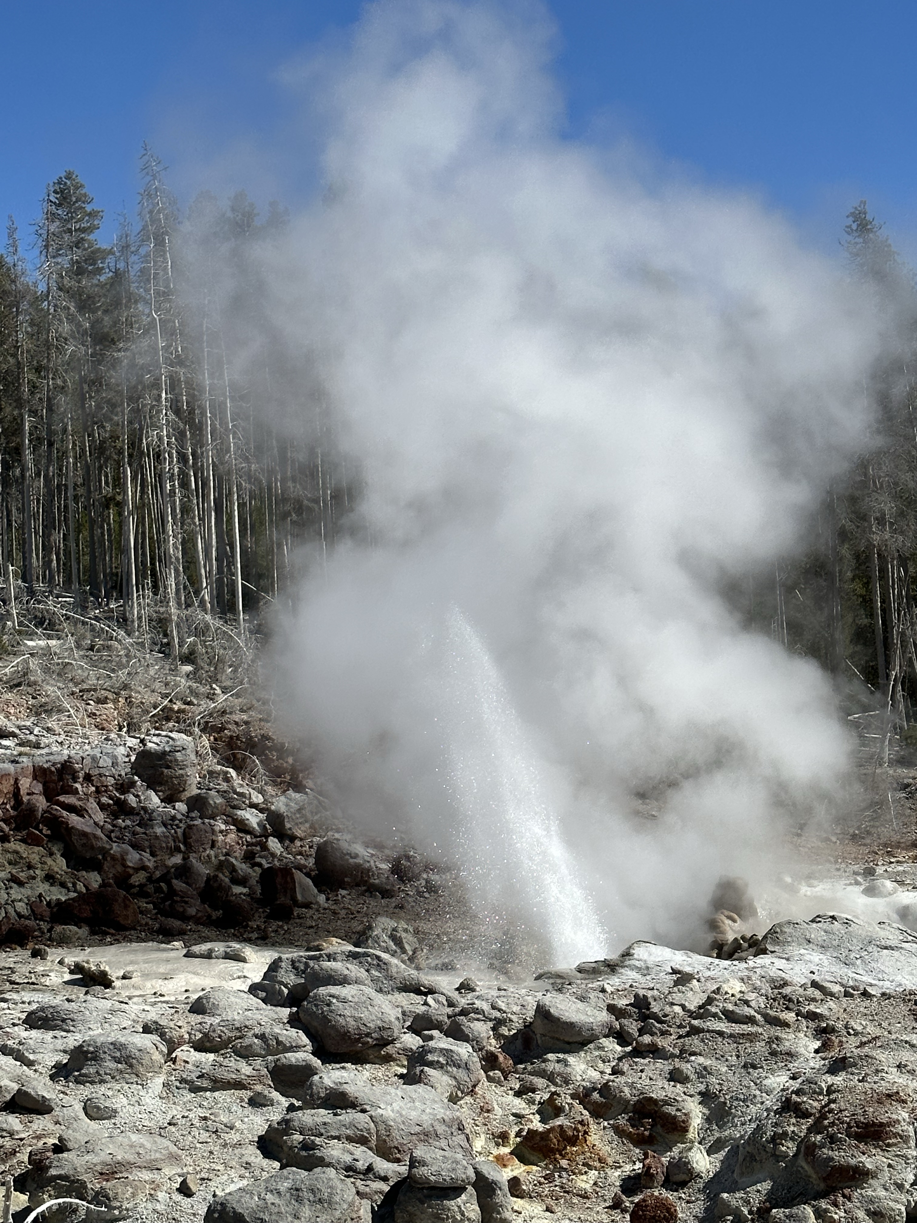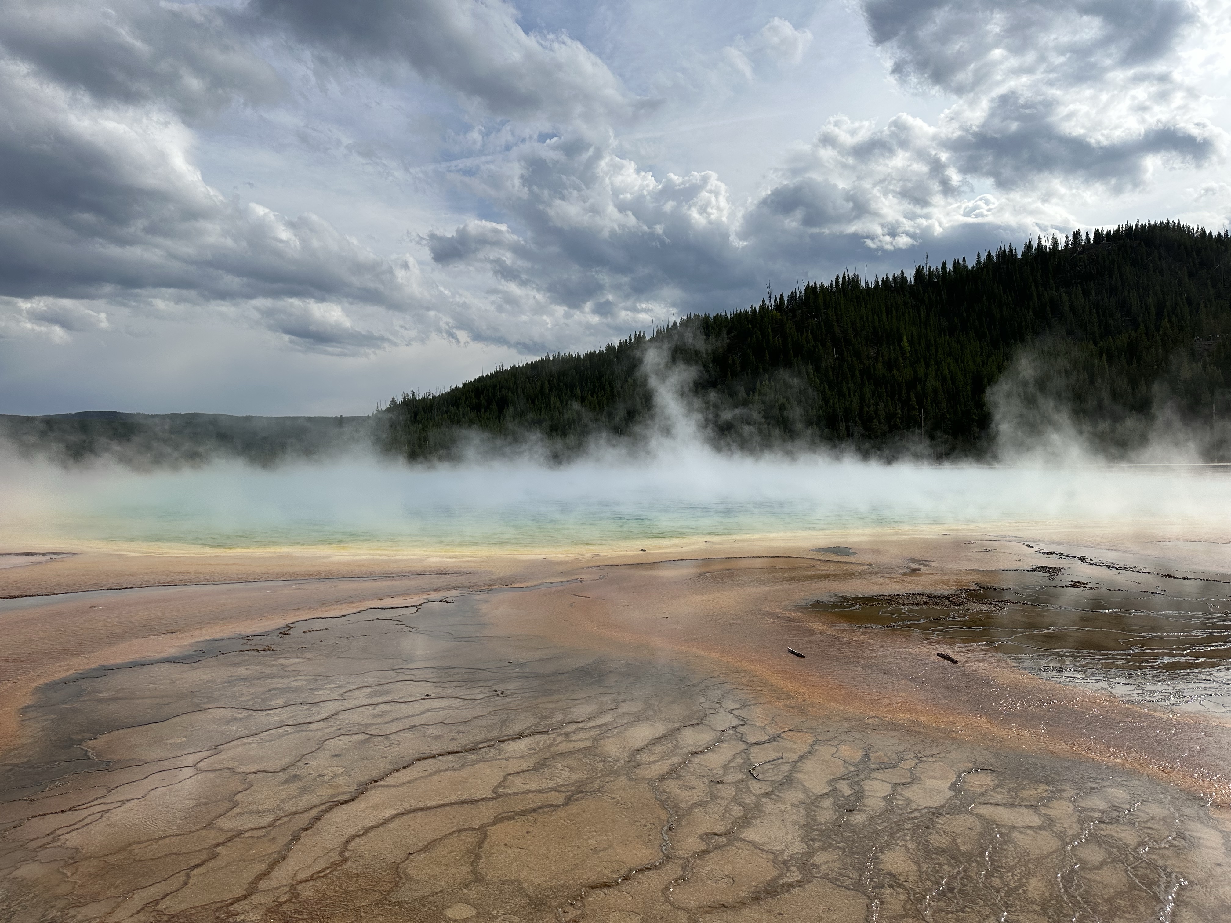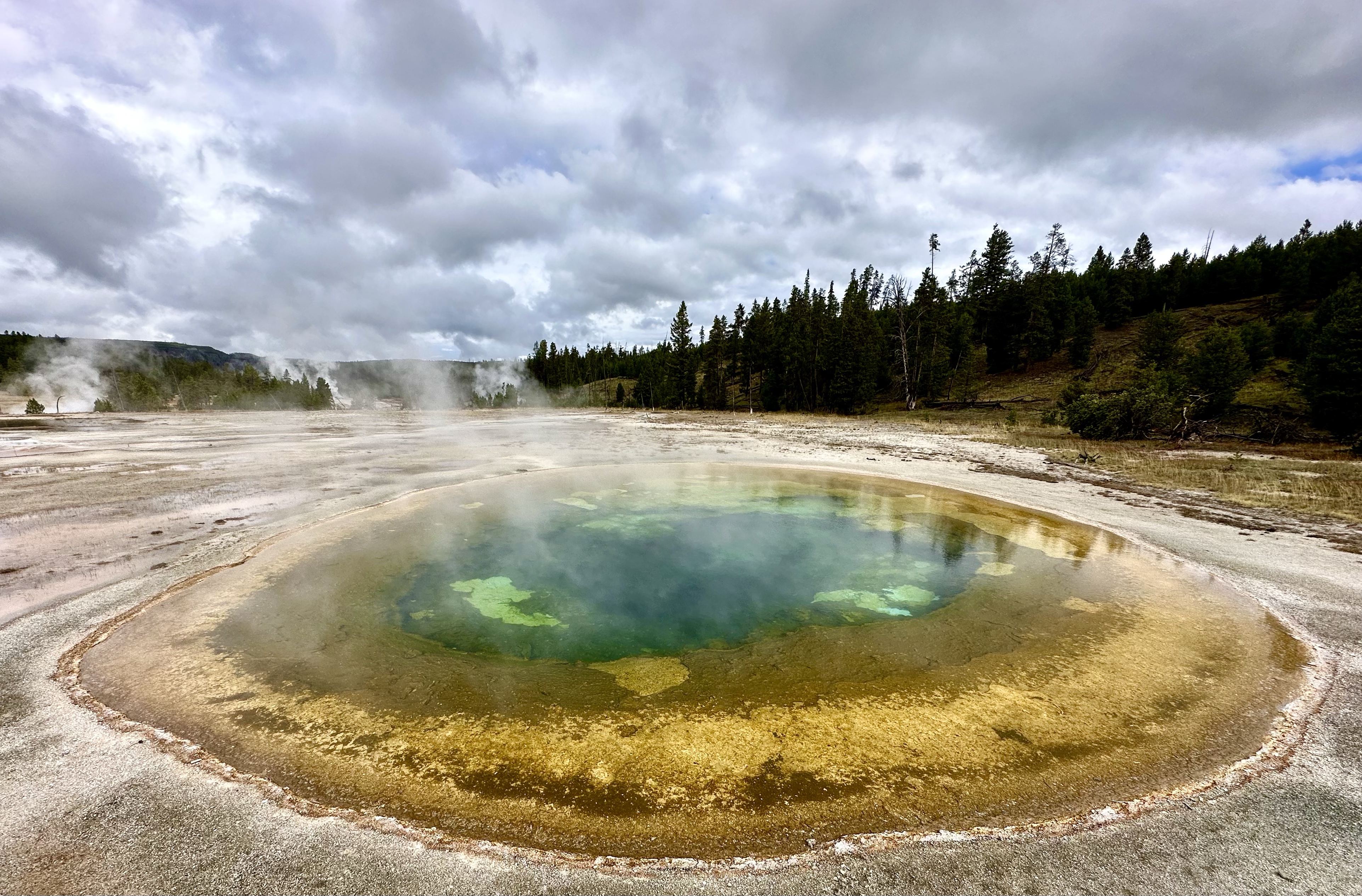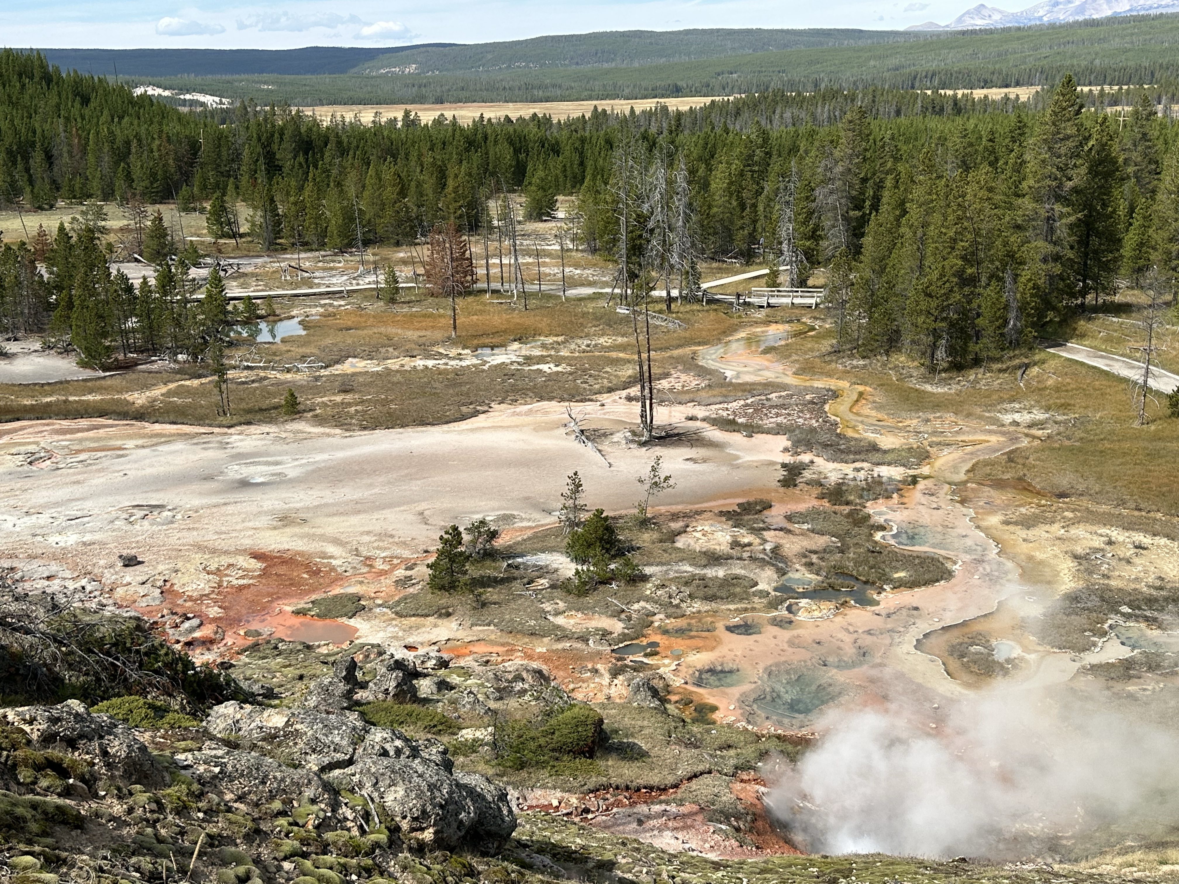 The Norris Geyser Basin is a different experience again. A boardwalk trail through trees and it opens up an interconnected steaming delta effect with colourful pools, bubbling and steaming fumeroles and pots. A magical place, shimmering waters and a colour palette Mondrian would have killed for! The still waters at times looked like poured coloured resin. Various levels of alkaline and acidity in the volcano heated waters, combining with different minerals lead to the creation of spectacular vistas.