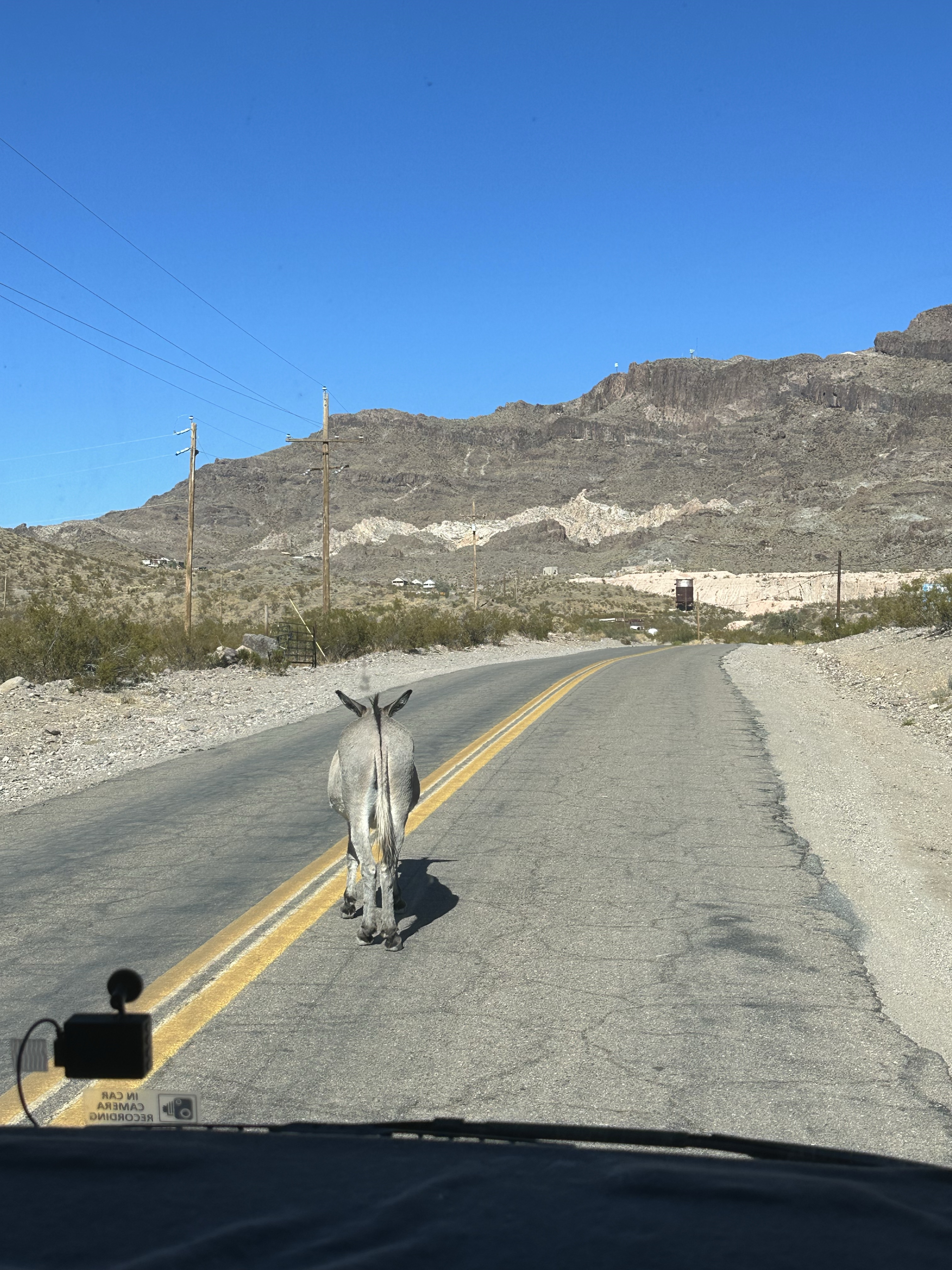 We saw a belligerent ass in the road, no it wasn’t Trump but a burro! This stubborn ‘ole mule wasn’t interested in changing direction any time soon… 😉 We were close to a Route 66 heyday town called Oatman on the ‘Oatman Topeka Highway’, which took us through mountains and desert plains, dry as they come, with the most evil cacti in the world, Cholla, everywhere. (you only need to look at them and they spike you, it hurts, believe me!) Typically, they are really attractive yellow flowered!