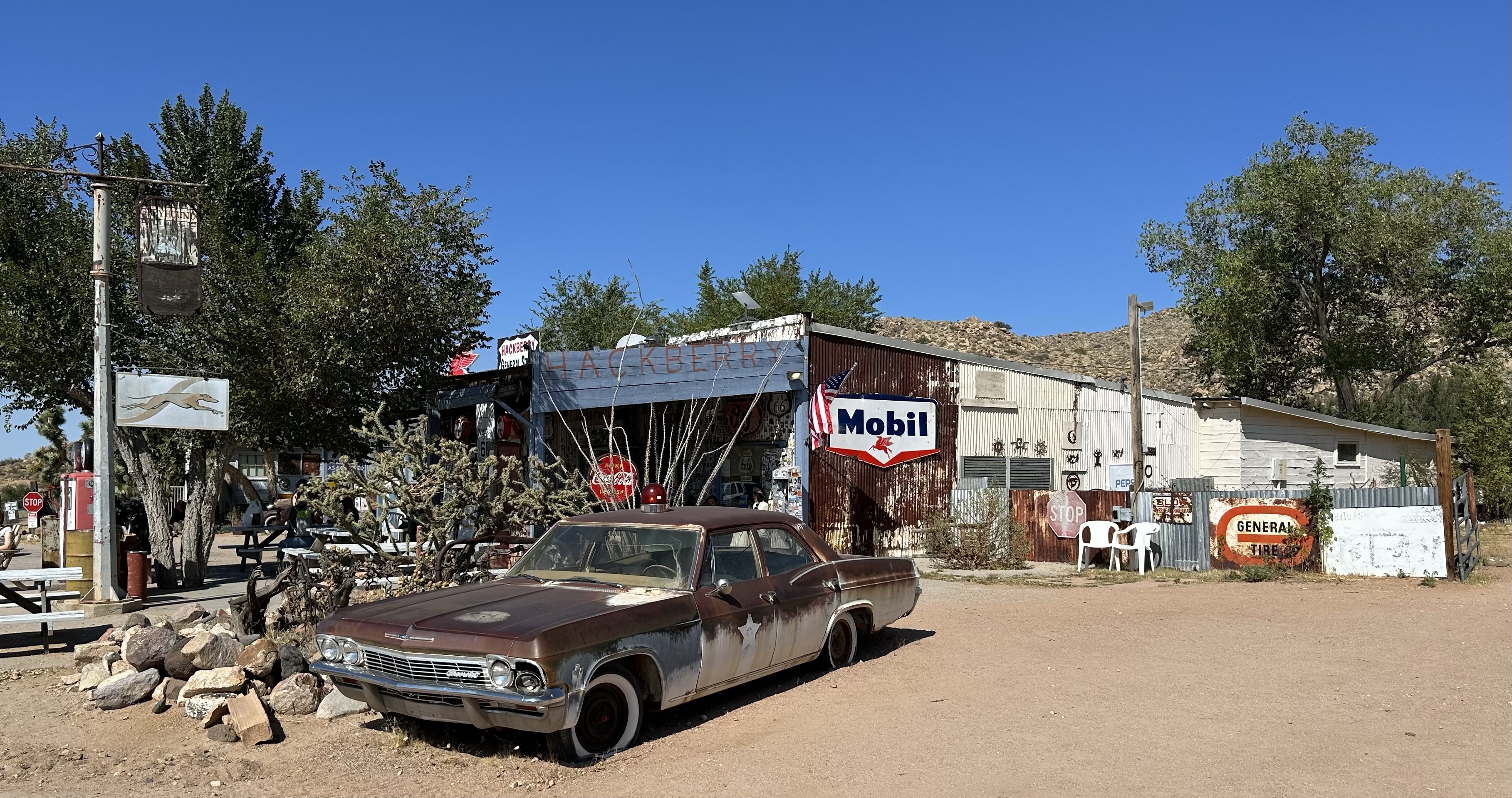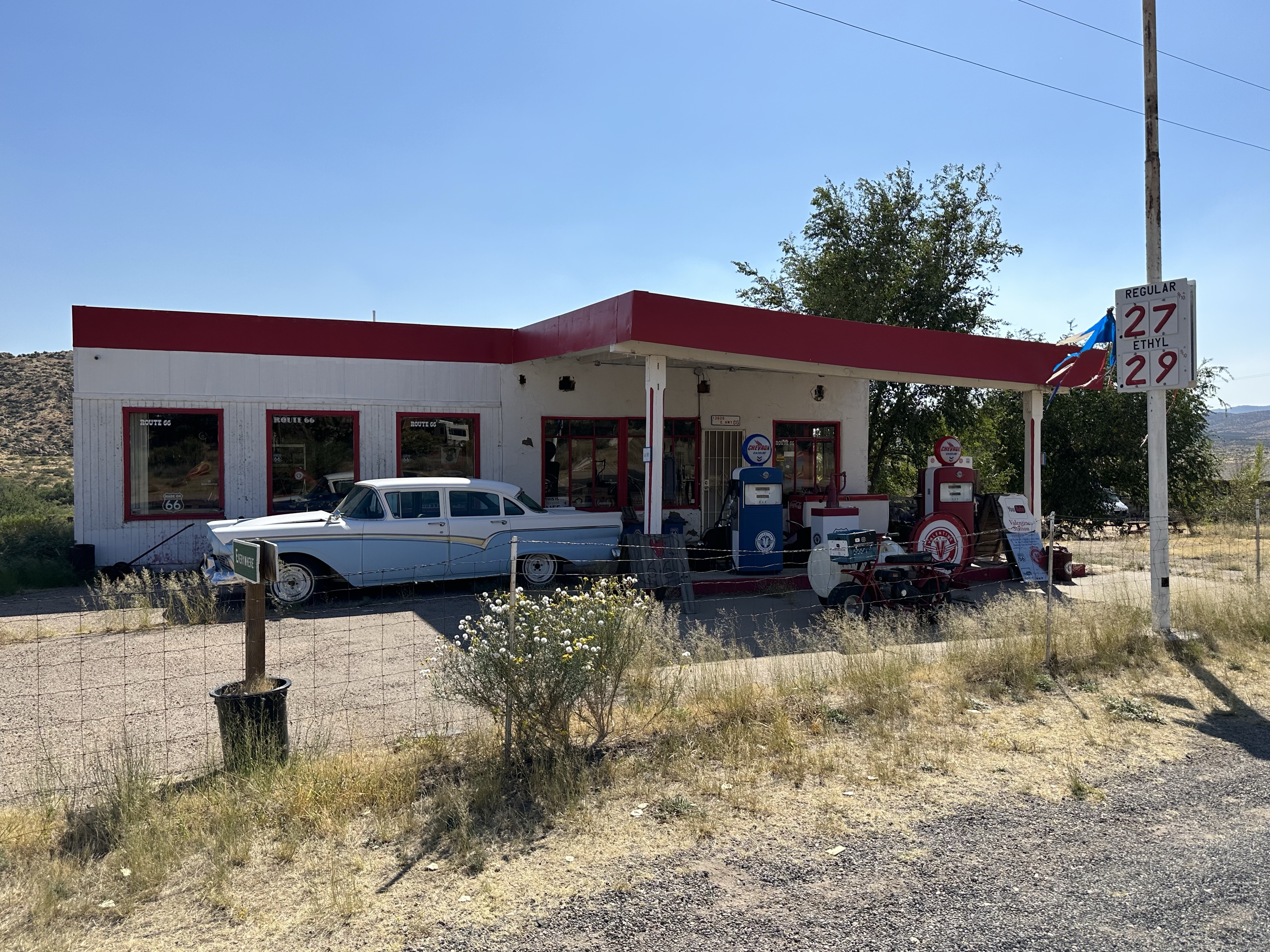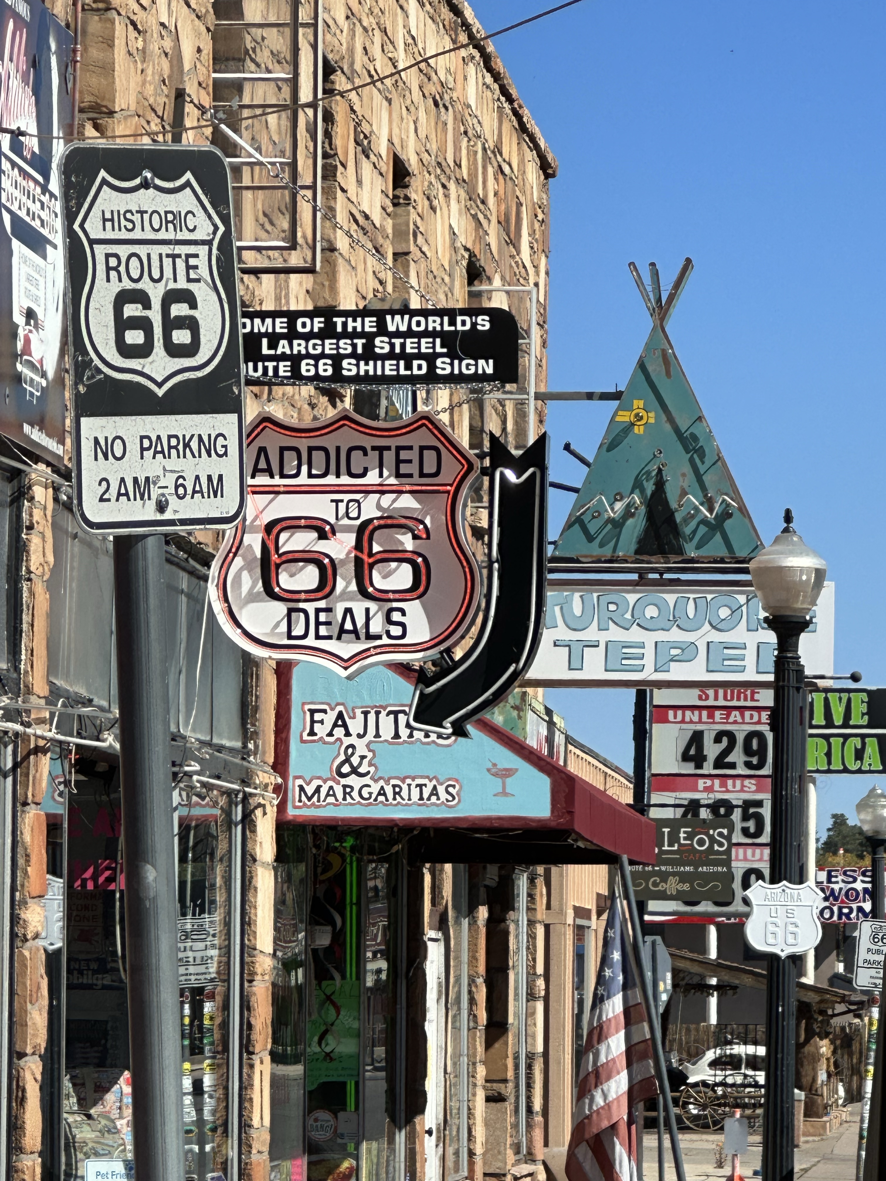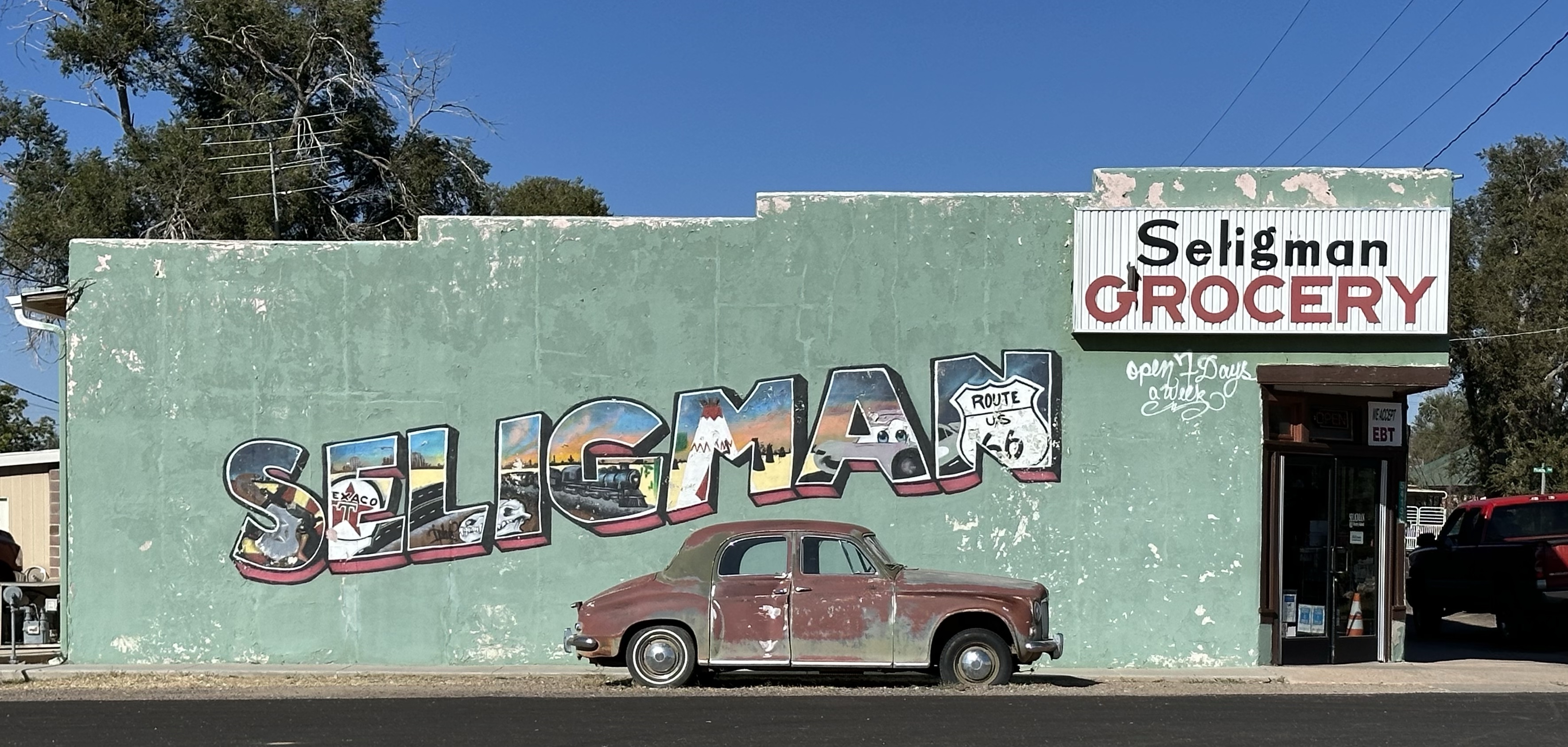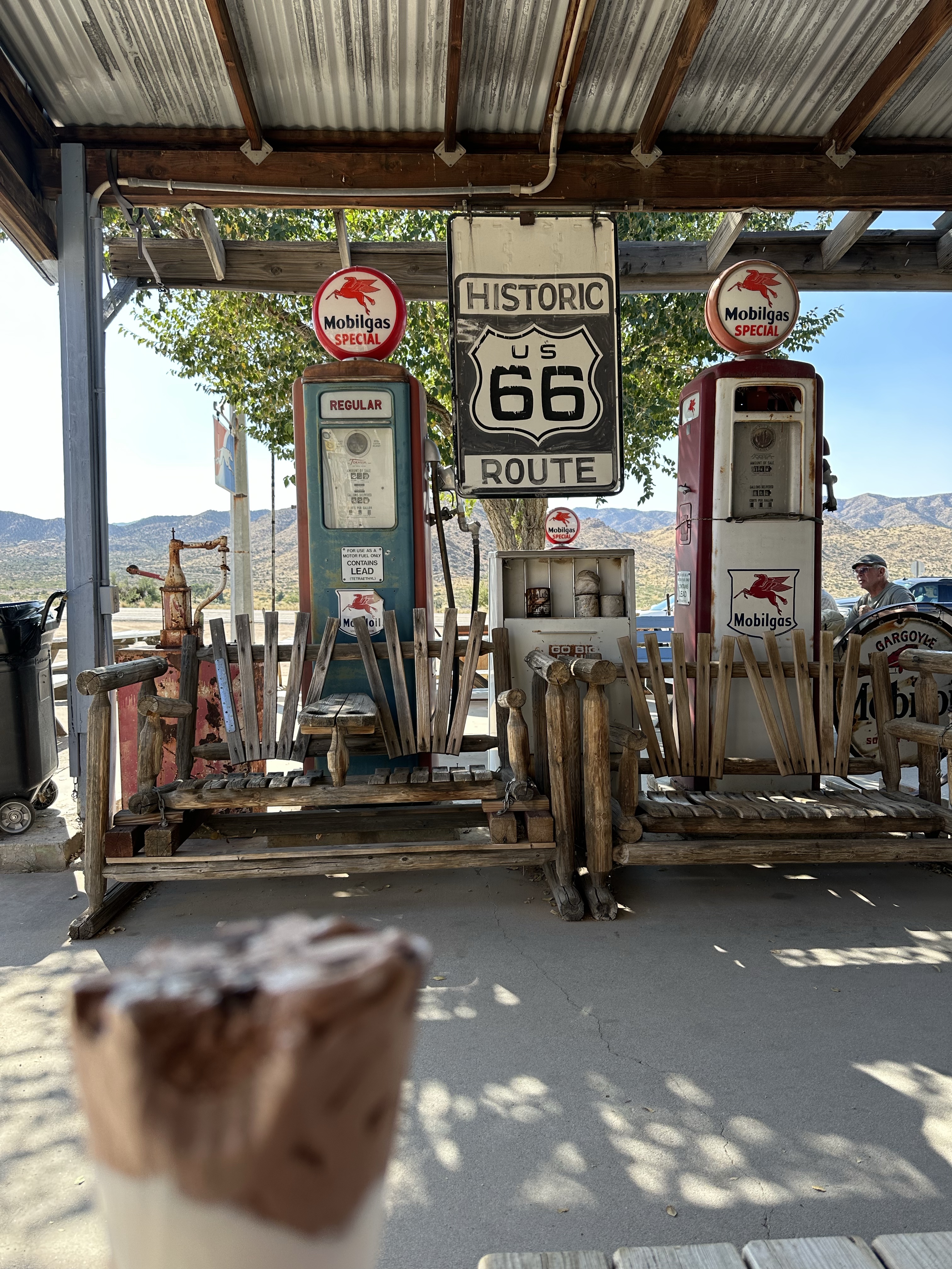 Continuing east on route 66 the drive there was much the same however there are a few iconic features on the way. Hackberry General Store was thriving on tourists passing by. A front yard full of ‘memorabilia’ be it abandoned cars, gas pumps, signs etc, it has that kind of ‘pull off the highway’ draw that is as successful now as it would have been in the 66 heyday. Of course, the store has lots of Route 66 merchandise, as does every place we stop! Further along is Seligman, hanging on by a thread, thankfully for the town, just off an I40 junction. Very different vibe to previous stops, possibly due to the local militia hanging out at their local (with ‘statement’ sign) who keep the Walmart gun sales going, no doubt. There were lots of great old signs and buildings in Seligman but we do wonder what’d happen if the tour busses stop dropping by the few tat shops that are there.